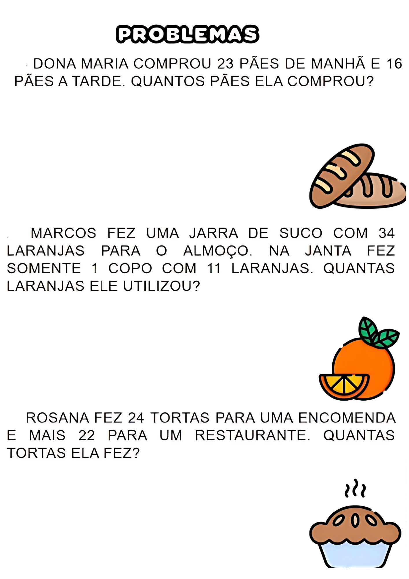 PROBLEMAS DONA MARIA COMPROU 23 PÃES DE MANHÃ E 16 PÃES A TARDE. QUANTOS PÃES ELA COMPROU? MARCOS FEZ UMA JARRA DE SUCO COM 34 LARANJAS PARA ALMOÇO. NA JANTA FEZ SOMENTE 1 COPO COM 11 LARANJAS. QUANTAS LARANJAS ELE UTILIZOU? ROSANA FEZ 24 TORTAS PARA UMA ENCOMENDA E MAIS 22 PARA UM RESTAURANTE QUANTAS TORTAS ELA FEZ?