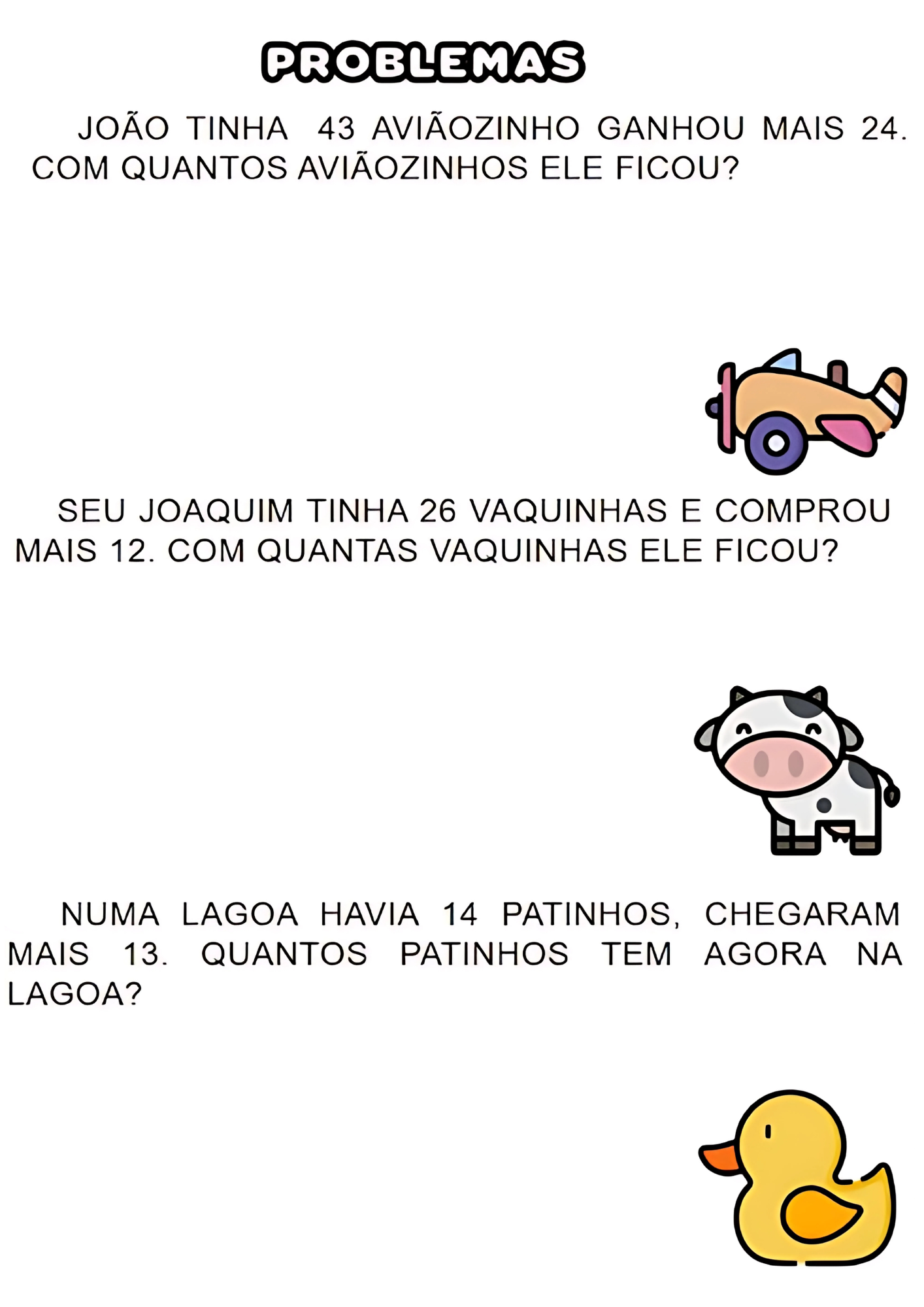 PROBLEMAS JOÃO TINHA 43 AVIÃOZINHO GANHOU MAIS 24. COM QUANTOS AVIÃOZINHOS ELE FICOU? SEU JOAQUIM TINHA 26 VAQUINHAS E COMPROU MAIS 12. COM QUANTAS VAQUINHAS ELE FICOU? NUMA LAGOA HAVIA 14 PATINHOS, CHEGARAM MAIS 13. QUANTOS PATINHOS TEM AGORA NA LAGOA?