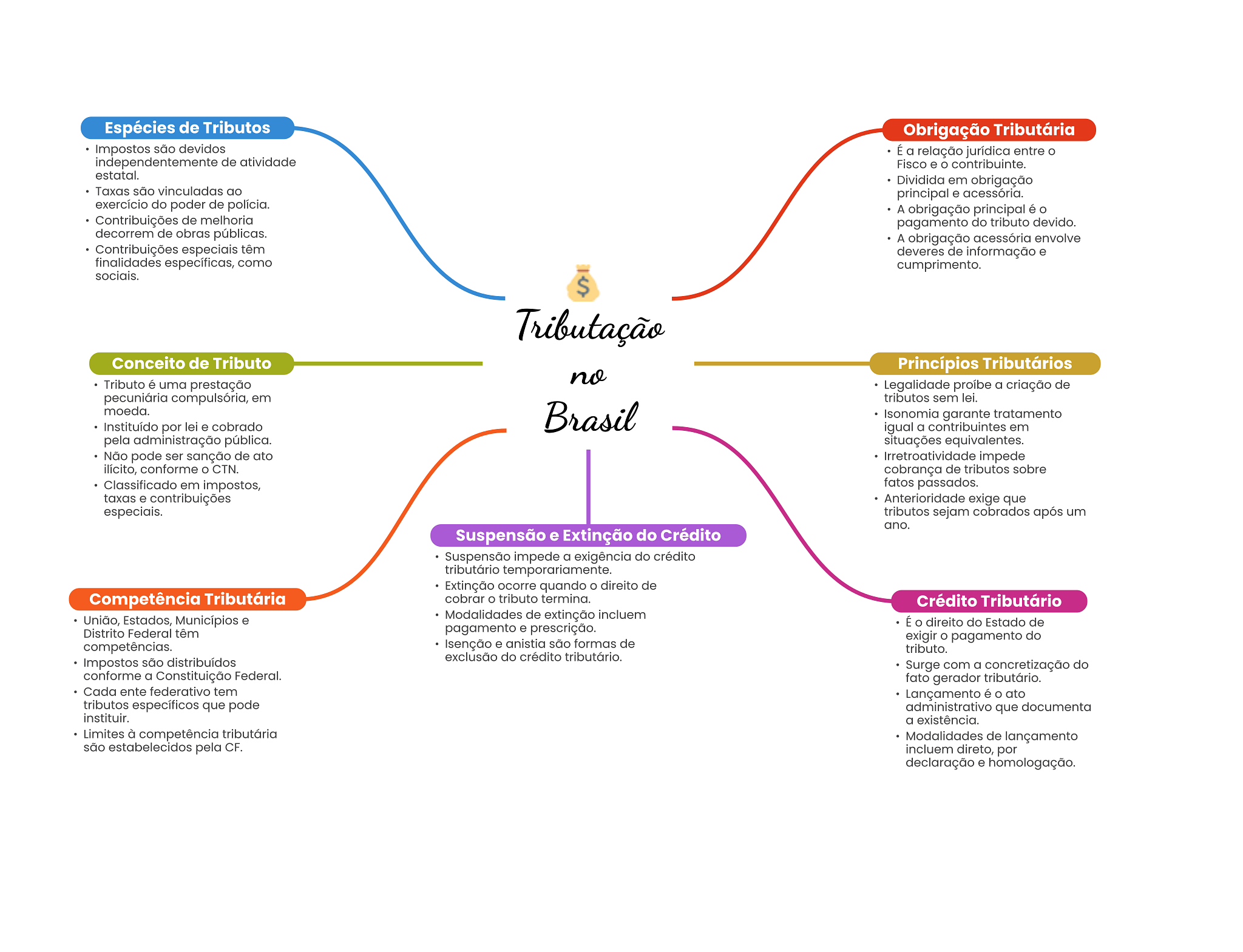 Espécies de Tributos Obrigação Tributária Impostos são devidos É a relação jurídica entre de atividade Fisco e contribuinte. estatal. Dividida em obrigação Taxas são vinculadas ao principal e acessória. exercício do poder de polícia. A obrigação principal é Contribuições de melhoria pagamento do tributo devido. decorrem de obras públicas. A obrigação acessória envolve Contribuições especiais têm deveres de informação e finalidades específicas, como cumprimento. sociais. $ Tributação Conceito de Tributo Princípios Tributários no Tributo é uma prestação Legalidade proíbe a criação de pecuniária compulsória, em tributos sem lei. moeda. Brasil Isonomia garante tratamento Instituído por lei e cobrado igual a contribuintes em pela administração pública. situações equivalentes. Não pode ser sanção de ato Irretroatividade impede ilícito, conforme CTN. cobrança de tributos sobre Classificado em impostos, fatos passados. taxas e contribuições Anterioridade exige que especiais. tributos sejam cobrados após um ano. Suspensão e Extinção do Crédito Suspensão impede a exigência do crédito tributário temporariamente. Extinção ocorre quando O direito de Competência Tributária cobrar tributo termina. Crédito Tributário União, Estados, Municípios e Modalidades de extinção incluem É O direito do Estado de Distrito Federal têm pagamento e prescrição. exigir pagamento do competências. Isenção e anistia são formas de tributo. exclusão do crédito tributário. Impostos são distribuídos Surge com a concretização do conforme a Constituição Federal. fato gerador tributário. Cada ente federativo tem Lançamento é ato tributos específicos que pode administrativo que documenta instituir. a existência. Limites à competência tributária Modalidades de lançamento são estabelecidos pela CF. incluem direto, por declaração e homologação.