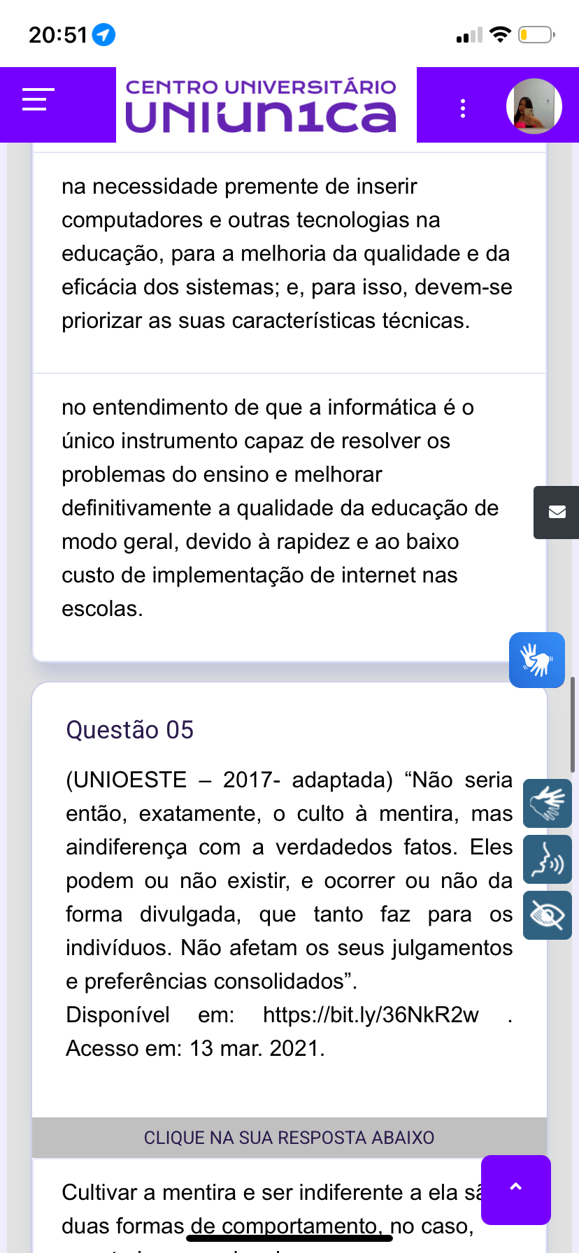20:51 CENTRO UNIVERSITÁRIO na necessidade premente de inserir computadores e outras tecnologias na educação, para a melhoria da qualidade e da eficácia dos sistemas; e, para isso, devem-se priorizar as suas características técnicas. no entendimento de que a informática é o único instrumento capaz de resolver os problemas do ensino e melhorar definitivamente a qualidade da educação de modo geral, devido à rapidez e ao baixo custo de implementação de internet nas escolas. Questão 05 (UNIOESTE - 2017- adaptada) "Não seria então, exatamente, o culto à mentira, mas aindiferença com a verdadedos fatos. Eles podem ou não existir, e ocorrer ou não da forma divulgada, que tanto faz para os indivíduos. Não afetam os seus julgamentos e preferências consolidados". Disponível em: https://bit.ly/36NkR2w Acesso em: 13 mar. 2021. CLIQUE NA SUA RESPOSTA ABAIXO Cultivar a mentira e ser indiferente a ela duas formas de comportamento, no caso,