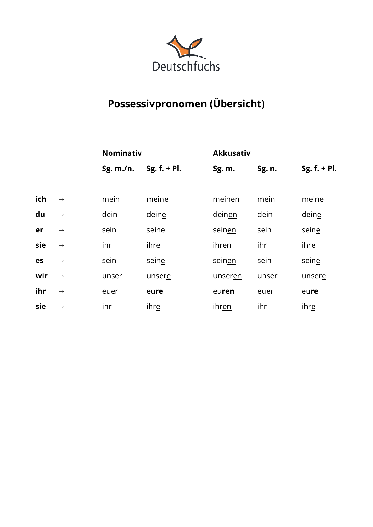 25801-236996-1771342647 Lektion: 43, Seite: 1 / 1 © Deutschfuchs - Nachdruck und Vervielfältigung nur mit gültiger Lizenz erlaubt. Possessivpronomen (Übersicht) Nominativ Akkusativ Sg. m./n. Sg. f. + Pl. Sg. m. Sg. n. Sg. f. + Pl. ich → mein meine meinen mein meine du → dein deine deinen dein deine er → sein seine seinen sein seine sie → ihr ihre ihren ihr ihre es → sein seine seinen sein seine wir → unser unsere unseren unser unsere ihr → euer eure euren euer eure sie → ihr ihre ihren ihr ihre