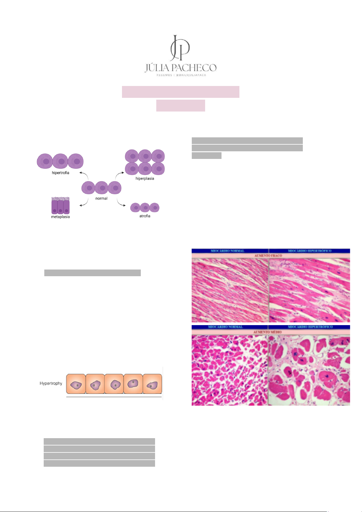 Adaptações celulares e neoplasia As adaptações celulares são mudanças reversíveis no tamanho, número, fenótipo, atividade metabólica ou funções das células em resposta a alterações em seu ambiente. Pode ser fisiológico ou patológico Hipertrofia Refere-se ao aumento do tamanho das células, o que resulta no aumento do tamanho do órgão afetado. É importante notar que não há aumento no número de células, mesmo em células que são capazes de se dividir. Células Afetadas: Pode ocorrer em células lábeis, estáveis e permanentes. As células capazes de se dividir (lábeis e estáveis) podem sofrer hipertrofia, hiperplasia e metaplasia, enquanto as células que não se dividem (permanentes), como as do músculo cardíaco e neurônios, sofrem somente hipertrofia. Mecanismos: A hipertrofia é resultado do aumento na produção de proteínas celulares. Envolve sensores mecânicos que detectam o aumento da carga, ativando vias de sinalização como PI3K/AKT (fisiológica) e vias acopladas à proteína G (patológica), que estimulam a produção de fatores de crescimento e agentes vasoativos. Estímulos Hormonais Específicos: Aumento dos níveis de estrogênio pode levar tanto à hiperplasia quanto à hipertrofia (Ex: crescimento fisiológico do útero na gravidez). Adaptações celulares e neoplasia A hipertrofia das células musculares lisas do miométrio é estimulada pelo estrogênio, levando ao aumento na síntese de proteínas e no tamanho das células Hiperplasia Refere-se ao aumento no número de células em um órgão ou tecido em resposta a um estímulo. Envolve a divisão celular e, por isso, só ocorre em células capazes de sintetizar DNA Células Afetadas: Ocorre em células lábeis e estáveis. Tipos: Pode ser fisiológica ou patológica. Hiperplasia típica: NÃO possui displasia Pode ser dividida em: ➔ Simples: Progressão para neoplasia em cerca de 1% dos casos. ➔ Complexa: Progressão para neoplasia emcerca de 3% dos casos. Hiperplasia atípica: Possui displasia. Esta variedade é precursora do câncer endometrial. Também considerada neoplasia intraepitelial endometrial ➔ Simples: Probabilidade de transformação maligna é de 8% ➔ Complexa: O risco aumenta para 29%. Mecanismos: A proliferação celular é controlada por fatores de crescimento e pelo desenvolvimento de células maduras a partir de células-tronco, sendo dependente da integridade da matriz extracelular (MEC). A irritação crônica pode promover a reprogramação de células-tronco adultas para seguir uma nova linha de diferenciação celular. Importância: A hiperplasia pode ser uma lesão cancerizável (pré-neoplásica). Metaplasia Uma mudança no fenótipo de células diferenciadas, onde um tipo celular é substituído por outro. Causas: Geralmente ocorre em resposta à irritação crônica, tornando as células mais aptas a resistir ao estresse. Mecanismos: É geralmente induzida por uma alteração na via de diferenciação das células-tronco Exemplos: Esôfago de Barrett: O epitélio escamoso estratificado normal do esôfago é substituído por um epitélio colunar, similar ao do intestino delgado (metaplasia intestinal), como resposta adaptativa a danos crônicos causados por refluxo ácido. Adaptações celulares e neoplasia Epitélio brônquico: Em tabagistas crônicos, a metaplasia escamosa do epitélio brônquico é um prelúdio frequente para o câncer de pulmão. Importância: Embora seja uma adaptação, a metaplasia pode resultar em diminuição das Atrofia Uma diminuição do tamanho das células e dos órgãos. Causas: Consequência de uma redução do fornecimento de nutrientes ou desuso. Mecanismos: Associada a uma diminuição da síntese dos componentes estruturais das células e ao aumento da degradação das organelas celulares por autofagia aumentada. A autofagia é um processo de "canibalização" celular para produção de energia em deficiência de nutrientes. Proliferação celular A proliferação celular é o processo pelo qual uma célula se divide e origina células-filhas. Esse fenômeno é essencial para: ➔ Desenvolvimento embrionário ➔ Crescimento corporal ➔ Reparação de tecidos (ex: cicatrização) ➔ Manutenção da homeostase tecidual É um processo altamente regulado e dependente da integridade da matriz extracelular (MEC). A diferenciação celular, por sua vez, é o mecanismo pelo qual células se especializam em funções específicas. Ambas são controladas por sinais moleculares internos e externos, mantendo o equilíbrio da população celular. Fatores que regulam a proliferação ➔ Fatores de crescimento (ex: EGF, VEGF, FGF) ➔ Interações célula-célula ➔ Sinais da MEC ➔ Estado metabólico da célula ➔ Integridade do DNA (checkpoints) Adaptações celulares e neoplasia Consequências da Desregulação Distúrbios nesse sistema regulatório podem gerar: ➔ Hiperplasia: aumento do número de células ➔ Displasia: crescimento celular desordenado ➔ Neoplasias: crescimento descontrolado (tumores benignos ou malignos) Exemplo clínico: Câncer = proliferação descontrolada + falhas nos mecanismos de reparo e morte celular programada (apoptose). Atividade Proliferativa dos Tecidos A atividade proliferativa varia entre diferentes tecidos, classificados em: Lábil: Alta renovação contínua ex: Epitélio intestinal, medula óssea Estável: Quiescente, mas capaz de proliferação quando estimulado ex: Fígado, endotélio vascular Permanente: Não prolifera após o desenvolvimento ex: Neurônios, miócitos cardíacos Elementos que regulam essa atividade: ➔ Taxa de proliferação ➔ Morte celular ➔ Diferenciação ➔ Fatores de crescimento São polipeptídeos que atuam como ligantes para receptores específicos. Ex: EGF (fator de crescimento epidérmico), VEGF (angiogênese), TGF-β (regulador de crescimento). MEC (Matriz Extracelular) Estrutura complexa com: ➔ Proteínas estruturais: colágeno, elastina 