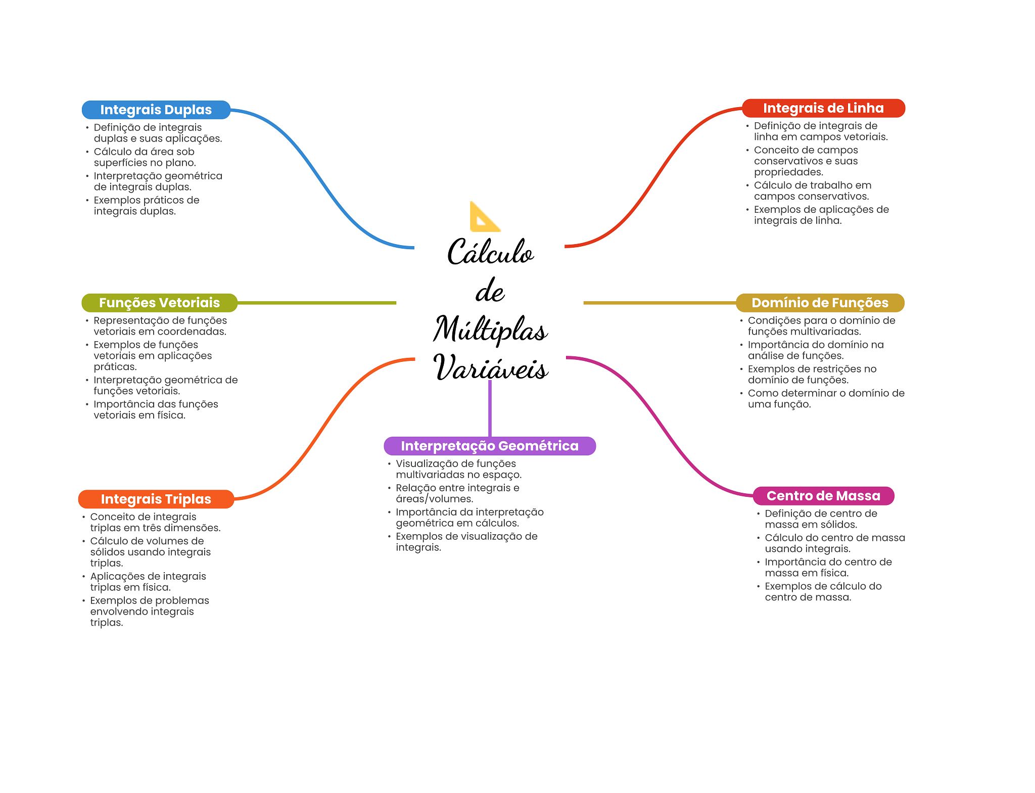 Integrais Duplas Integrais de Linha Definição de integrais Definição de integrais de duplas e suas aplicações. linha em campos vetoriais. Cálculo da área sob Conceito de campos superfícies no plano. conservativos e suas Interpretação geométrica propriedades. de integrais duplas. Cálculo de trabalho em Exemplos práticos de campos conservativos. integrais duplas. Exemplos de aplicações de integrais de linha. Cálculo de Funções Vetoriais Domínio de Funções Representação de funções Múltiplas Condições para domínio de vetoriais em coordenadas. funções multivariadas. Exemplos de funções Importância do domínio na vetoriais em aplicações práticas. Variáveis análise de funções. Exemplos de restrições no Interpretação geométrica de domínio de funções. funções vetoriais. Como determinar O domínio de Importância das funções uma função. vetoriais em física. Interpretação Geométrica Visualização de funções multivariadas no espaço. Relação entre integrais e Integrais Triplas áreas/volumes. Centro de Massa Conceito de integrais Importância da interpretação Definição de centro de triplas em três dimensões. geométrica em cálculos. massa em sólidos. Cálculo de volumes de Exemplos de visualização de Cálculo do centro de massa sólidos usando integrais integrais. usando integrais. triplas. Importância do centro de Aplicações de integrais massa em física. triplas em física. Exemplos de cálculo do Exemplos de problemas centro de massa. envolvendo integrais triplas.