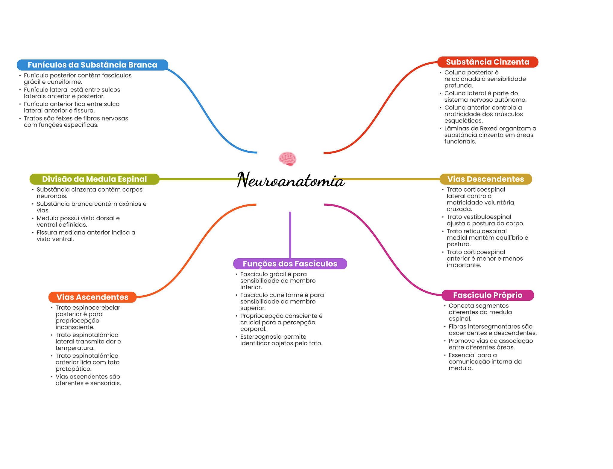 Funículos da Substância Branca Substância Cinzenta Funículo posterior contém fascículos Coluna posterior é relacionada à sensibilidade grácil e cuneiforme. profunda. Funículo lateral está entre sulcos laterais anterior e posterior. Coluna lateral é parte do sistema nervoso autônomo. Funículo anterior fica entre sulco Coluna anterior controla a lateral anterior e fissura. motricidade dos músculos Tratos são feixes de fibras nervosas esqueléticos. com funções específicas. Lâminas de Rexed organizam a substância cinzenta em áreas funcionais. Divisão da Medula Espinal Neuroanatomia Vias Descendentes Substância cinzenta contém corpos Trato corticoespinal neuronais. lateral controla Substância branca contém axônios e motricidade voluntária vias. cruzada. Medula possui vista dorsal e Trato vestibuloespinal ventral definidas. ajusta a postura do corpo. Fissura mediana anterior indica a Trato reticuloespinal vista ventral. medial mantém equilíbrio e postura. Trato corticoespinal anterior é menor e menos Funções dos Fascículos importante. Fascículo grácil é para sensibilidade do membro inferior. Vias Ascendentes Fascículo cuneiforme é para Fascículo Próprio sensibilidade do membro Trato espinocerebelar superior. Conecta segmentos posterior é para diferentes da medula Propriocepção consciente é propriocepção espinal. crucial para a percepção inconsciente. corporal. Fibras intersegmentares são Trato espinotalâmico ascendentes e descendentes. Estereognosia permite lateral transmite dor e identificar objetos pelo tato. Promove vias de associação temperatura. entre diferentes áreas. Trato espinotalâmico Essencial para a anterior lida com tato comunicação interna da protopático. medula. Vias ascendentes são aferentes e sensoriais.