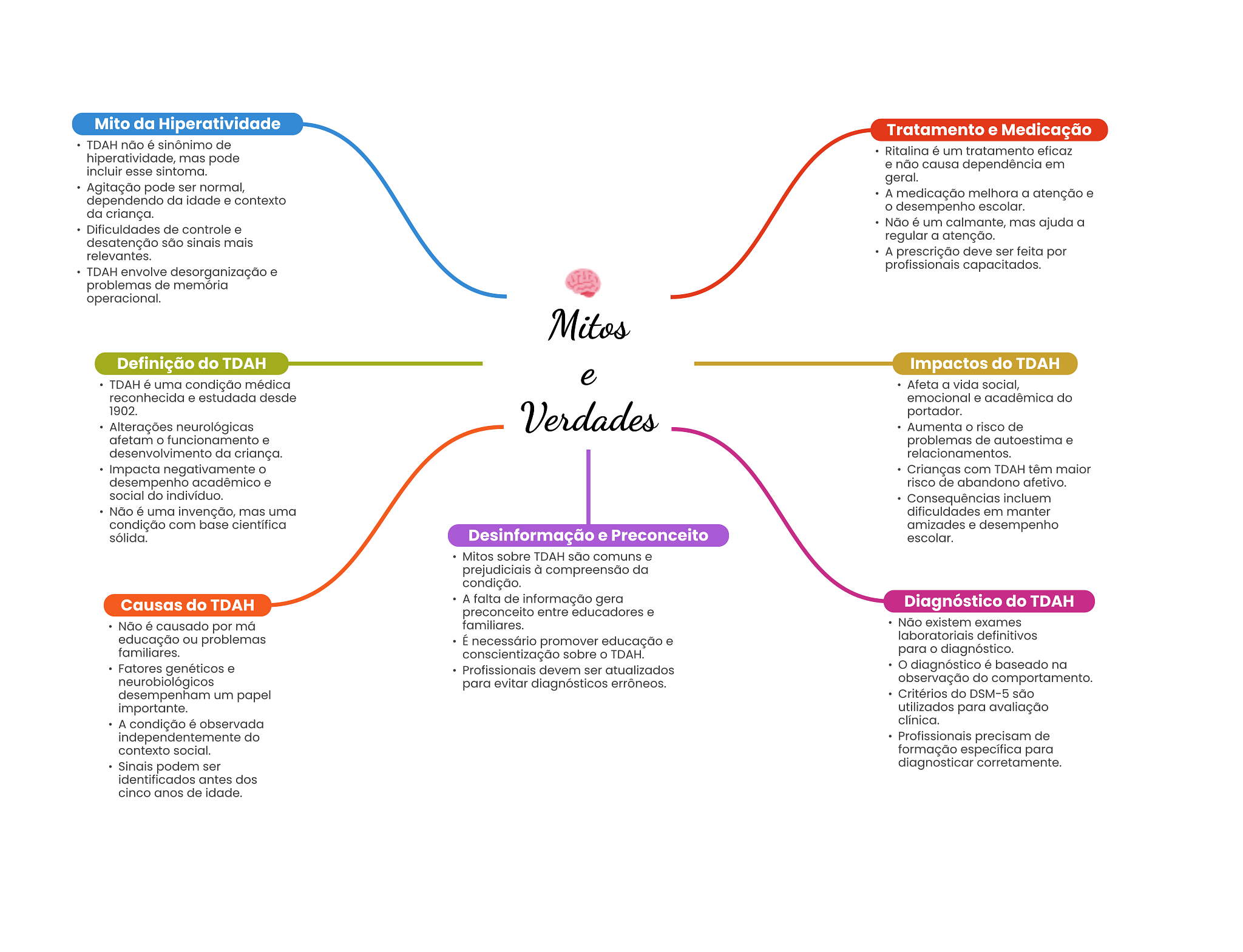 Mito da Hiperatividade Tratamento e Medicação TDAH não é sinônimo de Ritalina é um tratamento eficaz hiperatividade, mas pode incluir esse sintoma. e não causa dependência em geral. Agitação pode ser normal, dependendo da idade e contexto A medicação melhora a atenção e desempenho escolar. da criança. Dificuldades de controle e Não é um calmante, mas ajuda a desatenção são sinais mais regular a atenção. relevantes. A prescrição deve ser feita por TDAH envolve desorganização e profissionais capacitados. problemas de memória operacional. Mitos Definição do TDAH Impactos do TDAH e TDAH é uma condição médica Afeta a vida social, reconhecida e estudada desde emocional e acadêmica do 1902. Alterações neurológicas Verdades portador. Aumenta risco de afetam funcionamento e problemas de autoestima e desenvolvimento da criança. Impacta negativamente Crianças com TDAH têm maior desempenho acadêmico e risco de abandono afetivo. social do indivíduo. Consequências incluem Não é uma invenção, mas uma dificuldades em manter condição com base científica amizades e desempenho sólida. Desinformação e Preconceito escolar. Mitos sobre TDAH são comuns e prejudiciais à compreensão da condição. Causas do TDAH A falta de informação gera Diagnóstico do TDAH preconceito entre educadores e Não é causado por má familiares. Não existem exames educação ou problemas É necessário promover educação e laboratoriais definitivos familiares. conscientização sobre TDAH. para diagnóstico. Fatores genéticos e Profissionais devem ser atualizados diagnóstico é baseado na neurobiológicos para evitar diagnósticos errôneos. observação do comportamento. desempenham um papel Critérios do DSM-5 são importante. utilizados para avaliação A condição é observada clínica. do Profissionais precisam de contexto social. formação específica para Sinais podem ser diagnosticar corretamente. identificados antes dos cinco anos de idade.