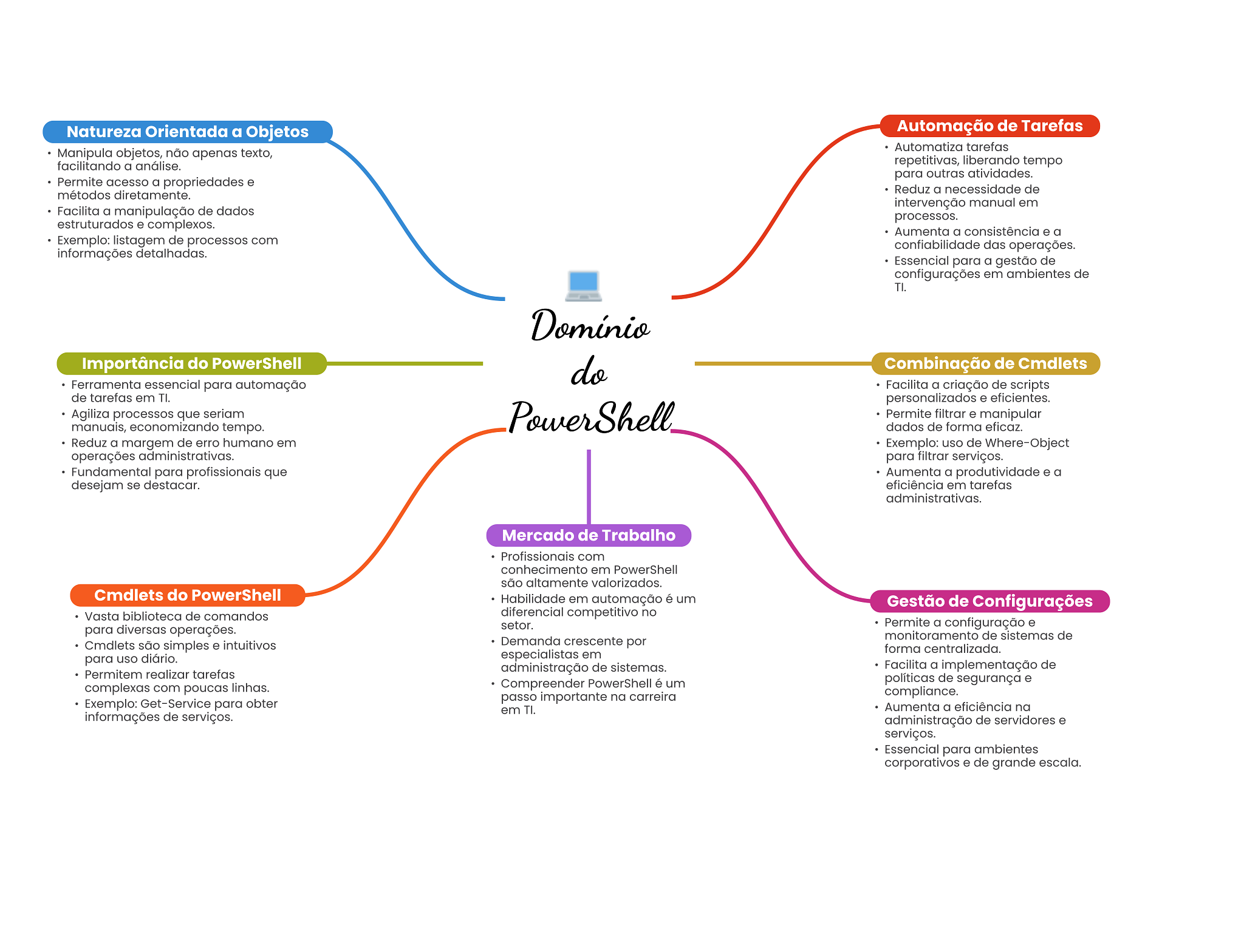 Natureza Orientada a Objetos Automação de Tarefas Automatiza tarefas Manipula objetos, não apenas texto, facilitando a análise. repetitivas, liberando tempo para outras atividades. Permite acesso a propriedades e Reduz a necessidade de métodos diretamente. intervenção manual em Facilita a manipulação de dados processos. estruturados e complexos. Aumenta a consistência e a Exemplo: listagem de processos com confiabilidade das operações. informações detalhadas. Essencial para a gestão de configurações em ambientes de TI. Importância do PowerShell do Combinação de Cmdlets Ferramenta essencial para automação Facilita a criação de scripts de tarefas em TI. personalizados e eficientes. Agiliza processos que seriam PowerShell Permite filtrar e manipular manuais, economizando tempo. dados de forma eficaz. Reduz a margem de erro humano em Exemplo: uso de Where-Object operações administrativas. para filtrar serviços. Fundamental para profissionais que Aumenta a produtividade e a desejam se destacar. eficiência em tarefas administrativas. Mercado de Trabalho Profissionais com conhecimento em PowerShell são altamente valorizados. Cmdlets do PowerShell Habilidade em automação é um Gestão de Configurações Vasta biblioteca de comandos diferencial competitivo no para diversas operações. setor. Permite a configuração e monitoramento de sistemas de Cmdlets são simples e intuitivos Demanda crescente por forma centralizada. para uso diário. especialistas em administração de sistemas. Facilita a implementação de Permitem realizar tarefas Compreender PowerShell é um políticas de segurança e complexas com poucas linhas. passo importante na carreira compliance. Exemplo: Get-Service para obter em TI. Aumenta a eficiência na informações de serviços. administração de servidores e serviços. Essencial para ambientes corporativos e de grande escala.