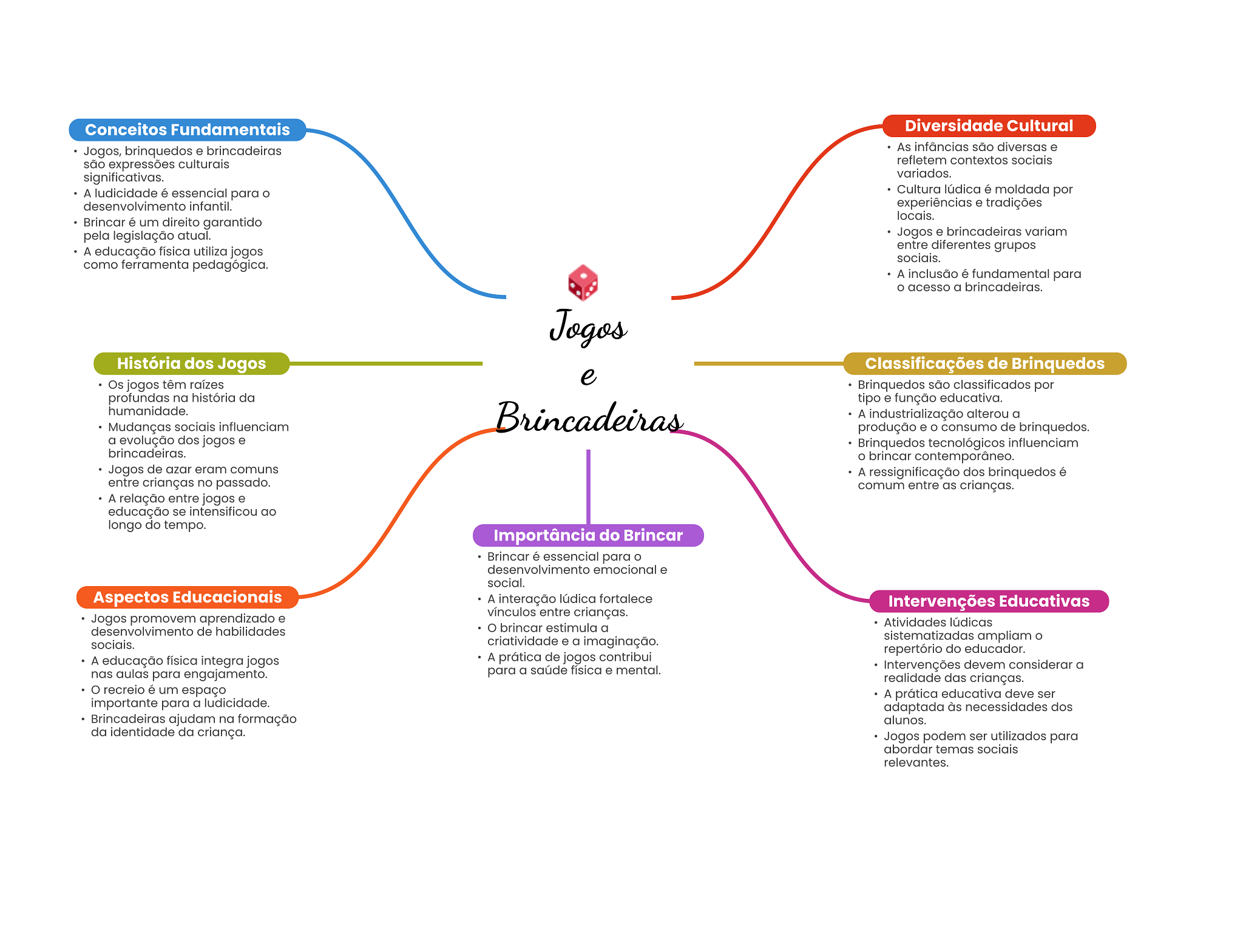 Conceitos Fundamentais Diversidade Cultural Jogos, brinquedos e brincadeiras As infâncias são diversas e são expressões culturais refletem contextos sociais significativas. variados. A ludicidade é essencial para Cultura lúdica é moldada por desenvolvimento infantil. experiências e tradições locais. Brincar é um direito garantido pela legislação atual. Jogos e brincadeiras variam A educação física utiliza jogos entre diferentes grupos sociais. como ferramenta pedagógica. A inclusão é fundamental para acesso a brincadeiras. Jogos História dos Jogos Classificações de Brinquedos e Os jogos têm raízes Brinquedos são classificados por profundas na história da tipo e função educativa. humanidade. Mudanças sociais influenciam Brincadeiras A industrialização alterou a produção e consumo de brinquedos. a evolução dos jogos e Brinquedos tecnológicos influenciam brincadeiras. O brincar contemporâneo. Jogos de azar eram comuns A ressignificação dos brinquedos é entre crianças no passado. comum entre as crianças. A relação entre jogos e educação se intensificou ao longo do tempo. Importância do Brincar Brincar é essencial para desenvolvimento emocional e social. Aspectos Educacionais A interação lúdica fortalece Intervenções Educativas Jogos promovem aprendizado e vínculos entre crianças. desenvolvimento de habilidades brincar estimula a Atividades lúdicas sociais. criatividade e a imaginação. sistematizadas ampliam O repertório do educador. A educação física integra jogos A prática de jogos contribui para a saúde física e mental. Intervenções devem considerar a nas aulas para engajamento. realidade das crianças. recreio é um espaço A prática educativa deve ser importante para a ludicidade. adaptada às necessidades dos Brincadeiras ajudam na formação alunos. da identidade da criança. Jogos podem ser utilizados para abordar temas sociais relevantes.