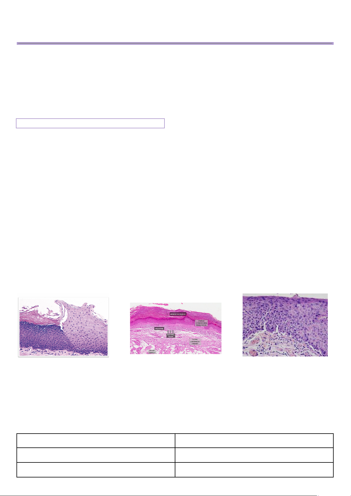 Patologias Epiteliais Lesões potencialmente malignas/cancerizáveis: Lesões morfologicamente alteradas, com maior risco que o tecido normal para transformações malignas. > Alterações microscópicas que são traduzidas no exame clínico como manchas brancas ou vermelhas na mucosa bucal; LEUCOPLASIA Placa ou mancha branca que não pode ser caracterizada clínica ou patologicamente como qualquer outra doença. Sendo ela 85% das lesões cancerizáveis. > Fatores associados: - Tabaco: - 6 vezes mais comum em fumantes; - Cessação do fumo, diminui as chances; - Etilismo (consumo de álcool); - Radiação solar - lábio inferior; > Características: - Taxa de transformação maligna: 1-4% - Maior risco de transformação: >2cm > Características clínicas: - Qualquer região; - Mucosa jugal e gengiva; - Lábio inferior, língua e assoalho 1) Homogênea: fina achatada e cor (branca) homogênea. - Delgada - Espessa 2) Não homogênea: - Leucoplasia - Granular - Verruciforme (esofitica) > Diagnóstico: Exclusão 1) Removível à raspagem? - Sim - Candidíase ou queimadura 2) Não! Há possíveis agressores? - Sim - Remoção (2-4 semanas) regressão? - Sim - Diagnóstico e conduta específica 3) Não! Pode se definir como outra lesão branca? - Sim - Diagnóstico e conduta específica - Não - Leucoplasia > Diagnóstico clínico VS Diagnóstico histopatológico > Critérios para diagnóstico de displasia epitelial: ALTERAÇÕES ARQUITETÔNICAS ALTERAÇÕES CELULARES Estratificação epitelial irregular Núcleos com tamanho aumentado Perda de polaridade das células da camada basal Pleomorfismo nuclear Cristas epiteliais em forma de gota Células com tamanho aumentado Aumento do número de mitoses Pleomorfismo celular Presença de mitoses na metade superficial do epitélio Aumento da proporção núcleo/citoplasma Ceratinização individual Aumento do volume nuclear Pérola de ceratina Número aumentado e de tamanhos dos núcleos Mitoses atípicas Hipercromasia