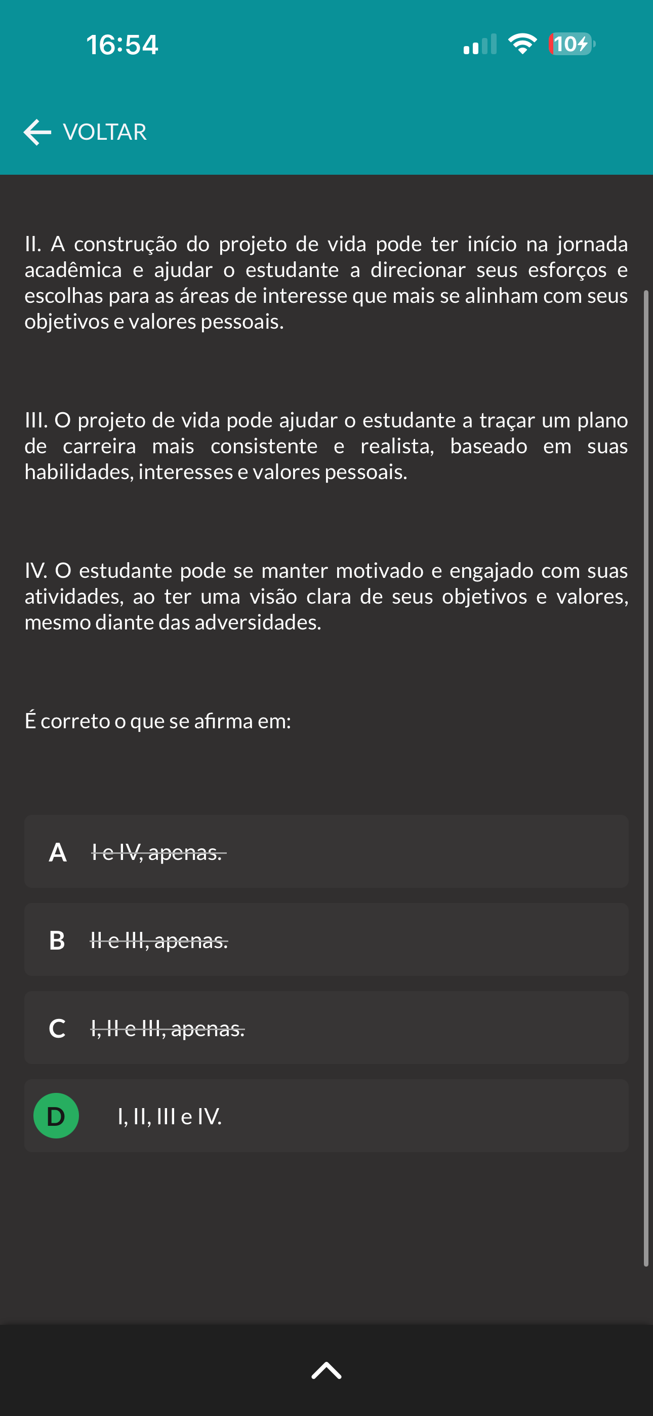 16:54 104 VOLTAR II. A construção do projeto de vida pode ter início na jornada acadêmica e ajudar estudante a direcionar seus esforços e escolhas para as áreas de interesse que mais se alinham com seus objetivos e valores pessoais. III. projeto de vida pode ajudar estudante a traçar um plano de carreira mais consistente e realista, baseado em suas habilidades, interesses e valores pessoais. IV. estudante pode se manter motivado e engajado com suas atividades, ao ter uma visão clara de seus objetivos e valores, mesmo diante das adversidades. É correto que se afirma em: A c D I, II, III e IV.