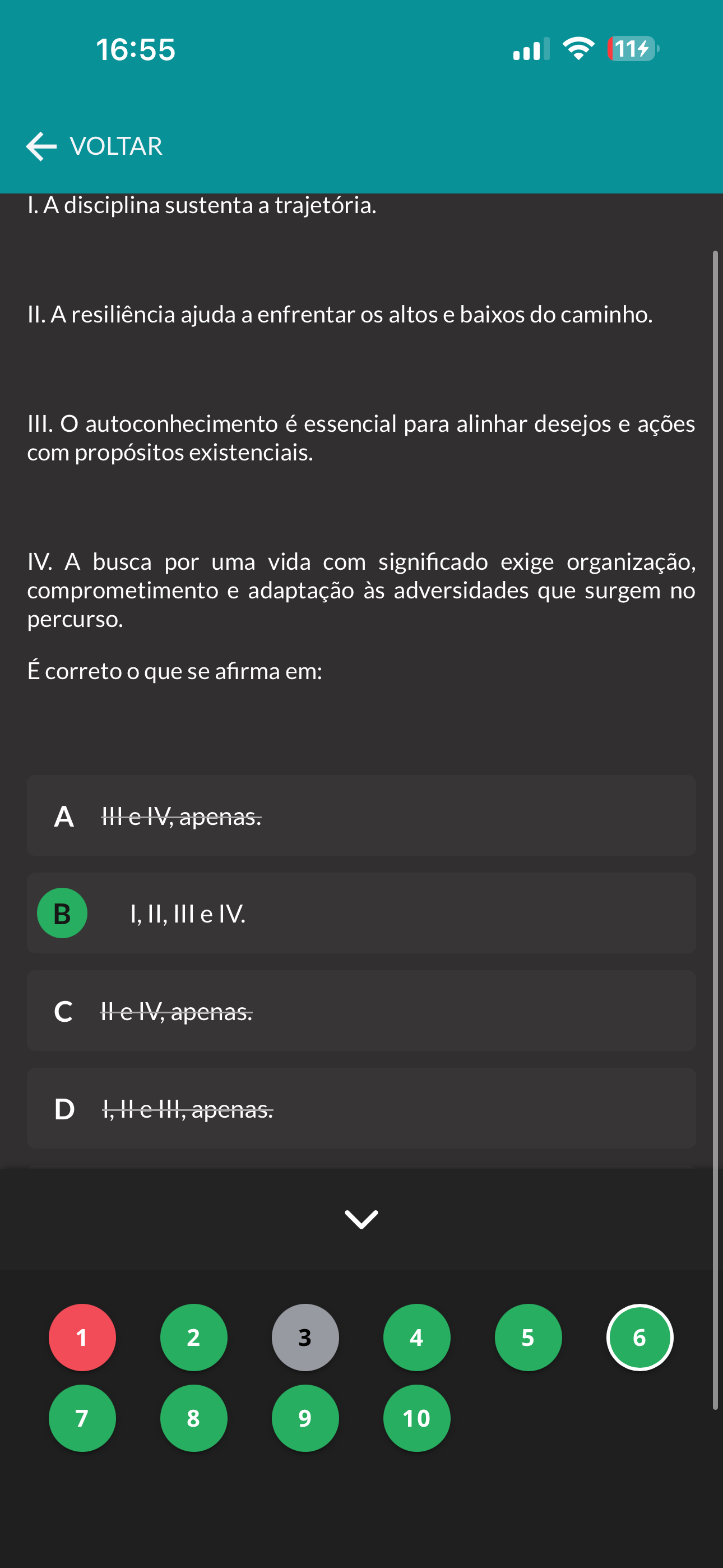 16:55 114 VOLTAR I. A disciplina sustenta a trajetória. II. A resiliência ajuda a enfrentar os altos e baixos do caminho. III. é essencial para alinhar desejos e ações com propósitos existenciais. IV. A busca por uma vida com significado exige organização, comprometimento e adaptação às adversidades que surgem no percurso. É correto que se afirma em: A I, II, III e IV. c D 1 2 3 4 5 6 7 8 9 10