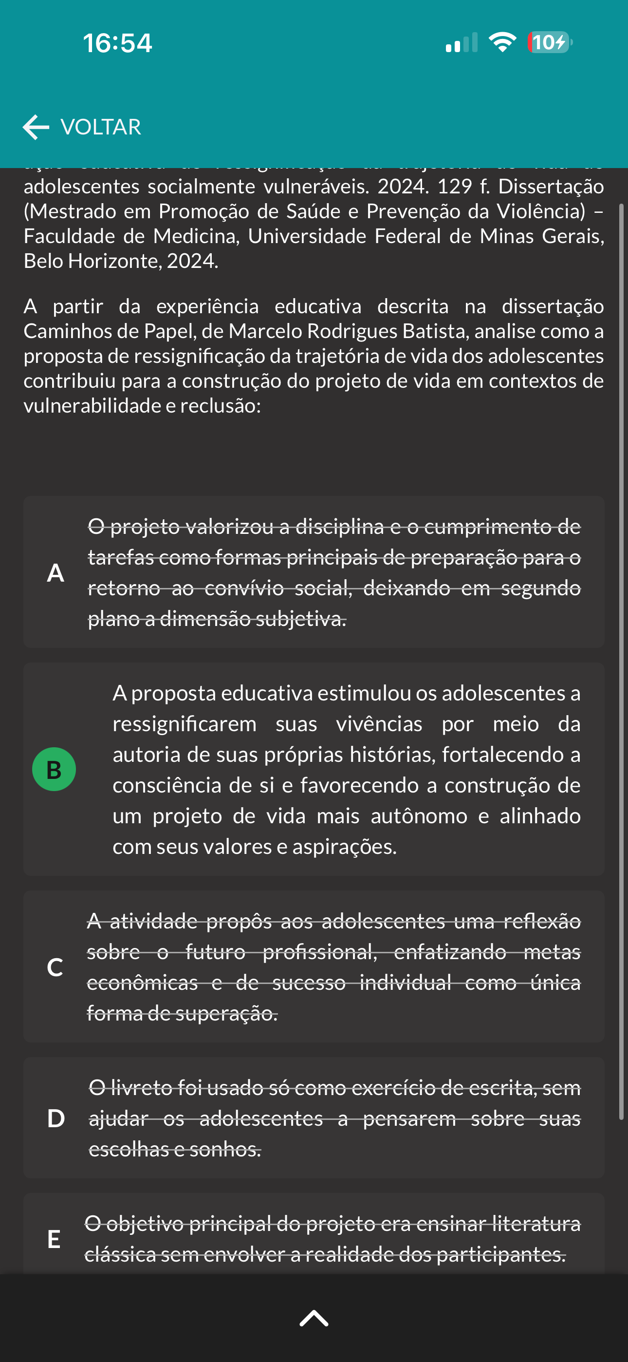 16:54 104 VOLTAR adolescentes socialmente vulneráveis. 2024. 129 f. Dissertação (Mestrado em Promoção de Saúde e Prevenção da Violência) Faculdade de Medicina, Universidade Federal de Minas Gerais, Belo Horizonte, 2024. A partir da experiência educativa descrita na dissertação Caminhos de Papel, de Marcelo Rodrigues Batista, analise como a proposta de ressignificação da trajetória de vida dos adolescentes contribuiu para a construção do projeto de vida em contextos de vulnerabilidade e reclusão: projeto valorizou a disciplina cumprimento de tarefas como formas principais de preparação para A retorno ao convívio social, deixando em segundo plano a dimensão subjetiva. A proposta educativa estimulou os adolescentes a ressignificarem suas vivências por meio da autoria de suas próprias histórias, fortalecendo a consciência de si e favorecendo a construção de um projeto de vida mais autônomo e alinhado com seus valores e aspirações. A atividade propôs aos adolescentes uma reflexão sobre futuro profissional, enfatizando metas c econômicas e de sucesso individual como única forma de superação. livreto foi usado só como exercício de escrita, sem D ajudar adolescentes a pensarem sobre suas escolhas e sonhos. objetivo principal do projeto era ensinar literatura E clássica sem envolver a realidade dos participantes.
