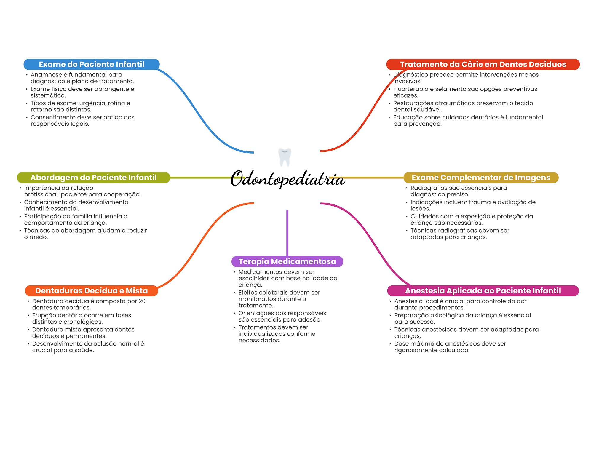 Exame do Paciente Infantil Tratamento da Cárie em Dentes Decíduos Anamnese é fundamental para Diagnóstico precoce permite intervenções menos diagnóstico e plano de tratamento. invasivas. Exame físico deve ser abrangente e Fluorterapia e selamento são opções preventivas sistemático. eficazes. Tipos de exame: urgência, rotina e Restaurações atraumáticas preservam tecido retorno são distintos. dental saudável. Consentimento deve ser obtido dos Educação sobre cuidados dentários é fundamental responsáveis legais. para prevenção. Abordagem do Paciente Infantil Odontopediatria Exame Complementar de Imagens Importância da relação Radiografias são essenciais para profissional-paciente para cooperação. diagnóstico preciso. Conhecimento do desenvolvimento Indicações incluem trauma e avaliação de infantil é essencial. lesões. Participação da família influencia Cuidados com a exposição e proteção da comportamento da criança. criança são necessários. Técnicas de abordagem ajudam a reduzir Técnicas radiográficas devem ser O medo. adaptadas para crianças. Terapia Medicamentosa Medicamentos devem ser escolhidos com base na idade da criança. Dentaduras Decídua e Mista Efeitos colaterais devem ser Anestesia Aplicada ao Paciente Infantil Dentadura decídua é composta por 20 monitorados durante O Anestesia local é crucial para controle da dor dentes temporários. tratamento. durante procedimentos. Erupção dentária ocorre em fases Orientações aos responsáveis Preparação psicológica da criança é essencial distintas e cronológicas. são essenciais para adesão. para sucesso. Dentadura mista apresenta dentes Tratamentos devem ser Técnicas anestésicas devem ser adaptadas para decíduos e permanentes. individualizados conforme crianças. necessidades. Desenvolvimento da oclusão normal é Dose máxima de anestésicos deve ser crucial para a saúde. rigorosamente calculada.