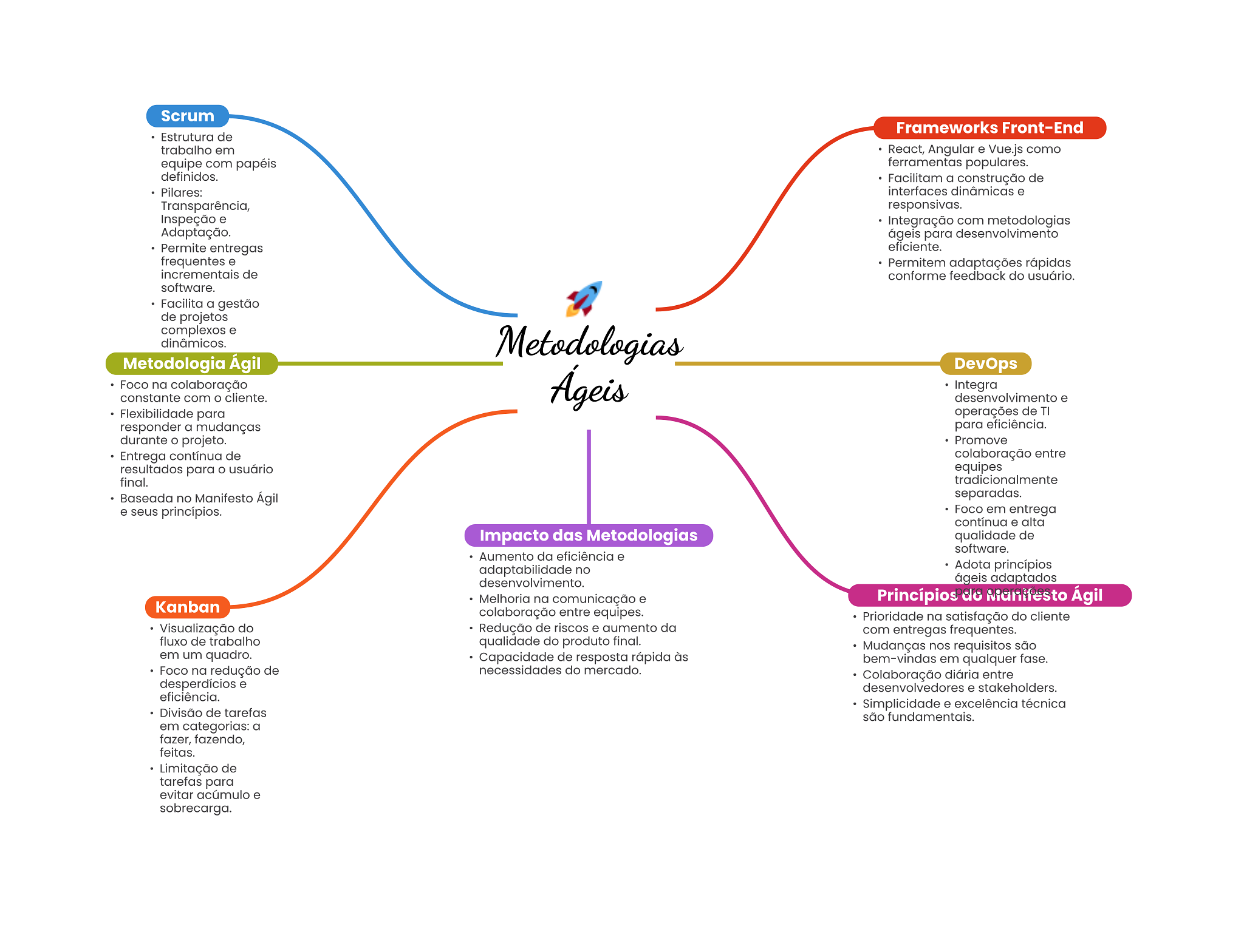 Scrum Frameworks Front-End Estrutura de trabalho em React, Angular e Vue.js como equipe com papéis ferramentas populares. definidos. Facilitam a construção de Pilares: interfaces dinâmicas e Transparência, responsivas. Inspeção e Integração com metodologias Adaptação. ágeis para desenvolvimento Permite entregas eficiente. frequentes e Permitem adaptações rápidas incrementais de conforme feedback do usuário. software. Facilita a gestão de projetos complexos e dinâmicos. Metodologias Metodologia Ágil DevOps Foco na colaboração constante com cliente. Ágeis Integra desenvolvimento e Flexibilidade para operações de TI responder a mudanças para eficiência. durante projeto. Promove Entrega contínua de colaboração entre resultados para O usuário equipes final. tradicionalmente Baseada no Manifesto Ágil separadas. e seus princípios. Foco em entrega contínua e alta Impacto das Metodologias qualidade de software. Aumento da eficiência e adaptabilidade no Adota princípios desenvolvimento. ágeis adaptados Melhoria na comunicação e Princípios Manifesto Ágil Kanban colaboração entre equipes. Prioridade na satisfação do cliente Visualização do Redução de riscos e aumento da com entregas frequentes. fluxo de trabalho qualidade do produto final. Mudanças nos requisitos são em um quadro. Capacidade de resposta rápida às bem-vindas em qualquer fase. Foco na redução de necessidades do mercado. Colaboração diária entre desperdícios e desenvolvedores e stakeholders. eficiência. Simplicidade e excelência técnica Divisão de tarefas são fundamentais. em categorias: a fazer, fazendo, feitas. Limitação de tarefas para evitar acúmulo e sobrecarga.