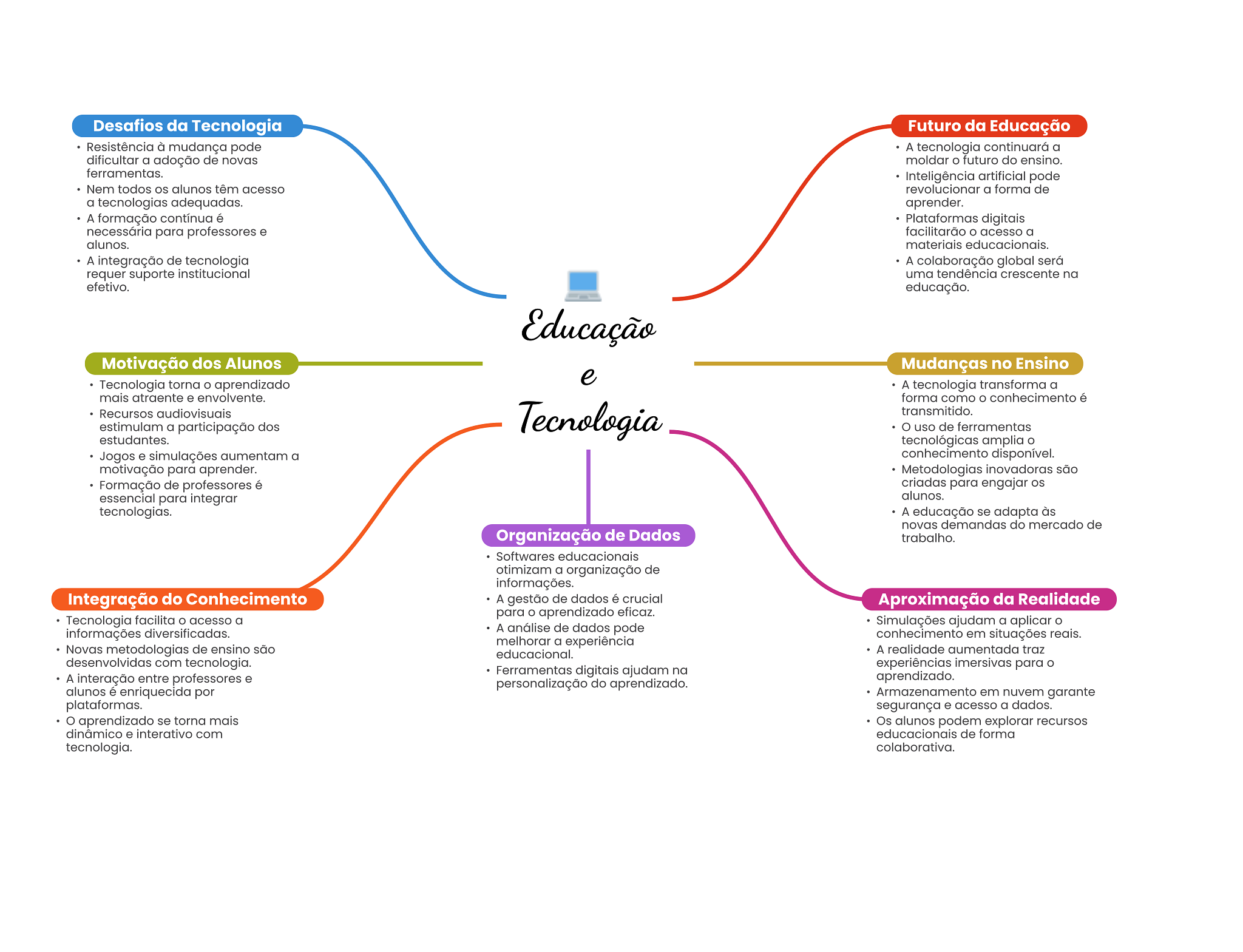 Desafios da Tecnologia Futuro da Educação Resistência à mudança pode A tecnologia continuará a dificultar a adoção de novas moldar futuro do ensino. ferramentas. Inteligência artificial pode Nem todos alunos têm acesso revolucionar a forma de a tecnologias adequadas. aprender. A formação contínua é Plataformas digitais necessária para professores e facilitarão acesso a alunos. materiais educacionais. A integração de tecnologia A colaboração global será requer suporte institucional uma tendência crescente na efetivo. educação. Educação Motivação dos Alunos Mudanças no Ensino e Tecnologia torna aprendizado A tecnologia transforma a mais atraente e envolvente. forma como conhecimento é Recursos audiovisuais Tecnologia transmitido. estimulam a participação dos uso de ferramentas estudantes. tecnológicas amplia O Jogos e simulações aumentam a conhecimento disponível. motivação para aprender. Metodologias inovadoras são Formação de professores é criadas para engajar essencial para integrar alunos. tecnologias. A educação se adapta às novas demandas do mercado de Organização de Dados trabalho. Softwares educacionais otimizam a organização de informações. Integração do Conhecimento A gestão de dados é crucial Aproximação da Realidade para aprendizado eficaz. Tecnologia facilita acesso a Simulações ajudam a aplicar O informações diversificadas. A análise de dados pode conhecimento em situações reais. melhorar a experiência Novas metodologias de ensino são educacional. A realidade aumentada traz desenvolvidas com tecnologia. experiências imersivas para O Ferramentas digitais ajudam na A interação entre professores e aprendizado. personalização do aprendizado. alunos é enriquecida por Armazenamento em nuvem garante plataformas. segurança e acesso a dados. aprendizado se torna mais Os alunos podem explorar recursos dinâmico e interativo com educacionais de forma tecnologia. colaborativa.