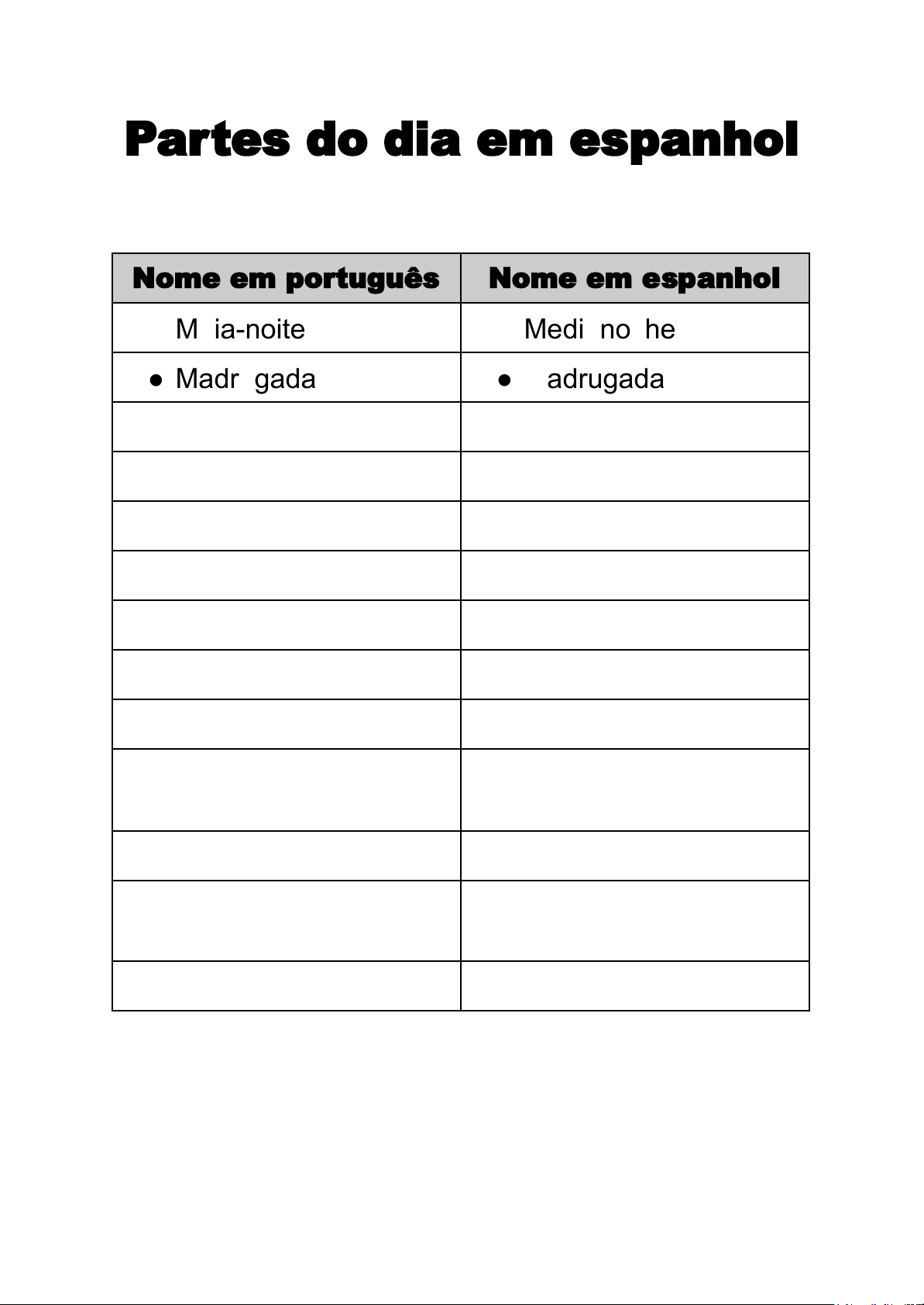 Partes do dia em espanhol Nome em português Nome em espanhol ● Meia-noite ● Medianoche ● Madrugada ● Madrugada ● Amanhecer ● Amanecer ● Nascer do sol ● Nacer del sol ● Manhã ● Mañana ● Meio-dia ● Mediodía ● Tarde ● Tarde ● Pôr do sol ● Puesta del sol ● Anoitecer ● Anochecer ● Noite (que não é madrugada) ● Noche ● Dia (período de luz) ● Día ● Noite (oposto ao período de luz) ● Noche ● Crepúsculo ● Crepúsculo