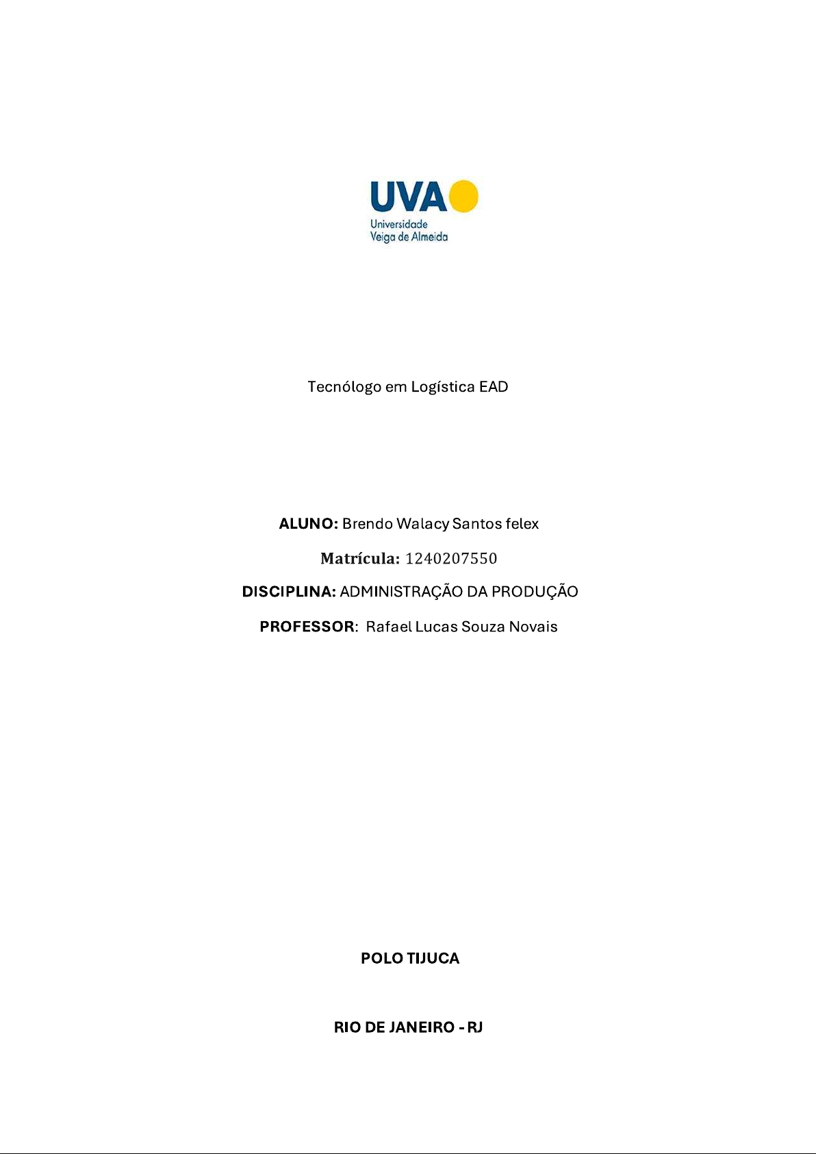 UVA Universidade Veiga de Almeida Tecnólogo em Logística EAD ALUNO: Brendo Walacy Santos felex Matrícula: 1240207550 DISCIPLINA: ADMINISTRAÇÃO DA PRODUÇÃO PROFESSOR: Rafael Lucas Souza Novais POLO TIJUCA RIO DE JANEIRO - RJ2025 ESTUDO DE CASO: FLUXO DE PROCESSO DE CLIENTES EM UM RESTAURANTE 1. Introdução atendimento ao cliente é um dos principais fatores de sucesso dentro de um restaurante. A eficiência no fluxo de processos desde a chegada do cliente até pagamento influencia diretamente a satisfação, a retenção e a percepção de qualidade do serviço. Este estudo de caso analisa fluxo de processos em um restaurante de médio porte, identificando etapas, gargalos e oportunidades de melhoria. 2. Objetivo do Estudo Mapear fluxo de atendimento ao cliente dentro de um restaurante. Identificar falhas ou atrasos no processo. Propor melhorias que otimizem o tempo e aumentem a qualidade do serviço. 3. Metodologia A metodologia utilizada neste estudo inclui observação direta, entrevistas com funcionários e análise do tempo médio de espera em cada etapa do processo. 4. Descrição do Restaurante Observado restaurante analisado possui capacidade para 120 clientes, atendimento presencial e por aplicativo, além de sistema de fila de espera nos horários de pico. fluxo observado ocorreu no horário de almoço.5. Fluxo do Processo de Atendimento 1. Chegada do cliente. 2. Acomodação na mesa. 3. Entrega do cardápio. 4. Registro do pedido. 5. Preparação do pedido pela cozinha. 6. Entrega dos pratos. 7. Consumo. 8. Solicitação da conta. 9. Pagamento. 10. Saída. Arquivo Página Inicial Inserir Layout da Página Dados Revisão Exibir Desenvolvedor Ajuda X Recortar Calibri 11 Automaticamente Normal Neutro Colar N % como Pincel de Formatação Area de Alinhamento A1 Dashboard Dashboard Menu Principal Base de Dados Cadastro de Pratos Faturamento Restaurante Ano Mês MAR NOV Receita Total Custo Total Lucro Líquido Total Pedidos 182.9 K 56.9 K 126.1 K Top 3 mais vendidos Pedidos por Tipo de Entrega Maninha 29% 42% 29% Camarão molho de Tomate Arrumadinho de Charque 12.6 K Delivery food Local Evolução Receita Mensal MAI FEV NOV IAN DEZ JUL JUN MAR AGO ABR SET OUT 6. Identificação de ProblemasForam identificados alguns gargalos, como: Tempo de espera elevado na chegada. Atraso na entrega de cardápios. Acúmulo de pedidos na cozinha. Fila no momento do pagamento. TABELA DE PREÇOS CÓDIGO ITEM PREÇO UNI. FORMA DE PGTO. CATEGORIA 1 COCA COLA R$ 10,00 TODAS 2 FANTA LARANJA R$ 20,00 TODAS 3 FANTA UVA R$ 17,00 TODAS 4 SPRITE R$ 15,00 TODAS 5 PRATO EXECUTIVO R$ 15,00 TODAS 6 PRATO FEITO R$ 8,00 TODAS 7 SUCO DE LIMÃO R$ 10,00 TODAS 8 SUCO DE LARANJA R$ 6,00 TODAS 9 SOBREMESA 1 R$ 7,00 TODAS 10 SOBREMESA 2 R$ 18,00 TODAS 11 SOBREMESA 3 R$ 14,00 TODAS 12 SOBREMESA 4 R$ 7,00 TODAS 7. Propostas de Melhoria Implementação de cardápio digital por QR Code. Treinamento periódico da equipe. Otimização do layout interno da cozinha. Ampliação da quantidade de máquinas de pagamento portátil.8. Conclusão fluxo de atendimento depende do equilíbrio entre equipe, processos e estrutura. Pequenas melhorias podem reduzir atrasos e aumentar significativamente a satisfação do cliente. Referências BRAGA, Luiz F. Gestão de Serviços em Restaurantes. São Paulo: Atlas, 2021. SILVA, Marcos Processos Operacionais e Atendimento ao Cliente. Rio de Janeiro: FGV, 2020. OLIVEIRA, João P. Mapeamento de Processos em Serviços de Alimentação. Belo Horizonte: UFMG, 2019