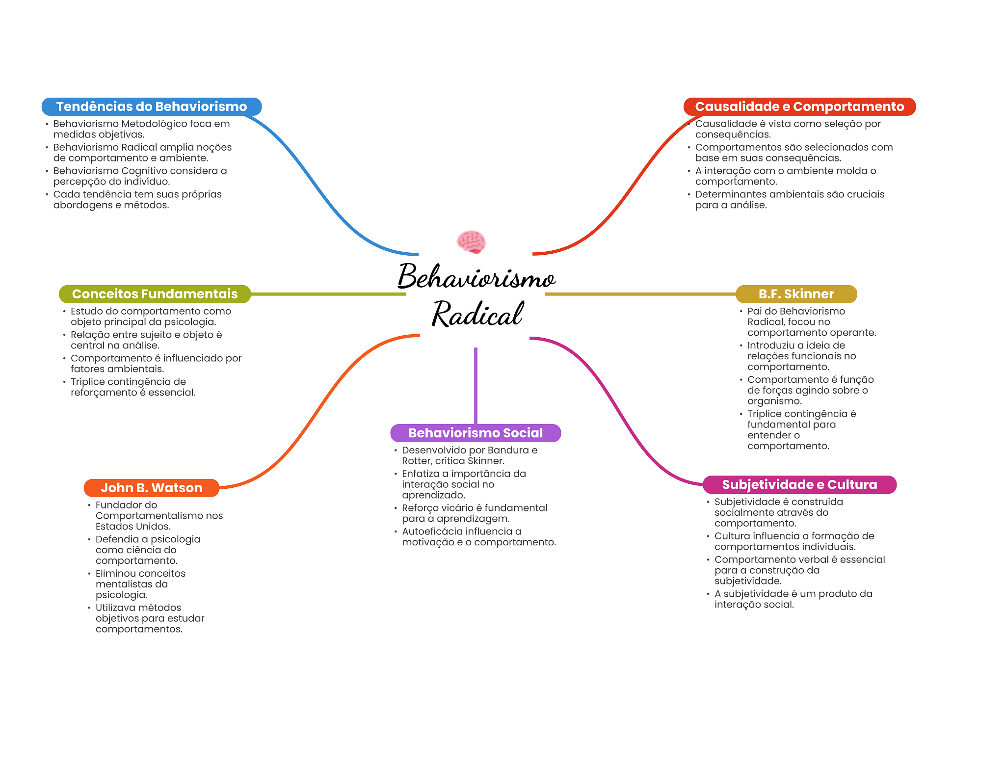 Tendências do Behaviorismo Causalidade e Comportamento Behaviorismo Metodológico foca em Causalidade é vista como por medidas objetivas. consequências. Behaviorismo Radical amplia noções Comportamentos são selecionados com de comportamento e ambiente. base em suas consequências. Behaviorismo Cognitivo considera a A interação com ambiente molda percepção do indivíduo. comportamento. Cada tendência tem suas próprias Determinantes ambientais são cruciais abordagens e métodos. para a análise. Behaviorismo Conceitos Fundamentais B.F. Skinner Estudo do comportamento como objeto principal da psicologia. Radical Pai do Behaviorismo Radical, focou no Relação entre sujeito e objeto é comportamento operante. central na análise. Introduziu a ideia de Comportamento é influenciado por relações funcionais no fatores ambientais. comportamento. Tríplice contingência de Comportamento é função reforçamento é essencial. de forças agindo sobre organismo. Tríplice contingência é fundamental para Behaviorismo Social entender Desenvolvido por Bandura e comportamento. Rotter, critica Skinner. Enfatiza a importância da John B. Watson interação social no Subjetividade e Cultura aprendizado. Fundador do Subjetividade é construída Reforço vicário é fundamental Comportamentalismo nos socialmente através do para a aprendizagem. Estados Unidos. comportamento. Autoeficácia influencia a Defendia a psicologia Cultura influencia a formação de motivação e comportamento. como ciência do comportamentos individuais. comportamento. Comportamento verbal é essencial Eliminou conceitos para a construção da mentalistas da subjetividade. psicologia. A subjetividade é um produto da Utilizava métodos interação social. objetivos para estudar comportamentos.