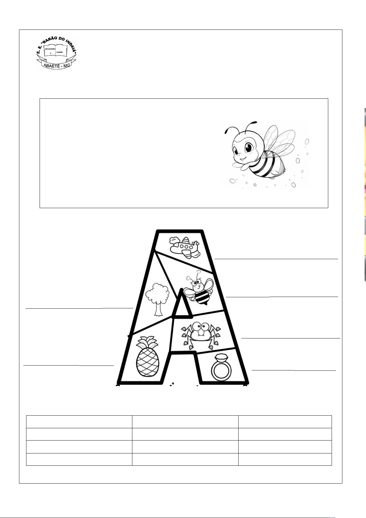 ESCOLA ESTADUAL “BARÃO DO INDAIÁ” Endereço: Rua DR ANTONIO AMADOR, 639 – CENTRO – ABAETÉ -MG PROJETO LER E ESCREVER ( A abelhinha Lili Lili é uma linda abelhinha. Lili voa, voa pelo jardim. Ela colhe o néctar das flores. Lili leva o néctar para a colmeia. Suas irmãs transformam o nétar em um delicioso mel. Lili é uma abelha muito trabalhadeira. ) 1º GUIA ORTOGRÁFICO - A a Escreva o nome dos desenhos: Banco de palavras: amora ameixa abacate amor amigo aquário avental agulha areia anjo alicate aviso image1.emf image2.jpeg image3.png image4.png