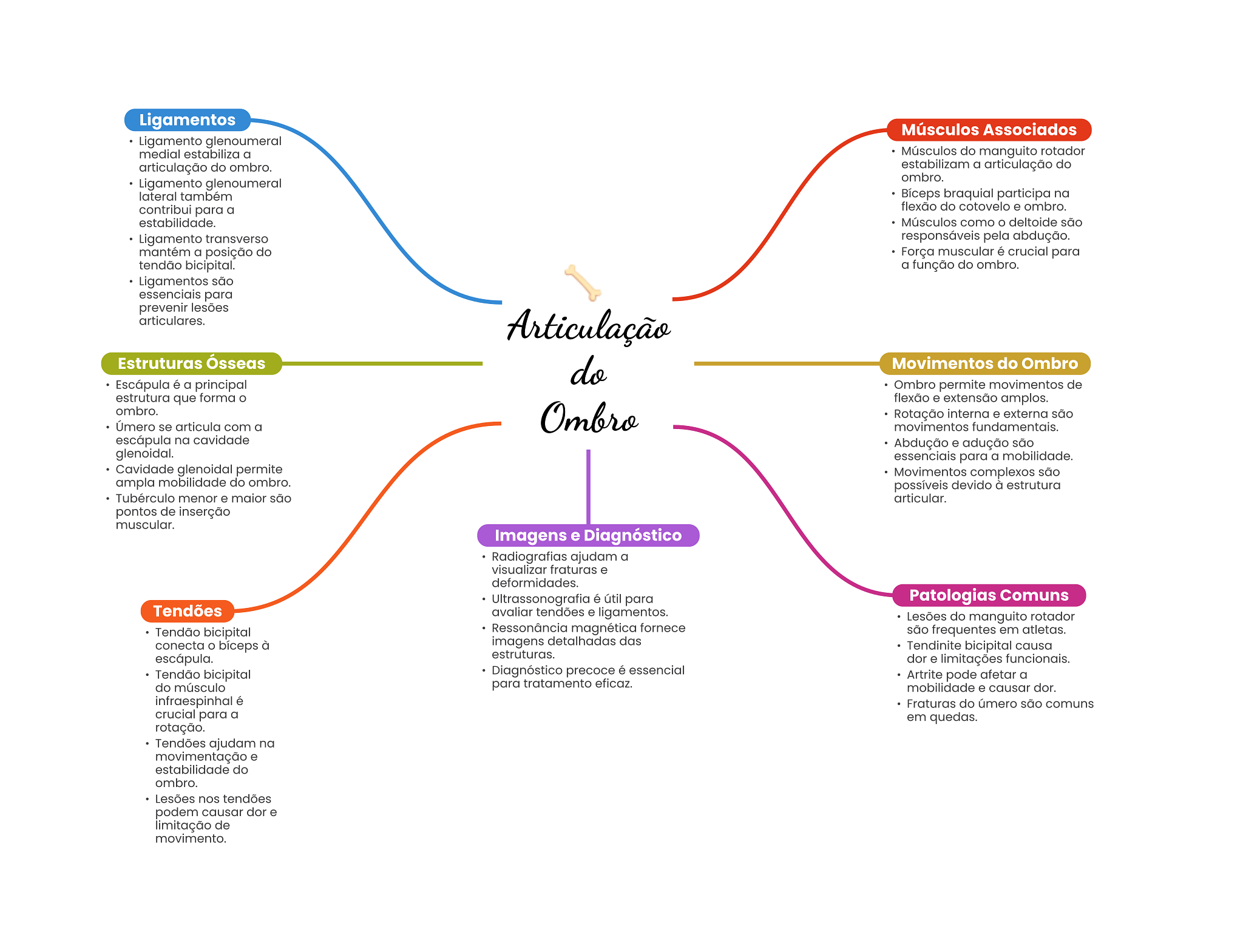 Ligamentos Músculos Associados Ligamento glenoumeral medial estabiliza a Músculos do manguito rotador articulação do ombro. estabilizam a articulação do ombro. Ligamento glenoumeral lateral também Bíceps braquial participa na contribui para a flexão do cotovelo e ombro. estabilidade. Músculos como O deltoide são Ligamento transverso responsáveis pela abdução. mantém a posição do Força muscular é crucial para tendão bicipital. a função do ombro. Ligamentos são essenciais para prevenir lesões articulares. Articulação Estruturas Ósseas do Movimentos do Ombro Escápula é a principal Ombro permite movimentos de estrutura que forma flexão e extensão amplos. ombro. Úmero se articula com a Ombro Rotação interna e externa são movimentos fundamentais. escápula na cavidade Abdução e adução são glenoidal. essenciais para a mobilidade. Cavidade glenoidal permite Movimentos complexos são ampla mobilidade do ombro. possíveis devido à estrutura Tubérculo menor e maior são articular. pontos de inserção muscular. Imagens e Diagnóstico Radiografias ajudam a visualizar fraturas e deformidades. Ultrassonografia é útil para Patologias Comuns Tendões avaliar tendões e ligamentos. Lesões do manguito rotador Tendão bicipital Ressonância magnética fornece são frequentes em atletas. conecta à imagens detalhadas das Tendinite bicipital causa escápula. estruturas. dor e limitações funcionais. Tendão bicipital Diagnóstico precoce é essencial Artrite pode afetar a do músculo para tratamento eficaz. mobilidade e causar dor. infraespinhal é Fraturas do úmero são comuns crucial para a em quedas. rotação. Tendões ajudam na movimentação e estabilidade do ombro. Lesões nos tendões podem causar dor e limitação de movimento.