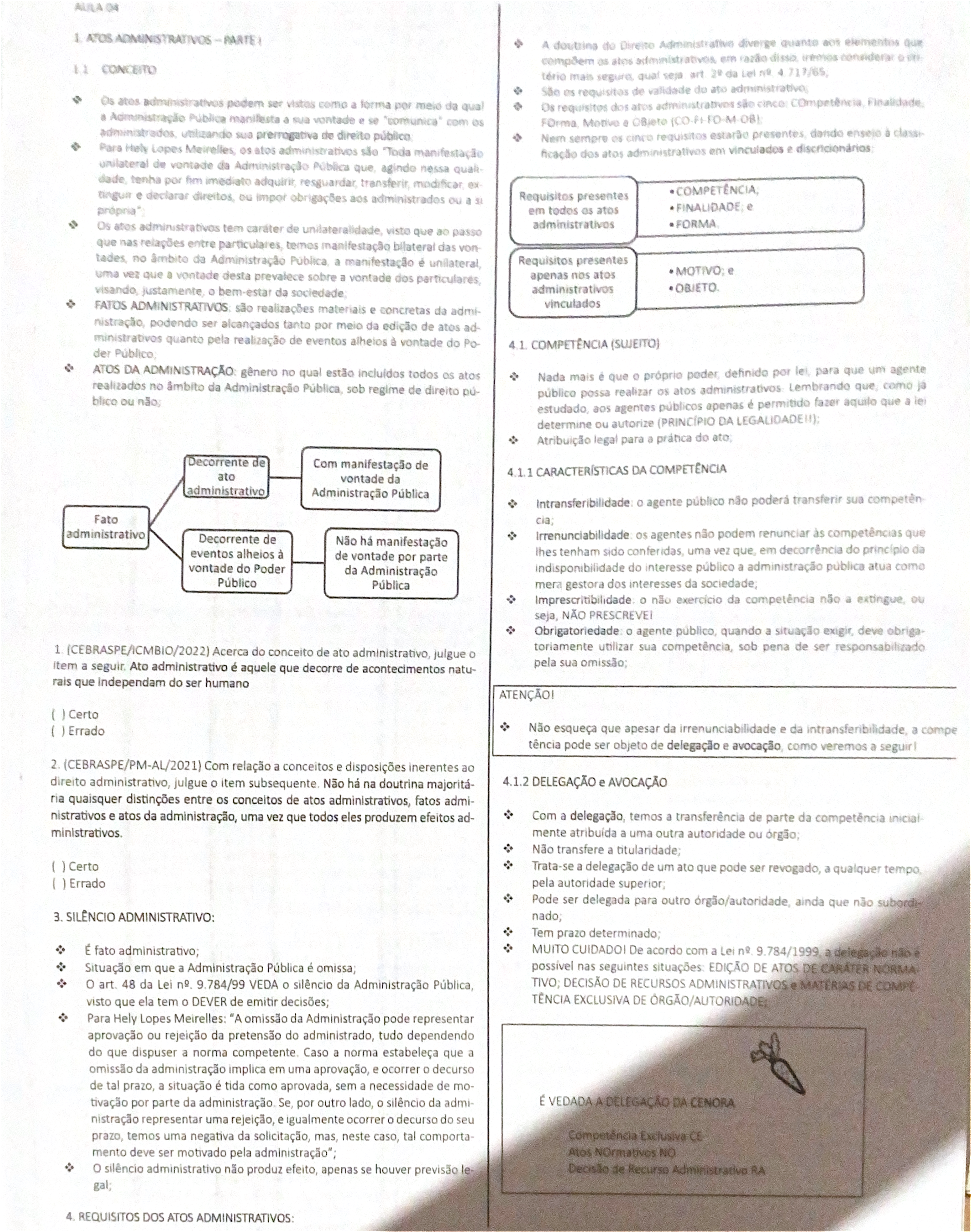 AULA 04 1. ATOS ADMINISTRATIVOS PARTE A do Direito diverge elementos que em razão considerar 11 CONCEITO tério mais qual seja art da São requisitos de validade do ato Os atos administrativos podem ser vistos como a forma por da qual Os requisitos dos atos administrativos são a Administração Pública a sua vontade se "comunica" com os Motive OBjeto administrados, utilizando sua de direito Nem sempre cinco requisitos estarão dando à classi- Para Hely Lopes os atos administrativos são manifestação ficação dos atos administrativos em vinculados e unilateral de vontade da Administração Pública que, agindo nessa tenha por imediato tinguir e declarar direitos, impor obrigações aos administrados ou a Requisitos presentes em todos atos e Os atos administrativos tem caráter de visto que ao passo administrativos que has relações entre particulares, temos manifestação bilateral das von- tades, no âmbito da Administração a manifestação unilateral, Requisitos presentes uma vez que a vontade desta prevalece sobre a vontade dos apenas nos atos e visando, justamente, bem-estar da administrativos FATOS ADMINISTRATIVOS: são realizações materials e concretas da admi- vinculados nistração, podendo ser alcançados tanto por meio da edição de atos ad- ministrativos quanto pela realização de eventos alhelos à vontade do Po- 4.1. COMPETÊNCIA (SUJEITO) der ATOS DA ADMINISTRAÇÃO: gênero no qual estão incluídos todos atos Nada mais é que próprio poder, definido por lei, para que um agente realizados no âmbito da Administração Pública, sob regime de direito público possa realizar os atos administrativos Lembrando como ja blico ou estudado, aos agentes públicos apenas é permitido fazer aquilo que a lei determine ou autorize (PRINCÍPIO DA Atribuição legal para a prática do Decorrente de Com manifestação de 4.1.1 CARACTERÍSTICAS DA COMPETÊNCIA ato vontade da administrativo Administração Pública Intransferibilidade: agente público não poderá transferir sua Fato cia; administrativo Decorrente de Não há manifestação Irrenunciabilidade: os agentes não podem renunciar às competências que eventos alheios à de vontade por parte tenham sido conferidas, uma vez que, em decorrência do da vontade do Poder da Administração indisponibilidade do interesse público a administração pública atua como Público Pública mera gestora dos interesses da sociedade; Imprescritibilidade: não exercício da competência não a extingue, ou seja, NÃO PRESCREVEI Obrigatoriedade: o agente público, quando a situação exigir, deve obriga- Acerca do conceito de ato administrativo, julgue toriamente utilizar sua competência, sob pena de ser responsabilizado a Ato administrativo é aquele que decorre de acontecimentos natu- pela sua omissão; rais que Independam do ser humano ATENÇÃO! Certo Errado Não esqueça que apesar da irrenunciabilidade e da intransferibilidade, a compe tência pode ser objeto de delegação e avocação, como veremos a 2. (CEBRASPE/PM-AL/2021) Com relação a conceitos e disposições inerentes ao direito administrativo, julgue item subsequente. Não há na doutrina majoritá- 4.1.2 DELEGAÇÃO e AVOCAÇÃO ria quaisquer distinções entre os conceitos de atos administrativos, fatos admi- nistrativos e atos da administração, uma vez que todos eles produzem efeitos ad- Com a delegação, temos a transferência de parte da competência ministrativos. mente atribuída a uma outra autoridade ou órgão; Não transfere a titularidade; Certo Trata-se a delegação de um ato que pode ser revogado, a qualquer tempo, Errado pela autoridade superior; Pode ser delegada para outro órgão/autoridade, ainda que não subordi- 3. SILÊNCIO ADMINISTRATIVO: nado; Tem prazo determinado; É fato administrativo; MUITO CUIDADOI De acordo com a Lei a delegação não Situação em que a Administração Pública é omissa; possível nas seguintes situações: EDIÇÃO DE ATOS DE CARÁTER NORMA art. 48 da Lei 9.784/99 VEDA silêncio da Administração Pública, TIVO; DECISÃO DE RECURSOS ADMINISTRATIVOS e MATÉRIAS DE visto que ela tem DEVER de emitir decisões; TÊNCIA EXCLUSIVA DE Para Hely Lopes Meirelles: "A omissão da Administração pode representar aprovação ou rejeição da pretensão do administrado, tudo dependendo do que dispuser a norma competente. Caso a norma estabeleça que a omissão da administração implica em uma aprovação, e ocorrer decurso de tal prazo, a situação é tida como aprovada, sem a necessidade de mo- tivação por parte da administração. Se, por outro lado, silêncio da admi- É VEDADA A DELEGAÇÃO DA CENORA nistração representar uma rejeição, e igualmente ocorrer decurso do seu prazo, temos uma negativa da solicitação, mas, neste caso, tal comporta- Competência Exclusiva CE mento deve ser motivado pela Atos NOrmativos NO silêncio administrativo não produz efeito, apenas se houver previsão le- Decisão de Recurso Administrativo RA 4. REQUISITOS DOS ATOS ADMINISTRATIVOS: