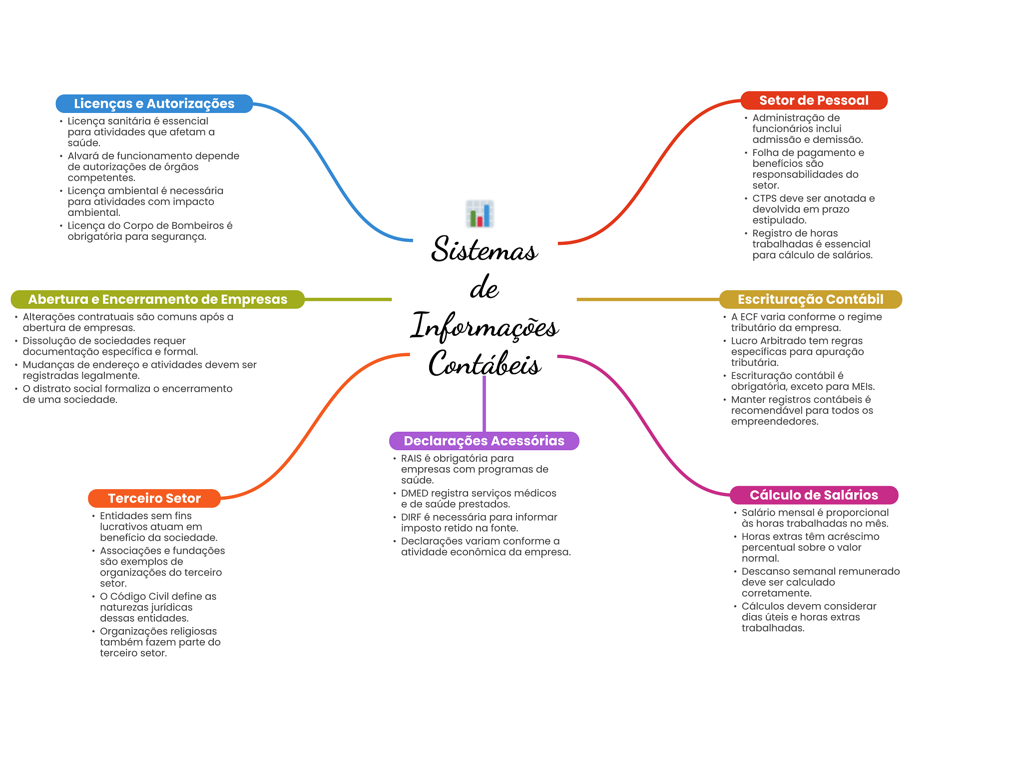 Licenças e Autorizações Setor de Pessoal Licença sanitária é essencial Administração de para atividades que afetam a funcionários inclui saúde. admissão e demissão. Alvará de funcionamento depende Folha de pagamento e de autorizações de órgãos benefícios são competentes. responsabilidades do setor. Licença ambiental é necessária para atividades com impacto CTPS deve ser anotada e ambiental. devolvida em prazo Licença do Corpo de Bombeiros é estipulado. obrigatória para segurança. Registro de horas Sistemas trabalhadas é essencial para cálculo de salários. de Abertura e Encerramento de Empresas Escrituração Contábil Alterações contratuais são comuns após a Informações A ECF varia conforme O regime abertura de empresas. tributário da empresa. Dissolução de sociedades requer Lucro Arbitrado tem regras documentação específica e formal. Contábeis específicas para apuração Mudanças de endereço e atividades devem ser tributária. registradas legalmente. Escrituração contábil é distrato social formaliza encerramento obrigatória, exceto para MEIs. de uma sociedade. Manter registros contábeis é recomendável para todos empreendedores. Declarações Acessórias RAIS é obrigatória para empresas com programas de saúde. Terceiro Setor DMED registra serviços médicos Cálculo de Salários e de saúde prestados. Entidades sem fins DIRF é necessária para informar Salário mensal é proporcional lucrativos atuam em às horas trabalhadas no mês. imposto retido na fonte. benefício da sociedade. Declarações variam conforme a Horas extras têm acréscimo Associações e fundações atividade econômica da empresa. percentual sobre O valor são exemplos de normal. organizações do terceiro Descanso semanal remunerado setor. deve ser calculado Código Civil define as corretamente. naturezas jurídicas Cálculos devem considerar dessas entidades. dias úteis e horas extras Organizações religiosas trabalhadas. também fazem parte do terceiro setor.