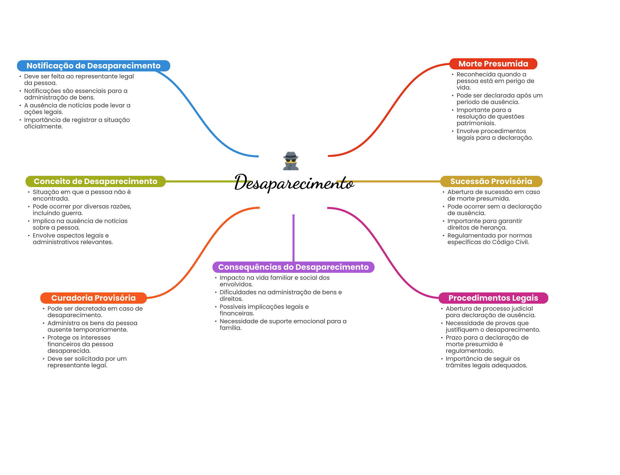 Notificação de Desaparecimento Morte Presumida Deve ser feita ao representante legal Reconhecida quando a da pessoa. pessoa está em perigo de vida. Notificações são essenciais para a administração bens. Pode ser declarada após um A ausência de notícias pode levar a período de ausência. ações legais. Importante para a Importância de registrar a situação resolução de questões oficialmente. patrimoniais. Envolve procedimentos legais para a declaração. Conceito de Desaparecimento Desaparecimento Sucessão Provisória Situação em que a pessoa não é Abertura de sucessão em caso encontrada. de morte presumida. Pode ocorrer por diversas razões, Pode ocorrer sem a declaração incluindo guerra. de ausência. Implica na ausência de notícias Importante para garantir sobre a pessoa. direitos de herança. Envolve aspectos legais e Regulamentada por normas administrativos relevantes. específicas do Código Civil. Consequências do Desaparecimento Impacto na vida familiar e social dos envolvidos. Dificuldades na administração de bens e Curadoria Provisória direitos. Procedimentos Legais Pode ser decretada em caso de Possíveis implicações legais e Abertura de processo judicial desaparecimento. financeiras. para declaração de ausência. Administra bens da pessoa Necessidade de suporte emocional para a Necessidade de provas que ausente temporariamente. família. justifiquem O desaparecimento. Protege interesses Prazo para a declaração de financeiros da pessoa morte presumida é desaparecida. regulamentado. Deve ser solicitada por um Importância de seguir representante legal. trâmites legais adequados.