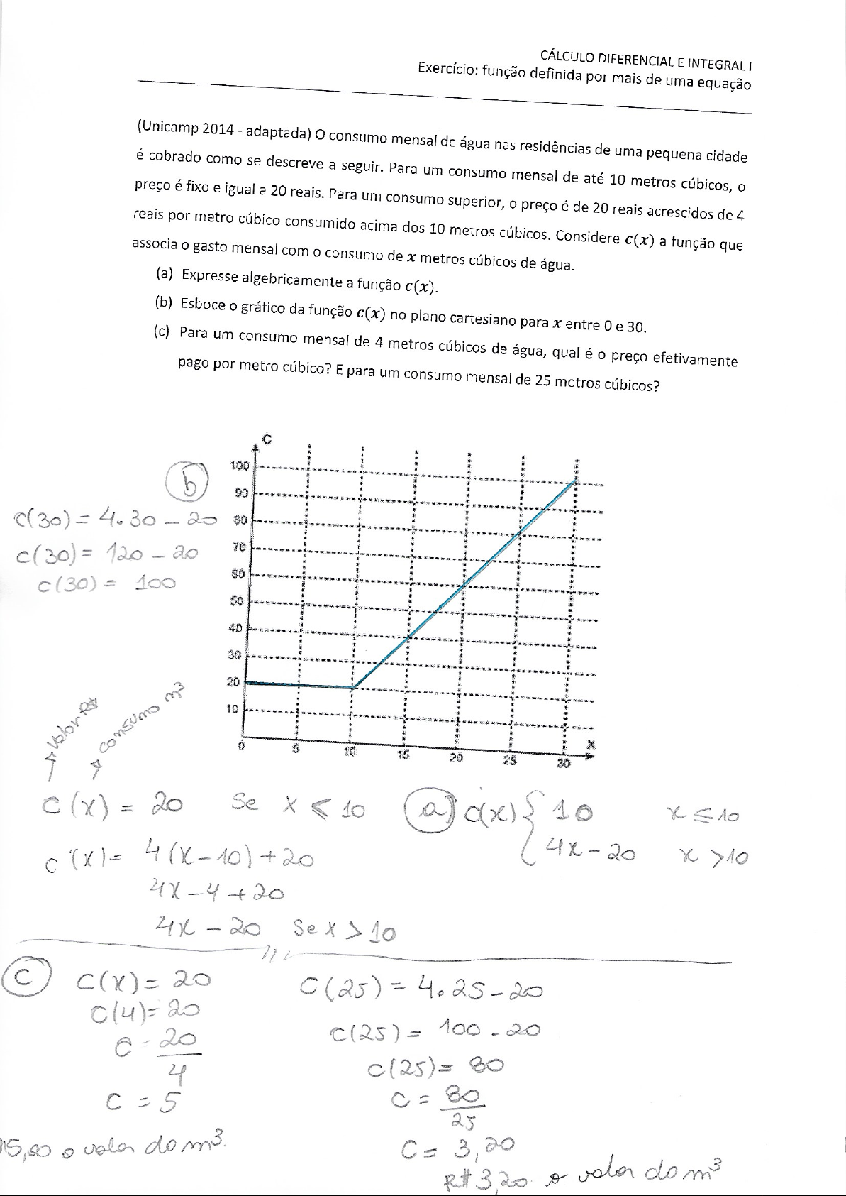 CÁLCULO DIFERENCIAL E INTEGRAL I Exercício: função definida por mais de uma equação (Unicamp 2014 adaptada) O consumo mensal de água nas residências de uma pequena cidade é cobrado como se descreve a seguir. Para um consumo mensal de até 10 metros cúbicos, o preço é fixo e igual a 20 reais. Para um consumo superior, preço é de 20 reais acrescidos de 4 reais por metro cúbico consumido acima dos 10 metros cúbicos. Considere c(x) a função que associa gasto mensal com consumo de x metros cúbicos de água. (a) Expresse algebricamente a função c(x). (b) Esboce o gráfico da função c(x) no plano cartesiano para x entre 0 e 30. (c) Para um consumo mensal de 4 metros cúbicos de água, qual é o preço efetivamente pago por metro cúbico? E para um consumo mensal de 25 metros cúbicos? C 100 b 90 ((30)=4.30-20 80 70 60 50 40 30 20 10 10 15 20 25 30 = 20 Se 10 a 10 20 x >10 20 C 4 25 15,00 do m3 3,20