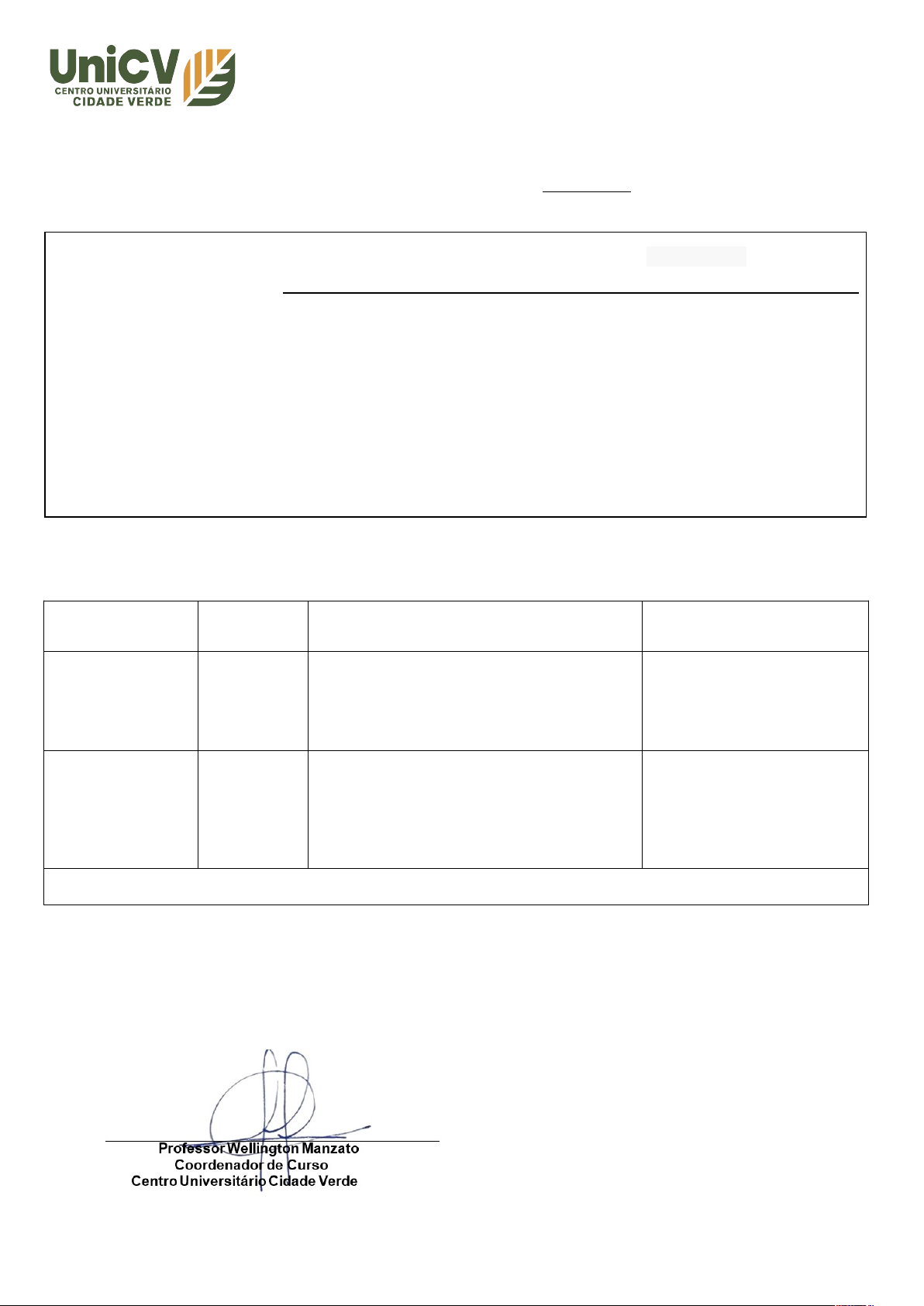 CURSO LICENCIATURA EM PEDAGOGIA ESTÁGIO CURRICULAR SUPERVISIONADO FICHA DE FREQUÊNCIA DE REGÊNCIA Acadêmico (a): Polliany Freitas Maximo de Oliveira RA: 290109-2025 Polo de apoio presencial: __ DADOS DA ESCOLA: CAMPO DE ESTÁGIO Instituição: E. M. Dr. Eduardo Olímpio Machado Endereço completo: R. Lúcia Martins Coelho, 793 - Ouro Verde, Campo Grande - MS, 79097-170 Município: Campo Grande Estado: Mato Grosso do Sul Telefone:( 67) 3314-6306 E-mail:___________________________________________ Fase: ( ) Educação Infantil ( x ) Fundamental - 1° ao 3° ano ( ) Fundamental – 4º e 5° anos Nome do(a) Professor(a) Regente: Tatyane Fuji Soncini FICHA DE FREQUÊNCIA DA REGÊNCIA Data Carga Horária: Atividade desenvolvida em sua aula de Regência Assinatura Supervisor de Campo (Professor) 18/ 08 /2025 2 horas Leitura e compreensão de textos narrativos; identificação de personagens, tempo e espaço nas histórias; participação dos alunos em discussões sobre o conteúdo lido. 21/ 08 / 2025 2 horas Produção de pequenos textos (bilhete, convite, fábula, relato pessoal); uso adequado dos sinais de pontuação (ponto final, ponto de interrogação, vírgula); atividades de correção coletiva e avaliação formativa. TOTAL: 4 HORAS CUMPRIDAS Campo Grande/ MS-14, Outubro de 2025. Município/UF, dia, mês e ano. _____________________________ Assinatura e Carimbo Escola Cedente do Estágio OBSERVAÇÃO: acrescentar linhas e utilizar quantas fichas forem necessárias para registro de frequência. image2.png image1.png