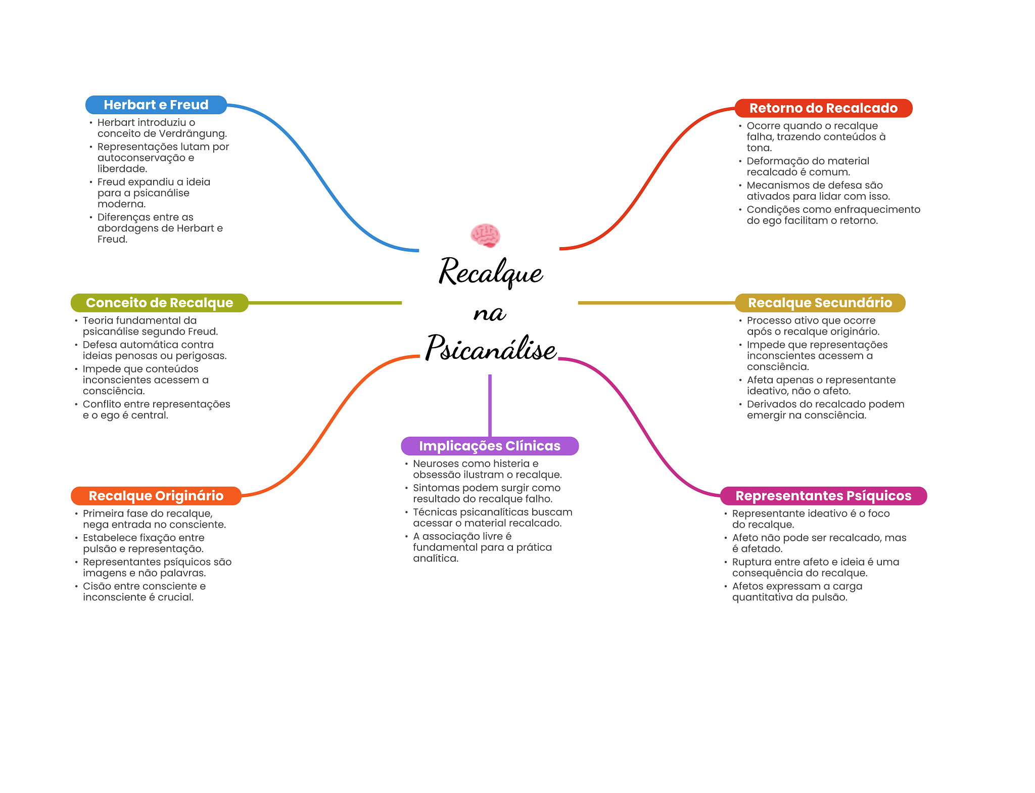 Herbart e Freud Retorno do Recalcado Herbart introduziu Ocorre quando recalque conceito de Verdrängung. falha, trazendo conteúdos à Representações lutam por tona. autoconservação e Deformação do material liberdade. recalcado é comum. Freud expandiu a ideia Mecanismos de defesa são para a psicanálise ativados para lidar com isso. moderna. Condições como enfraquecimento Diferenças entre as do ego facilitam retorno. abordagens de Herbart e Freud. Recalque Conceito de Recalque Recalque Secundário Teoria fundamental da na Processo ativo que ocorre psicanálise segundo Freud. após recalque originário. Defesa automática contra ideias penosas ou perigosas. Psicanálise Impede que representações inconscientes acessem a Impede que conteúdos consciência. inconscientes acessem a Afeta apenas representante consciência. ideativo, não O afeto. Conflito entre representações Derivados do recalcado podem e O ego é central. emergir na consciência. Implicações Clínicas Neuroses como histeria e obsessão ilustram recalque. Sintomas podem surgir como Recalque Originário resultado do recalque falho. Representantes Psíquicos Primeira fase do recalque, Técnicas psicanalíticas buscam Representante ideativo é foco nega entrada no consciente. acessar material recalcado. do recalque. Estabelece fixação entre A associação livre é Afeto não pode ser recalcado, mas pulsão e representação. fundamental para a prática é afetado. Representantes psíquicos são analítica. Ruptura entre afeto e ideia é uma imagens e não palavras. consequência do recalque. Cisão entre consciente e Afetos expressam a carga inconsciente é crucial. quantitativa da pulsão.
