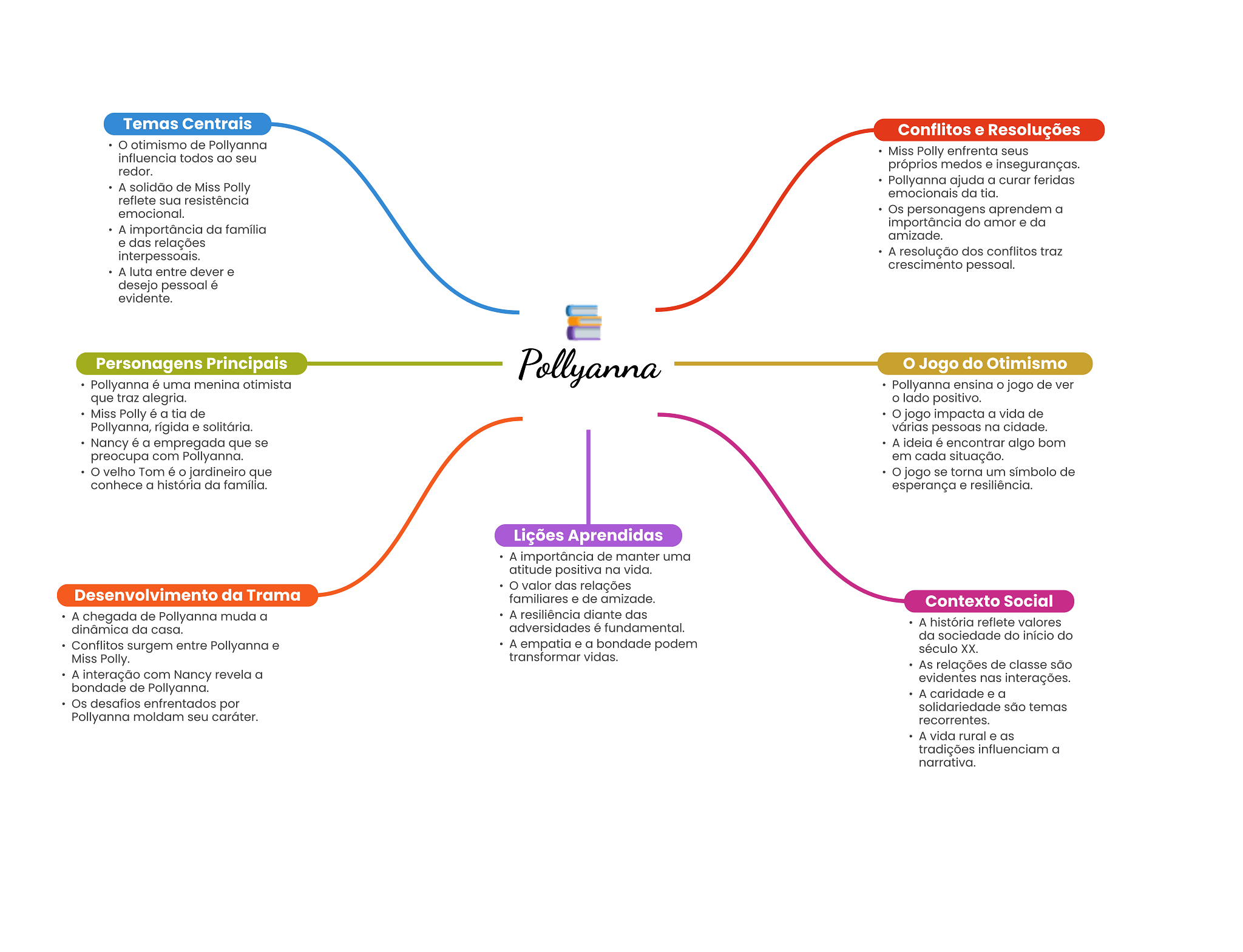 Temas Centrais Conflitos e Resoluções otimismo de Pollyanna influencia todos ao seu Miss Polly enfrenta seus redor. próprios medos e inseguranças. Pollyanna ajuda a curar feridas A solidão de Miss Polly emocionais da tia. reflete sua resistência emocional. Os personagens aprendem a importância do amor e da A importância da família amizade. e das relações interpessoais. A resolução dos conflitos traz A luta entre dever e crescimento pessoal. desejo pessoal é evidente. Personagens Principais Pollyanna Jogo do Otimismo Pollyanna é uma menina otimista Pollyanna ensina jogo de ver que traz alegria. O lado positivo. Miss Polly é a tia de O jogo impacta a vida de Pollyanna, rígida e solitária. várias pessoas na cidade. Nancy é a empregada que se A ideia é encontrar algo bom preocupa com Pollyanna. em cada situação. velho Tom é jardineiro que O jogo se torna um símbolo de conhece a história da família. esperança e resiliência. Lições Aprendidas A importância de manter uma atitude positiva na vida. valor das relações Desenvolvimento da Trama familiares e de amizade. Contexto Social A chegada de Pollyanna muda a A resiliência diante das dinâmica da casa. adversidades é fundamental. A história reflete valores da sociedade do início do Conflitos surgem entre Pollyanna e A empatia e a bondade podem século XX. Miss Polly. transformar vidas. As relações de classe são A interação com Nancy revela a evidentes nas interações. bondade de Pollyanna. A caridade e a Os desafios enfrentados por solidariedade são temas Pollyanna moldam seu caráter. recorrentes. A vida rural e as tradições influenciam a narrativa.