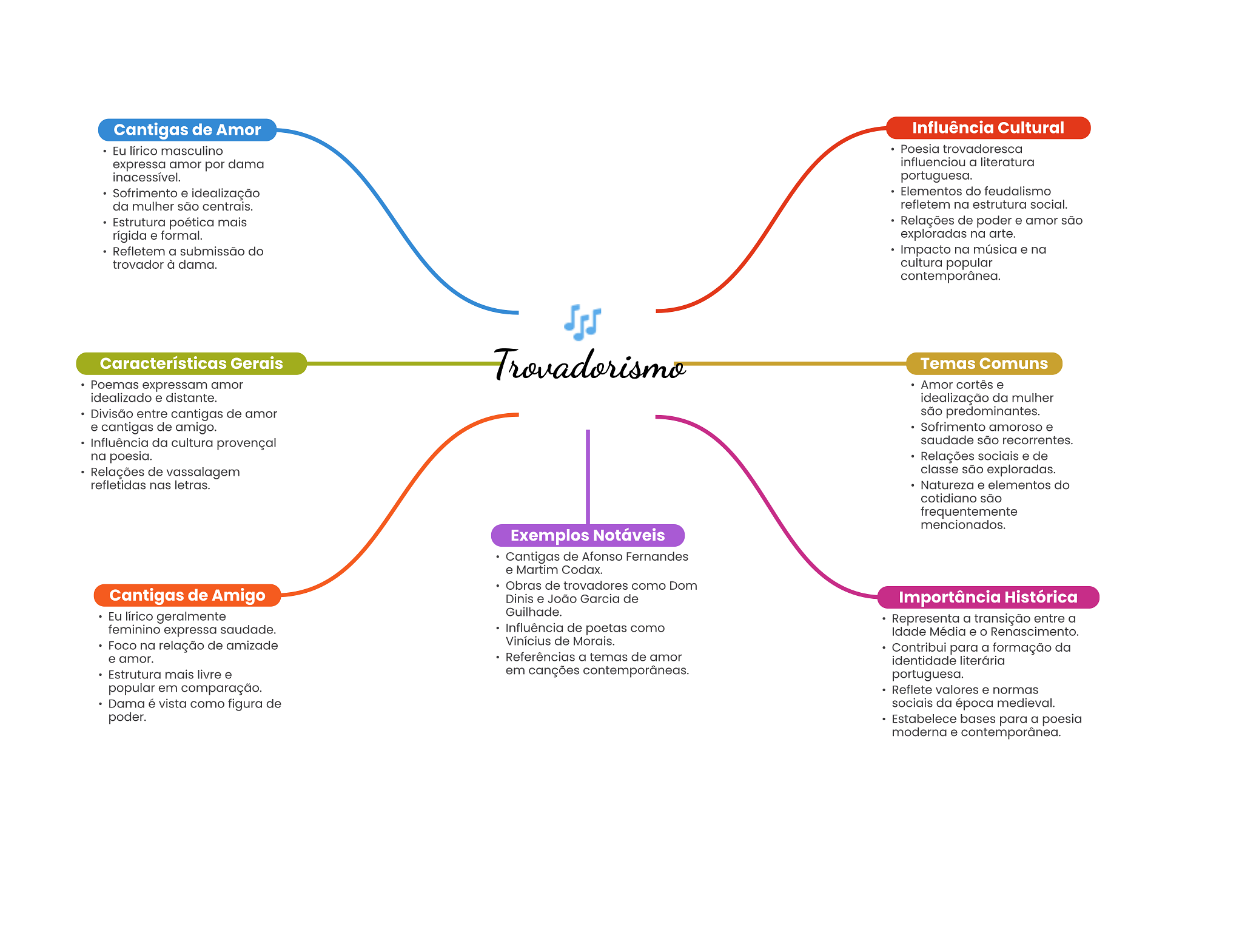 Cantigas de Amor Influência Cultural Eu lírico masculino Poesia trovadoresca expressa amor por dama influenciou a literatura inacessível. portuguesa. Sofrimento e idealização Elementos do feudalismo da mulher são centrais. refletem na estrutura social. Estrutura poética mais Relações de poder e amor são rígida e formal. exploradas na arte. Refletem a submissão do Impacto na música e na trovador à dama. cultura popular contemporânea. Características Gerais Trovadorismo Temas Comuns Poemas expressam amor Amor cortês e idealizado e distante. idealização da mulher Divisão entre cantigas de amor são predominantes. e cantigas de amigo. Sofrimento amoroso e Influência da cultura provençal saudade são recorrentes. na poesia. Relações sociais e de Relações de vassalagem classe são exploradas. refletidas nas letras. Natureza e elementos do cotidiano são frequentemente mencionados. Exemplos Notáveis Cantigas de Afonso Fernandes e Martim Codax. Obras de trovadores como Dom Cantigas de Amigo Dinis e João Garcia de Importância Histórica Eu lírico geralmente Guilhade. Representa a transição entre a feminino expressa saudade. Influência de poetas como Idade Média e Renascimento. Foco na relação de amizade Vinícius de Morais. Contribui para a formação da e amor. Referências a temas de amor identidade literária Estrutura mais livre e em canções contemporâneas. portuguesa. popular em comparação. Reflete valores e normas Dama é vista como figura de sociais da época medieval. poder. Estabelece bases para a poesia moderna e contemporânea.