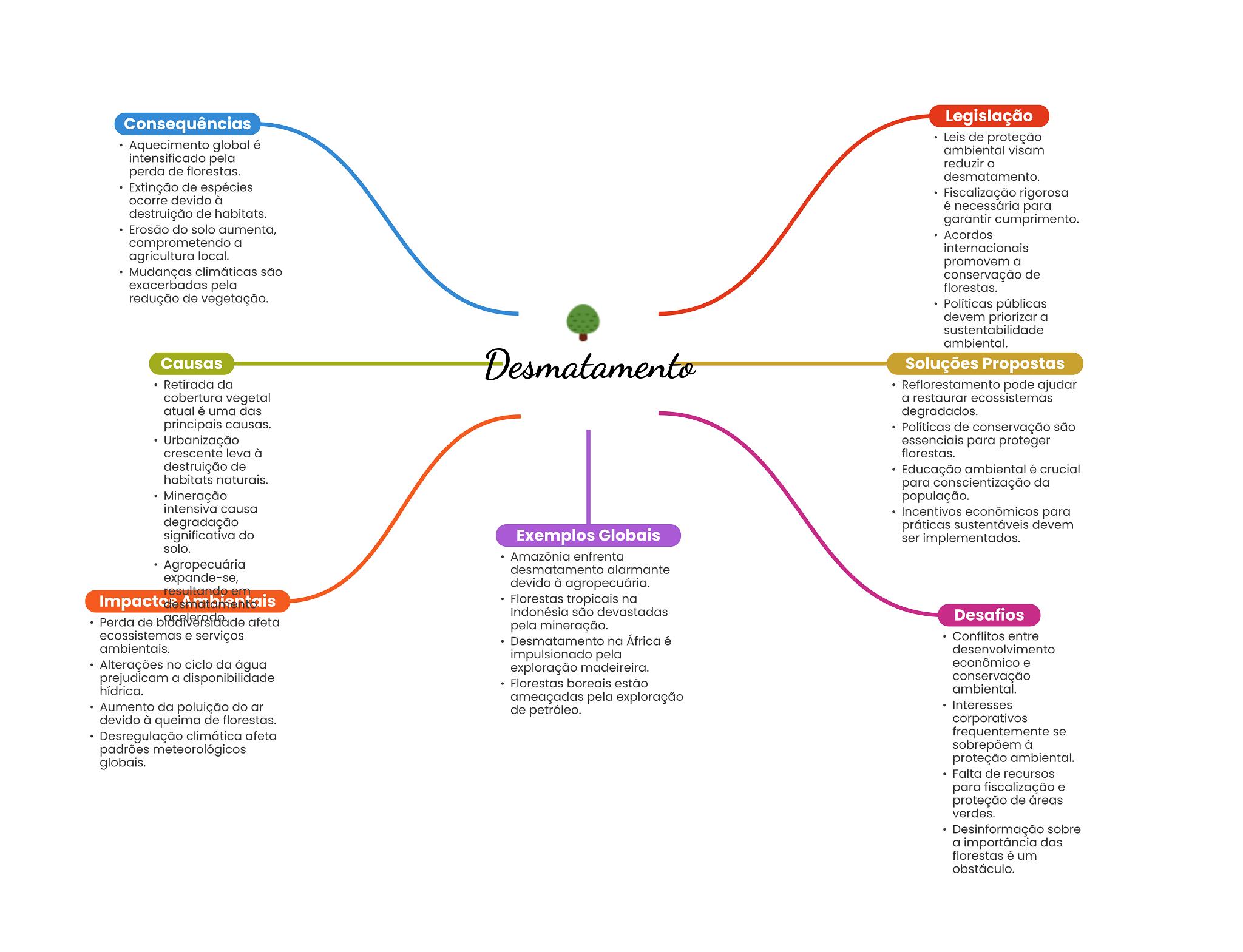 Consequências Legislação Leis de proteção Aquecimento global é ambiental visam intensificado pela reduzir perda de florestas. desmatamento. Extinção de espécies Fiscalização rigorosa ocorre devido à é necessária para destruição de habitats. garantir cumprimento. Erosão do solo aumenta, Acordos comprometendo a internacionais agricultura local. promovem a Mudanças climáticas são conservação de exacerbadas pela florestas. redução de vegetação. Políticas públicas devem priorizar a sustentabilidade ambiental. Causas Desmatamento Soluções Propostas Retirada da Reflorestamento pode ajudar cobertura vegetal a restaurar ecossistemas atual é uma das degradados. principais causas. Políticas de conservação são Urbanização essenciais para proteger crescente leva à florestas. destruição de Educação ambiental é crucial habitats naturais. para conscientização da Mineração população. intensiva causa Incentivos econômicos para degradação práticas sustentáveis devem significativa do Exemplos Globais ser implementados. solo. Amazônia enfrenta Agropecuária desmatamento alarmante expande-se, devido à agropecuária. resultando em Ambientais Florestas tropicais na Indonésia são devastadas Perda de afeta Desafios pela mineração. ecossistemas e serviços Desmatamento na África é Conflitos entre ambientais. impulsionado pela desenvolvimento Alterações no ciclo da água exploração madeireira. econômico e prejudicam a disponibilidade Florestas boreais estão conservação hídrica. ambiental. ameaçadas pela exploração Aumento da poluição do ar de petróleo. Interesses devido à queima de florestas. corporativos Desregulação climática afeta frequentemente se padrões meteorológicos sobrepõem à globais. proteção ambiental. Falta de recursos para fiscalização e proteção de áreas verdes. Desinformação sobre a importância das florestas é um obstáculo.