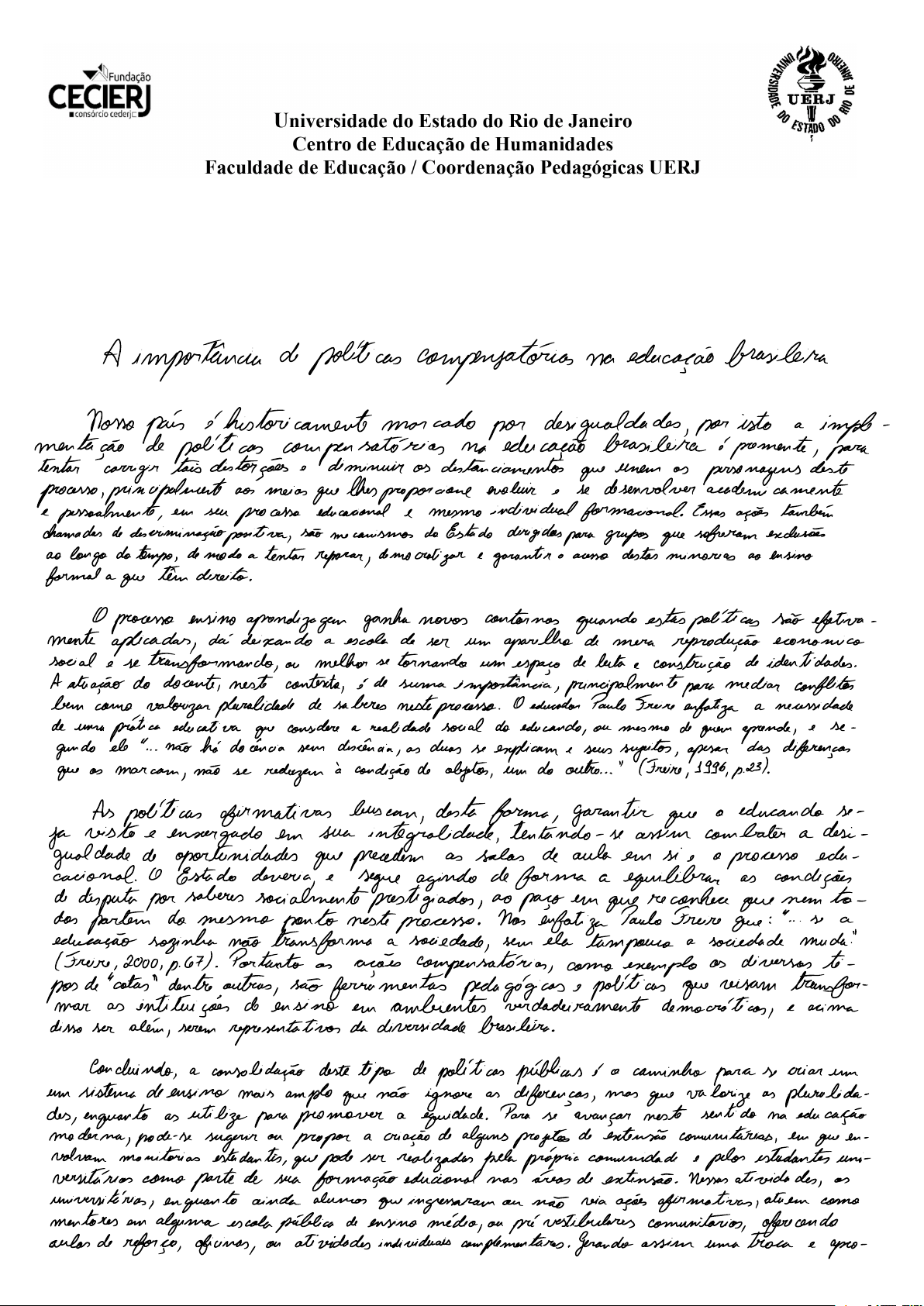 Primeira Avaliação a Distância Fundamentos da Educação III - (AD1) Curso: Licenciatura em Física Aluno: Rodrigo Pereira Bessa da Silva - Matrícula: 25214040097 Polo: Duque de Caxias - RJ Data: 08 / 03 / 2026 A i m p o r t â n c i a d e p o l í t i c a s c o m p e n s a t ó r i a s n a e d u c a ç ã o b r a s i l e i r a N o s s o p a í s é h i s t o r i c a m e n t e m a r c a d o p o r d e s i g u a l d a d e s , p o r i s t o a i m p l e m e n t a ç ã o d e p o l í t i c a s c o m p e n s a t ó r i a s n a e d u c a ç ã o b r a s i l e i r a é p r e m e n t e , p a r a t e n t a r c o r r i g i r t a i s d i s t o r ç õ e s e d i m i n u i r o s d i s t a n c i a m e n t o s q u e u n e m o s p e r s o n a g e n s d e s t e p r o c e s s o , p r i n c i p a l m e n t e a o s m e i o s q u e l h e s p r o p o r c i o n e e v o l u i r e s e d e s e n v o l v e r a c a d e m i c a m e n t e e p e s s o a l m e n t e , e m s e u p r o c e s s o e d u c a c i o n a l e m e s m o i n d i v i d u a l f o r m a c i o n a l . E s s a s a ç õ e s t a m b é m c h a m a d a s d e d i s c r i m i n a ç ã o p o s i t i v a , s ã o m e c a n i s m o s d o E s t a d o d i r i g i d e s p a r a g r u p o s q u e s o f r e r a m e x c l u s õ e s a o l o n g o d o t e m p o , d e m o d o a t e n t a r r e p a r a r , d e m o c r a t i z a r e g a r a n t i r o a c e s s o d e s t a s m i n o r i a s a o e n s i n o f o r m a l a q u e t ê m d i r e i t o . O p r o c e s s o e n s i n o a p r e n d i z a g e m g a n h a n o v o s c o n t o r n o s q u a n d o e s t a s p o l í t i c a s s ã o - e f e t i v a - m e n t e a p l i c a d a s , d á d e i x a n d o a e s c o l a d e s e r u m a p a r e l h o d e m e r a r e p r o d u ç ã o e c o n o m i c o s o c i a l e s e t r a n s f o r m a n d o , o u m e l h o r s e t o r n a n d o u m e s p a ç o d e l u t a e c o n s t r u ç ã o d e i d e n t i d a d e s . A a t u a ç ã o d o d o c e n t e , n e s t e c o n t e x t o , é d e s u m a i m p o r t â n c i a , p r i n c i p a l m e n t e p a r a m e d i a r c o n f l i t o s b e m c o m o v a l o r i z a r p l u r a l i d a d e d e s a b e r e s n e s t e p r o c e s s o . O e d u c a d o r P a u l o F r e i r e e n f a t i z a a n e c e s s i d a d e d e u m a p r á t i c a e d u c a t i v a q u e c o n s i d e r e a r e a l i d a d e s o c i a l d o e d u c a n d o , o u m e s m o d e q u e m a p r e n d e , e s e g u n d o e l e " . . . n ã o h á d o c ê n c i a s e m d i s c ê n c i a , a s d u a s s e e x p l i c a m e s e u s s u j e i t o s , a p e s a r d a s d i f e r e n ç a s q u e o s m a r c a m , n ã o s e r e d u z e m à c o n d i ç ã o d e o b j e t o s , u m d o o u t r o . . . " ( F r e i r e , 1 9 9 6 , p . 2 3 ) . A s p o l í t i c a s a f i r m a t i v a s b u s c a m , d e s t a f o r m a , g a r a n t i r q u e o e d u c a n d o s e - j a v i s t o e e n x e r g a d o e m s u a i n t e g r a l i d a d e , t e n t a n d o - s e a s s i m c o m b a t e r a d e s i - g u a l d a d e d e o p o r t u n i d a d e s q u e p r e c e d e m a s s a l a s d e a u l a e m s i e o p r o c e s s o e d u c a c i o n a l . O E s t a d o d e v e r i a , e s e g u e a g i n d o d e f o r m a a e q u i l i b r a r a s c o n d i ç õ e s d e d i s p u t a p o r s a b e r e s s o c i a l m e n t e p r e s t i g i a d o s , a o p a ç o e m q u e r e c o n h e c e q u e n e m t o d o s p a r t e m d o m e s m o p o n t o n e s t e p r o c e s s o . N o s e n f a t i z a P a u l o F r e i r e q u e : " . . . s e a e d u c a ç ã o s o z i n h a n ã o t r a n s f o r m a a s o c i e d a d e , s e m e l a t a m p o u c o a s o c i e d a d e m u d a ! ( F r e i r e , 2 0 0 0 , p . 6 7 ) . P o r t a n t o a s a ç õ e s c o m p e n s a t ó r i a s , c o m o e x e m p l o o s d i v e r s o s t e - p o s d e " c o t a s " d e n t r e o u t r a s , s ã o f e r r a m e n t a s p e d a g ó g i c a s e p o l í t i c a s q u e v i s a m t r a n s f o r m a r a s i n s t i t u i ç õ e s d e e n s i n o e m a m b i e n t e s v e r d a d e i r a m e n t e d e m o c r á t i c a s , e a c i m a d i s s o s e r a l é m , s e r e m r e p r e s e n t a t i v o s d a d i v e r s i d a d e b r a s i l e i r a . C o n c l u i n d o , a c o n s o l i d a ç ã o d e s t e t i p o d e p o l í t i c a s p ú b l i c a s é o c a m i n h o p a r a s e c r i a r u m u m s i s t e m a d e e n s i n o m a i s a m p l o q u e n ã o i g n o r e a s d i f e r e n ç a s , m a s q u e v a l o r i z e a s p l u r a l i d a d e s , e n q u a n t o a s u t i l i z e p a r a p r o m o v e r a e q u i d a d e . P a r a s e a v a n ç a r n e s t e s e n t i d o n a e d u c a ç ã o m o d e r n a , p o d e - s e s u g e r i r o u p r o p o r a c r i a ç ã o d e a l g u n s p r o j e t o s d e e x t e n s ã o c o m u n i t á r i a s , e m q u e e u - v o l v a m m o n i t ó r i a s e s t e s d e n t e s , q u e p o d e s e r r e a l i z a d a s p e l a p r ó p r i a c o m u n i d a d e e p e l o s e s t u d a n t e s u n i - v e r s i t á r i a s c o m o p a r t e d e s u a f o r m a ç ã o e d u c i o n a l n a s á r e a s d e e x t e n s ã o . N e s s a s a t i v i d a d e s , a s u n i v e r s i t á r i a s , e n q u a n t o a i n d a a l u m o s q u e i n g r e s s a r a m o u n ã o v i a a ç õ e s a f i r m a t i v a s , a t u e m c o m o m e n t o r e s e m a l g u m a e s c o l a p ú b l i c a d e e n s i n o m é d i o , o u p r é v e s t i b u l a r e s c o m u n i t á r i o s , o f e r e c e n d o a u l a s d e r e f o r ç o , o f i c i n a s , o u a t i v i d a d e s i n d i v i d u a i s c o m p l e m e n t a r e s . G e r a n d o a s s i m u m a t r o c a e a p r o - mimando o estudante das periferias aos ambientes acadêmicos, fortalecendo assim o sentimento de pertencimento e auxiliando a garantir que o acesso à educação de quali- dade seja 