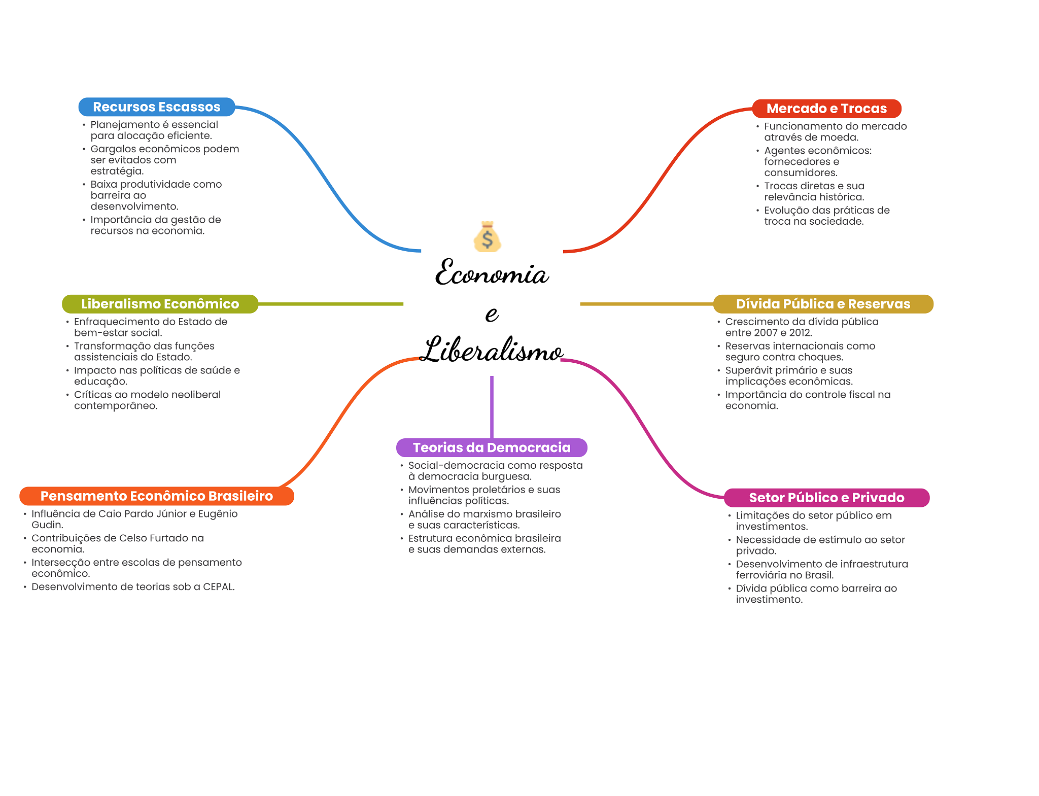 Recursos Escassos Mercado e Trocas Planejamento é essencial Funcionamento do mercado para alocação eficiente. através de moeda. Gargalos econômicos podem Agentes econômicos: ser evitados com fornecedores e estratégia. consumidores. Baixa produtividade como Trocas diretas e sua barreira ao relevância histórica. desenvolvimento. Evolução das práticas de Importância da gestão de troca na sociedade. recursos na economia. $ Economia Liberalismo Econômico Dívida Pública e Reservas e Enfraquecimento do Estado de Crescimento da dívida pública bem-estar social. entre 2007 e 2012. Transformação das funções assistenciais do Estado. Liberalismo Reservas internacionais como seguro contra choques. Impacto nas políticas de saúde e Superávit primário e suas educação. implicações econômicas. Críticas ao modelo neoliberal Importância do controle fiscal na contemporâneo. economia. Teorias da Democracia Social-democracia como resposta à democracia burguesa. Pensamento Econômico Brasileiro Movimentos proletários e suas influências políticas. Setor Público e Privado Influência de Caio Pardo Júnior e Eugênio Análise do marxismo brasileiro Limitações do setor público em Gudin. e suas características. investimentos. Contribuições de Celso Furtado na Estrutura econômica brasileira Necessidade de estímulo ao setor economia. e suas demandas externas. privado. Intersecção entre escolas de pensamento Desenvolvimento de infraestrutura econômico. ferroviária no Brasil. Desenvolvimento de teorias sob a CEPAL. Dívida pública como barreira ao investimento.