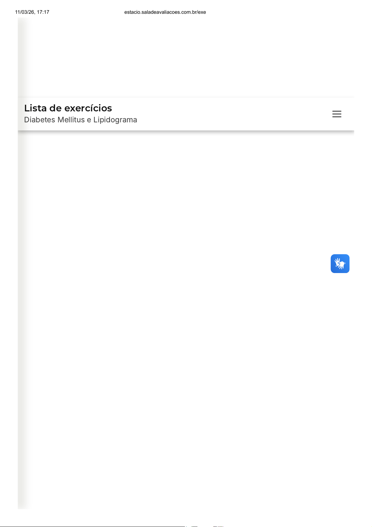 Lista de exercícios Diabetes Mellitus e Lipidograma 11/03/26, 17:17 estacio.saladeavaliacoes.com.br/exercicio/69b1cd7e518f1df35df6f9c0/gabarito/ https://estacio.saladeavaliacoes.com.br/exercicio/69b1cd7e518f1df35df6f9c0/gabarito/ 1/12 Você acertou 3 de 10 questões Verifique o seu desempenho e continue treinando! Você pode refazer o exercício quantas vezes quiser. Verificar Desempenho A B 1 Marcar para revisão "A gestação consiste em condição diabetogênica, uma vez que a placenta produz hormônios hiperglicemiantes e enzimas placentárias que degradam a insulina, com consequente aumento compensatório na produção de insulina e na resistência à insulina, podendo evoluir com disfunção das células β. O DMG trata-se de uma intolerância a carboidratos de gravidade variável, que se inicia durante a gestação atual, sem ter previamente preenchido os critérios diagnósticos de DM." (SBD. Diretrizes - Sociedade Brasileira de Diabetes: 2019-2020, Clannad Ed. Científica, 2019. Consultado eletronicamente em: 27 abr. 2021). Sobre o acompanhamento das gestantes e o diagnóstico do diabetes gestacional, analise as asserções a seguir: I. Durante a primeira rotina do pré-natal, um médico solicitou a dosagem de glicose em jejum e a TOTG após 2 horas com 75 gramas de dextrose. Com os resultados dos exames, glicemia em jejum ≥ 126 mg/dL e glicemia após ≥ 200mg/dL, ele classificou essa gestante como apresentando diabetes mellitus gestacional. Porque II. O diagnóstico de diabetes gestacional é considerado quando, durante o rastreamento na gestação, no mínimo um dos valores a seguir encontram-se alterados. São eles: glicemia em jejum ≥ 92 mg/dL; glicemia 1 hora após sobrecarga ≥ 180 mg/dL; e glicemia 2 horas após sobrecarga ≥ 153 mg/dL. A respeito dessas asserções, assinale a opção correta: As asserções I e II são proposições falsas. A asserção I é uma proposição verdadeira enquanto a II é falsa. 11/03/26, 17:17 estacio.saladeavaliacoes.com.br/exercicio/69b1cd7e518f1df35df6f9c0/gabarito/ https://estacio.saladeavaliacoes.com.br/exercicio/69b1cd7e518f1df35df6f9c0/gabarito/ 2/12 C D E A As asserções I e II são proposições verdadeiras e a II é uma justificativa da I. A asserção I é uma proposição falsa e a II é uma proposição verdadeira. As asserções I e II são proposições verdadeiras, mas a II não é uma justificativa da I. Resposta correta Parabéns, você selecionou a alternativa correta. Confira o gabarito comentado! Gabarito Comentado A alternativa correta é a D, que afirma que a asserção I é uma proposição falsa e a II é uma proposição verdadeira. Isso ocorre porque, na asserção I, a classificação da gestante como portadora de diabetes mellitus gestacional está incorreta, pois os valores apresentados estão acima dos limites estabelecidos para o diagnóstico de diabetes gestacional. Na asserção II, os valores apresentados para o diagnóstico de diabetes gestacional estão corretos, conforme as diretrizes da Sociedade Brasileira de Diabetes. 2 Marcar para revisão A respeito do diagnóstico do diabetes mellitus (DM), analise as afirmativas: I. O diagnóstico pode ser estabelecido por glicemia plasmática de jejum ≥ 126 mg/dL, em duas ocasiões diferentes. II. A hemoglobina glicada (HbA1c) ≥ 6,5% pode ser usada como critério diagnóstico de DM. III. A glicemia capilar obtida com glicosímetros é considerada método de referência para o diagnóstico de DM. IV. A glicemia ao acaso ≥ 200 mg/dL, na presença de sintomas clássicos, é critério diagnóstico de DM. Está(ão) correta(s): Apenas I e II 11/03/26, 17:17 estacio.saladeavaliacoes.com.br/exercicio/69b1cd7e518f1df35df6f9c0/gabarito/ https://estacio.saladeavaliacoes.com.br/exercicio/69b1cd7e518f1df35df6f9c0/gabarito/ 3/12 B C D E Apenas I, II e IV Apenas II e III Apenas III e IV Todas as afirmativas Resposta incorreta Opa! A alternativa correta é a letra B. Confira o gabarito comentado! Gabarito Comentado A glicemia de jejum ≥ 126 mg/dL, a HbA1c ≥ 6,5% e a glicemia ao acaso ≥ 200 mg/dL (em paciente sintomático) são critérios diagnósticos de DM. Já a glicemia capilar por glicosímetros não é considerada método de referência, sendo indicada apenas para monitoramento. 3 Marcar para revisão (Adaptado de Enade, Biomedicina, 2010) Os lipídios constituem um grupo de moléculas insolúveis em água e são transportados no plasma na forma de lipoproteínas. Essas são classificadas de acordo com o tamanho e a densidade em quilomícrons, lipoproteínas de densidade muito baixa (VLDL), lipoproteínas de baixa densidade (LDL) e lipoproteínas de densidade alta (HDL). Em relação às lipoproteínas, avalie as afirmativas que seguem. I. Os quilomícrons liberados pela mucosa intestinal são convertidos diretamente em VLDL no plasma sanguíneo. II. As lipoproteínas são constituídas por um núcleo de lipídios neutros envolvido por uma camada anfipática de apoproteínas, fosfolipídios e colesterol. III. A função das apoproteínas é fornecer sítios de reconhecimento para receptores nas superfícies celulares e serem ativadoras de enzimas envolvidas no metabolismo de lipoproteínas. IV. A LDL tem alta concentração de colesterol e ésteres de colesterol, liga-se na superfície da membrana celular através do reconhecimento da apoproteína B-100. V O colesterol captado da LDL pelas células age aumentando a síntese de colesterol e 11/03/26, 17:17 estacio.saladeavaliacoes.com.br/exercicio/69b1cd7e518f1df35df6f9c0/gabarito/ https://estacio.saladeavaliacoes.com.br/exercicio/69b1cd7e518f1df35df6f9c0/gabarito/ 4/12 A B C D E V. O colesterol captado da LDL pelas células age aumentando a síntese de colesterol e de receptores. O colesterol em excesso é convertido em éster de colesterol e armazenado. Está correto apenas o que se afirma em I, II e III I, II e IV I, IV e V II, III e IV III, IV e V Resposta incorreta Opa! A alternativa correta é 