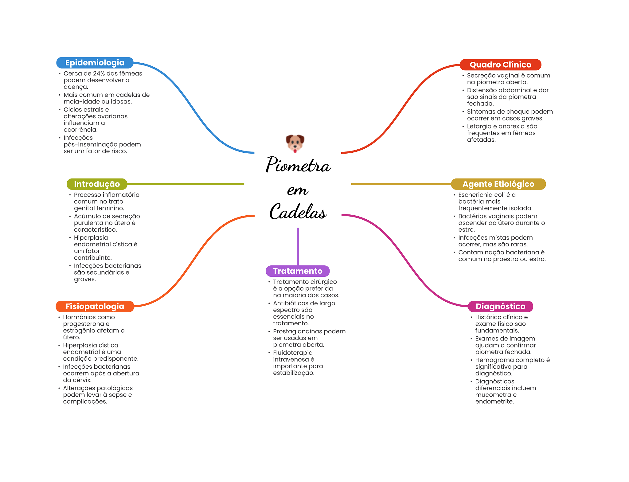 Epidemiologia Quadro Clínico Cerca de 24% das fêmeas Secreção vaginal é comum podem desenvolver a na piometra aberta. doença. Distensão abdominal e dor Mais comum em cadelas de são sinais da piometra meia-idade ou idosas. fechada. Ciclos estrais e Sintomas de choque podem alterações ovarianas ocorrer em casos graves. influenciam a ocorrência. Letargia e anorexia são frequentes em fêmeas Infecções afetadas. pós-inseminação podem ser um fator de risco. Piometra Introdução Agente Etiológico Processo inflamatório em Escherichia coli é a comum no trato bactéria mais genital feminino. Cadelas frequentemente isolada. Acúmulo de secreção Bactérias vaginais podem purulenta no útero é ascender ao útero durante característico. estro. Hiperplasia Infecções mistas podem endometrial cística é ocorrer, mas são raras. um fator Contaminação bacteriana é contribuinte. comum no proestro ou estro. Infecções bacterianas são secundárias e Tratamento graves. Tratamento cirúrgico é a opção preferida na maioria dos casos. Fisiopatologia Antibióticos de largo espectro são Diagnóstico Hormônios como essenciais no Histórico clínico e progesterona e tratamento. exame físico são estrogênio afetam Prostaglandinas podem fundamentais. útero. ser usadas em Exames de imagem Hiperplasia cística piometra aberta. ajudam a confirmar endometrial é uma Fluidoterapia piometra fechada. condição predisponente. intravenosa é Hemograma completo é Infecções bacterianas importante para significativo para ocorrem após a abertura estabilização. diagnóstico. da cérvix. Diagnósticos Alterações patológicas diferenciais incluem podem levar à sepse e mucometra e complicações. endometrite.