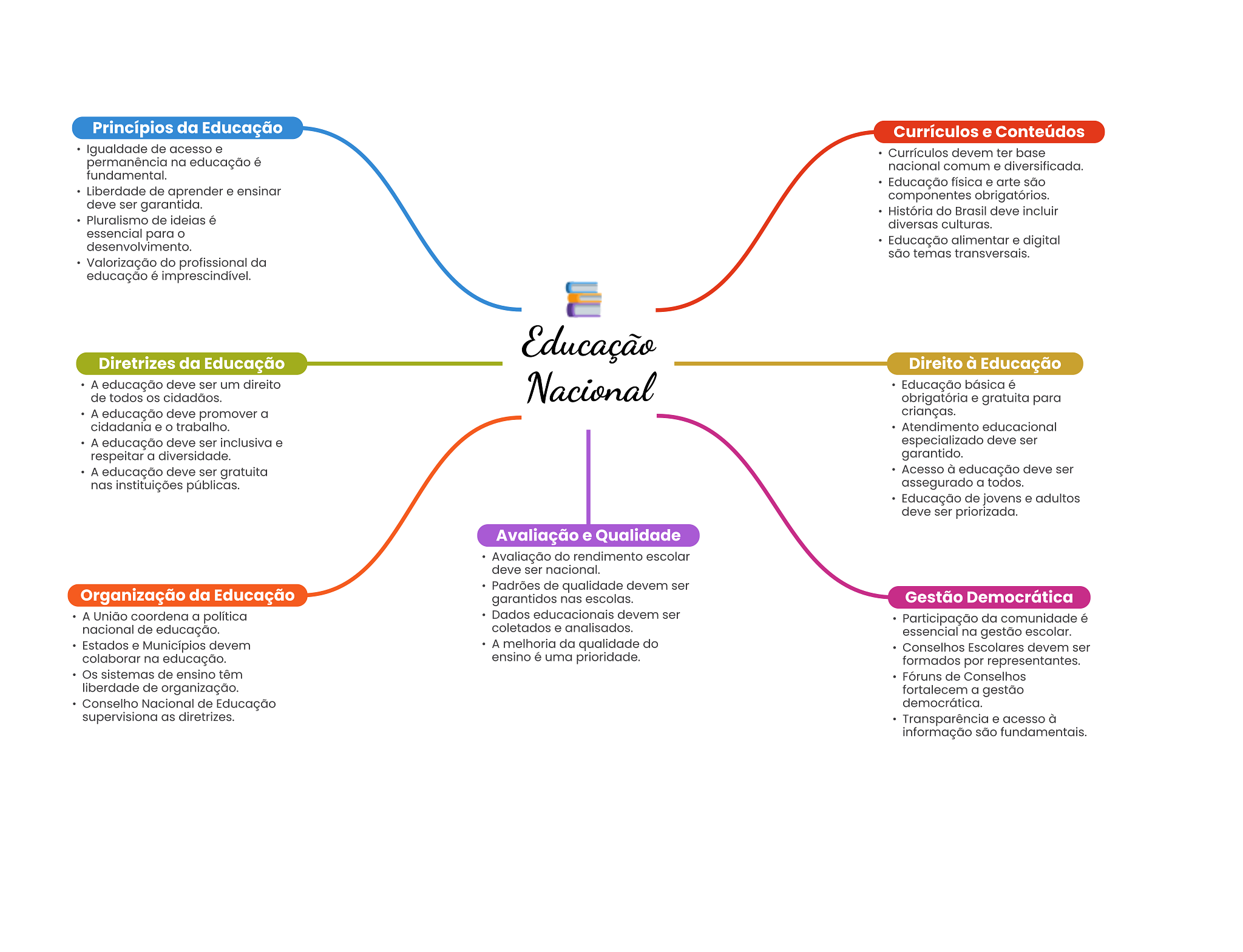 Princípios da Educação Currículos e Conteúdos Igualdade de acesso e Currículos devem ter base permanência na educação é nacional comum e diversificada. fundamental. Educação física e arte são Liberdade de aprender e ensinar componentes obrigatórios. deve ser garantida. História do Brasil deve incluir Pluralismo de ideias é diversas culturas. essencial para desenvolvimento. Educação alimentar e digital são temas transversais. Valorização do profissional da educação é imprescindível. Educação Diretrizes da Educação Direito à Educação A educação deve ser um direito Nacional Educação básica é de todos OS cidadãos. obrigatória e gratuita para A educação deve promover a crianças. cidadania e trabalho. Atendimento educacional A educação deve ser inclusiva e especializado deve ser respeitar a diversidade. garantido. A educação deve ser gratuita Acesso à educação deve ser nas instituições públicas. assegurado a todos. Educação de jovens e adultos deve ser priorizada. Avaliação e Qualidade Avaliação do rendimento escolar deve ser nacional. Padrões de qualidade devem ser Organização da Educação garantidos nas escolas. Gestão Democrática A União coordena a política Dados educacionais devem ser Participação da comunidade é nacional de educação. coletados e analisados. essencial na gestão escolar. Estados e Municípios devem A melhoria da qualidade do Conselhos Escolares devem ser colaborar na educação. ensino é uma prioridade. formados por representantes. Os sistemas de ensino têm Fóruns de Conselhos liberdade de organização. fortalecem a gestão Conselho Nacional de Educação democrática. supervisiona as diretrizes. Transparência e acesso à informação são fundamentais.