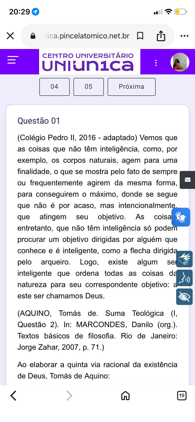 20:29 X nica.pincelatomico.net.br CENTRO UNIVERSITÁRIO ... 04 05 Próxima Questão 01 (Colégio Pedro II, 2016 adaptado) Vemos que as coisas que não têm inteligência, como, por exemplo, os corpos naturais, agem para uma finalidade, o que se mostra pelo fato de sempre ou frequentemente agirem da mesma forma, para conseguirem o máximo, donde se segue que não é por acaso, mas intencionalmente que atingem seu objetivo. As coisa entretanto, que não têm inteligência só podem procurar um objetivo dirigidas por alguém que conhece e é inteligente, como a flecha dirigida pelo arqueiro. Logo, existe algum inteligente que ordena todas as coisas da natureza para seu correspondente objetivo: a este ser chamamos Deus. (AQUINO, Tomás de. Suma Teológica (I, Questão 2). In: MARCONDES, Danilo (org.). Textos básicos de filosofia. Rio de Janeiro: Jorge Zahar, 2007, p. 71.) Ao elaborar a quinta via racional da existência de Deus, Tomás de Aquino: 19