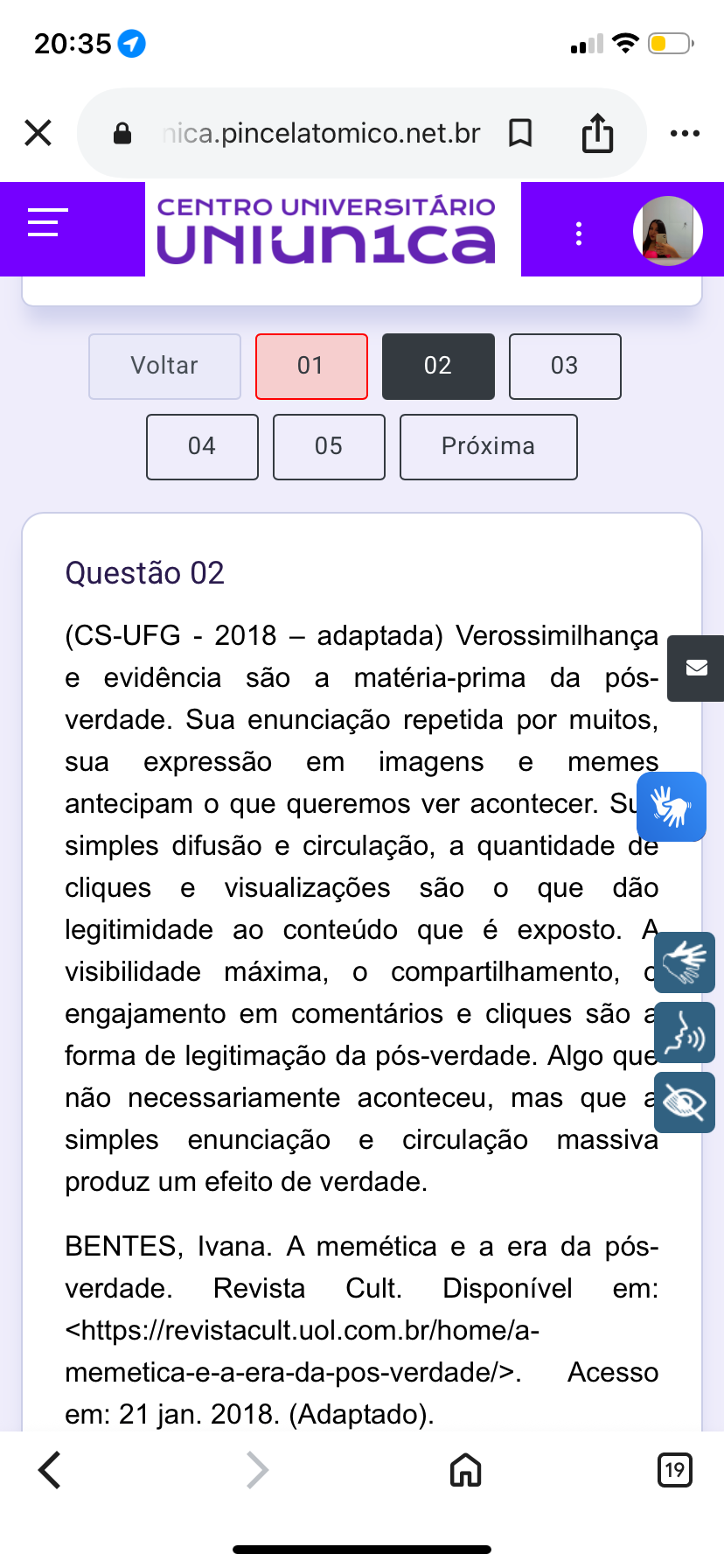 20:35 X CENTRO UNIVERSITÁRIO Voltar 01 02 03 04 05 Próxima Questão 02 (CS-UFG 2018 - adaptada) Verossimilhança e evidência são a matéria-prima da pós- verdade. Sua enunciação repetida por muitos, sua expressão em imagens e memes antecipam o que queremos ver acontecer. Su simples difusão e circulação, a quantidade de cliques e visualizações são o que dão legitimidade ao conteúdo que é exposto. visibilidade máxima, o compartilhamento, engajamento em comentários e cliques são a forma de legitimação da pós-verdade. Algo que não necessariamente aconteceu, mas que a simples enunciação e circulação massiva produz um efeito de verdade. BENTES, Ivana. A memética e a era da pós- verdade. Revista Cult. Disponível em: