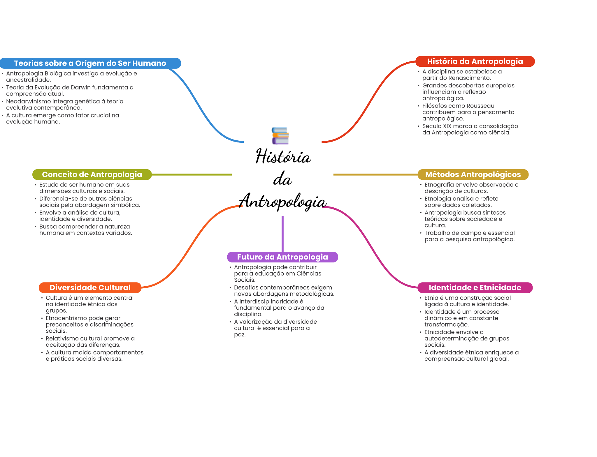 Teorias sobre a Origem do Ser Humano História da Antropologia Antropologia Biológica investiga a evolução e A disciplina se estabelece a ancestralidade. partir do Renascimento. Teoria da Evolução de Darwin fundamenta a Grandes descobertas europeias compreensão atual. influenciam a reflexão Neodarwinismo integra genética à teoria antropológica. evolutiva contemporânea. Filósofos como Rousseau A cultura emerge como fator crucial na contribuem para O pensamento evolução humana. antropológico. Século XIX marca a consolidação da Antropologia como ciência. História Conceito de Antropologia da Métodos Antropológicos Estudo do ser humano em suas Etnografia envolve observação e dimensões culturais e sociais. descrição de culturas. Diferencia-se de outras ciências Antropologia Etnologia analisa e reflete sociais pela abordagem simbólica. sobre dados coletados. Envolve a análise de cultura, Antropologia busca sínteses identidade e diversidade. teóricas sobre sociedade e Busca compreender a natureza cultura. humana em contextos variados. Trabalho de campo é essencial para a pesquisa antropológica. Futuro da Antropologia Antropologia pode contribuir para a educação em Ciências Sociais. Diversidade Cultural Desafios exigem Identidade e Etnicidade novas abordagens metodológicas. Cultura é um elemento central Etnia é uma construção social na identidade étnica dos A interdisciplinaridade é ligada à cultura e identidade. fundamental para O avanço da grupos. disciplina. Identidade é um processo Etnocentrismo pode gerar dinâmico e em constante preconceitos e discriminações A valorização da diversidade transformação. sociais. cultural é essencial para a Etnicidade envolve a paz. Relativismo cultural promove a autodeterminação de grupos aceitação das diferenças. sociais. A cultura molda comportamentos A diversidade étnica enriquece a e práticas sociais diversas. compreensão cultural global.
