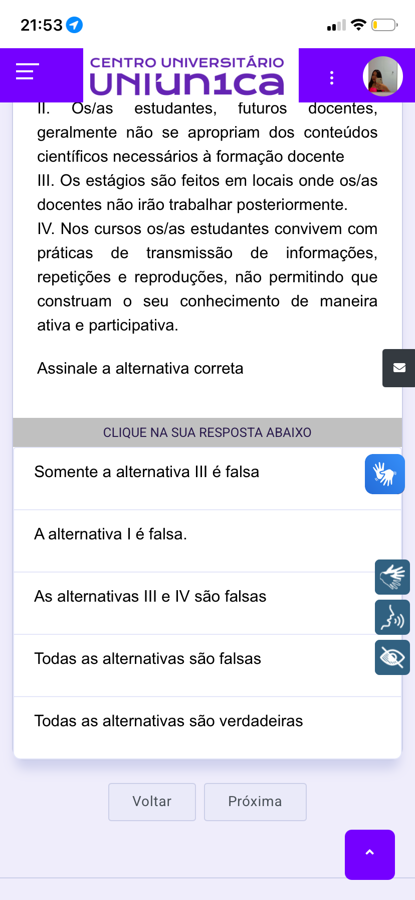 21:53 CENTRO UNIVERSITÁRIO II. Os/as estudantes, futuros docentes, geralmente não se apropriam dos conteúdos científicos necessários à formação docente III. Os estágios são feitos em locais onde os/as docentes não irão trabalhar posteriormente. IV. Nos cursos os/as estudantes convivem com práticas de transmissão de informações, repetições e reproduções, não permitindo que construam o seu conhecimento de maneira ativa e participativa. Assinale a alternativa correta CLIQUE NA SUA RESPOSTA ABAIXO Somente a alternativa III é falsa As alternativas III e IV são falsas Todas as alternativas são falsas Todas as alternativas são verdadeiras Voltar Próxima