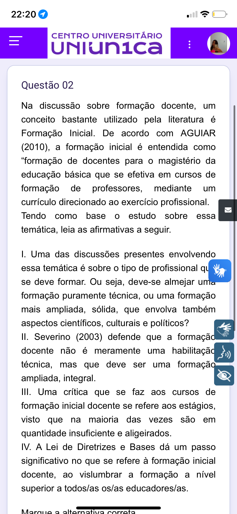 22:20 CENTRO UNIVERSITÁRIO Questão 02 Na discussão sobre formação docente, um conceito bastante utilizado pela literatura é Formação Inicial. De acordo com AGUIAR (2010), a formação inicial é entendida como "formação de docentes para o magistério da educação básica que se efetiva em cursos de formação de professores, mediante um currículo direcionado ao exercício profissional. Tendo como base o estudo sobre essa temática, leia as afirmativas a seguir. I. Uma das discussões presentes envolvendo essa temática é sobre o tipo de profissional qu se deve formar. Ou seja, deve-se almejar uma formação puramente técnica, ou uma formação mais ampliada, sólida, que envolva também aspectos científicos, culturais e políticos? II. Severino (2003) defende que a formação docente não é meramente uma habilitação técnica, mas que deve ser uma formação ampliada, integral. III. Uma crítica que se faz aos cursos de formação inicial docente se refere aos estágios, visto que na maioria das vezes são em quantidade insuficiente e aligeirados. IV. A Lei de Diretrizes e Bases dá um passo significativo no que se refere à formação inicial docente, ao vislumbrar a formação a nível superior a todos/as os/as educadores/as. Marque a alternativa correta