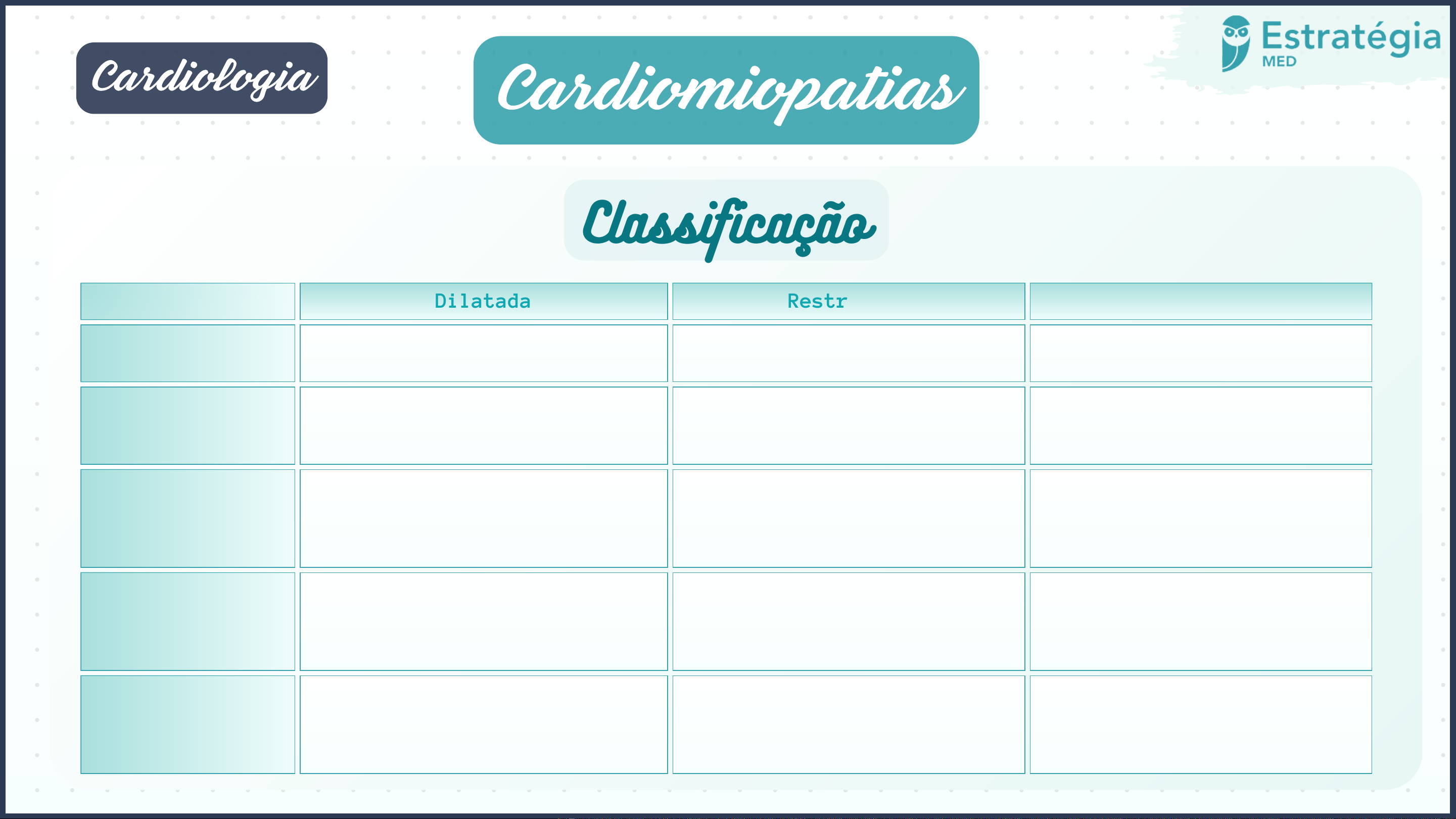 CardiomiopatiasCardiologia Classificação Dilatada Restritiva Hipertrófica Sintomas Insuficiência cardíaca, fadiga e astenia Insuficiência cardíaca, sintomas sistêmicos de acordo com a etiologia Dispneia, angina, síncope, palpitações Exame físico Aumento do ictus, B3, B4, sopro de insuficiência mitral Pode haver ou não desvio do ictus, B4, sinal de Kussmaul (aumento da turgência jugular com inspiração) Ictus propulsivo, pulso bisferiens, B4, sopro sistólico que aumenta com Valsalva Eletrocardiograma Taquicardia sinusal, fibrilação atrial, TV, anormalidades do segmento ST e onda T, bloqueios de ramo Baixa voltagem, bloqueios de ramo e bloqueios atrioventriculares Sobrecarga ventricular esquerda. Anormalidades do segmento ST e da onda T, ondas Q patológicas, fibrilação atrial e TV Ecocardiograma Dilatação e disfunção do VE Aumento da massa e espessura de parede do VE, dilatação biatrial, função sistólica normal e derrame pericárdico Hipertrofia septal assimétrica, obstrução da via de saída do VE, movimentação sistólica anterior da valva mitral, dilatação biatrial Principais etiologias Cardiomiopatia Chagásica, Takotsubo, Miocardite aguda, Cardiomiopatia periparto Amiloidose cardíaca, Endomiocardiofibrose Cardiomiopatia hipertrófica, Cardiomiopatia arritmogênica do ventrículo direito, Miocárdio não compactado Medicina livre, venda proibida, twitter @LivremedicinaMedicina livre, venda proibida, twitter @LivremedicinaMedicina livre, venda proibida, twitter @Livremedicina 1. Doença de Chagas Cardíaca Eletrocardiograma:Eletrocardiograma: Associação de BRD com BDASE:Associação de BRD com BDASE: Ecocardiograma:Ecocardiograma:Aspectos gerais:Aspectos gerais: Fase crônica Disfunção sistólica biventricular Acometimento inicial do VD Aneurismas em “dedo de luva” AGENTE ETIOLÓGICO: Protozoário Trypanosoma cruzi ÁREAS ENDÊMICAS: Triângulo mineiro, norte de Minas, sul da Bahia, Distrito Federal ou Goiás QUADRO CLÍNICO: Fase aguda: miocardite aguda Fase crônica: arritmias, distúrbios de condução, insuficiência cardíaca, eventos tromboembólicos e morte súbita DIAGNÓSTICO (FASE CRÔNICA): Duas sorologias com métodos diferentes Medicina livre, venda proibida, twitter @LivremedicinaMedicina livre, venda proibida, twitter @LivremedicinaMedicina livre, venda proibida, twitter @Livremedicina 2. Takotsubo / Cardiopatia induzida por estresse / Síndrome do coração partido Aspectos gerais:Aspectos gerais: VentriculografiaVentriculografia QUADRO CLÍNICO: O quadro clínico mais comum é igual ao de uma síndrome coronariana aguda, mas que não apresenta obstruções coronarianas. EPIDEMIOLOGIA: Mais comum em mulheres, no período pós- -menopausa, após estresse físico ou emocional. FISIOPATOLOGIA: O mecanismo da lesão é uma descarga catecolaminérgica. PROGNÓSITCO: O prognóstico, na maioria dos casos, é bom. Ocorre uma disfunção sistólica transitória dos segmentos medioapicais do VE, com hipercontratilidade compensatória dos segmentos basais. Com isso, à ventriculografia e ao ecocardiograma, vemos o chamado balonamento apical, que se assemelha ao jarro de pescar peixe japonês, chamado takotsubo. Medicina livre, venda proibida, twitter @LivremedicinaMedicina livre, venda proibida, twitter @LivremedicinaMedicina livre, venda proibida, twitter @Livremedicina 3. Cardiomiopatia Hipertrófica Fonocardiograma do sopro sistólico em formato de diamante, crescendo-decrescendo. EPIDEMIOLOGIA: principal causa de morte súbita em atletas e em