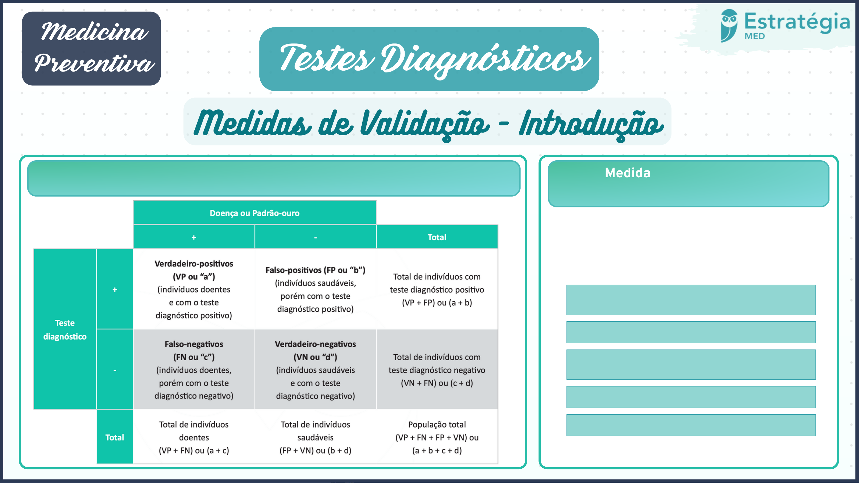 Formato da tabela de contingência 2 × 2 utilizada para testes diagnósticos Testes Diagnósticos Medicina Preventiva Medidas de Validação - Introdução Medidas de Validação dos Testes Diagnósticos Com base na tabela de contingência 2 x 2, é possível calcular as medidas de validação dos testes diagnósticos, a saber: SENSIBILIDADE ESPECIFICIDADE VALOR PREDITIVO POSITIVO (VPP) VALOR PREDITIVO NEGATIVO (VPN) ACURÁCIA Veja cada uma a seguir. Sensibilidade É a capacidade de um teste diagnóstico de reconhecer a doença quando ela realmente está presente; É a probabilidade de um indivíduo doente apresentar um resultado positivo no teste; Sabemos o estado de saúde (doente), mas não sabemos o resultado do teste (+ ou -). Especificidade É a capacidade de um teste diagnóstico de reconhecer a ausência da doença quando ela realmente não está presente; É a probabilidade de um indivíduo saudável apresentar um resultado negativo no teste; Sabemos o estado de saúde (saudável), mas não sabemos o resultado do teste (+ ou -). Valor Preditivo Positivo (VPP) É a probabilidade de um resultado positivo estar certo; Sabemos o resultado do teste (positivo), mas não sabemos o estado de saúde (será que realmente está doente?). Valor Preditivo Negativo (VPN) É a probabilidade de um resultado negativo esta estar certor certo; Sabemos o resultado do teste (negativo), mas não sabemos o estado de saúde (será que realmente está saudável?). Acurácia É a taxa de acerto do teste diagnóstico; Consideramos tanto os resultados positivos quanto os negativos, desde que estejam corretos. SENSIBILIDADE ESPECIFICIDADE PROBABILIDADE PRÉ-TESTE Fatores que influenciam nos valores preditivos No geral, a prevalência da doença pode ser considerada a probabilidade pré-teste, enquanto os valores preditivos podem ser considerados as probabilidades pós-teste. RV POSITIVA RV NEGATIVA DEFINIÇÃO Verdadeiro-positivoVerdadeiro-positivo Falso-positivoFalso-positivo Falso-negativoFalso-negativo Verdadeiro-negativoVerdadeiro-negativo As razões de verossimilhança NÃO sofrem influência da prevalência da doença. Razões de Verossimilhança ou de Probabilidades *A Razão de Verossimilhança (RV) objetiva é saber quantas vezes um determinado resultado é mais comum em indivíduos doentes do que em indivíduos saudáveis: * Testes com RV+ elevada ajudam a confirmar a doença se o resultado vier positivo. *Testes com RV- baixa ajudam a excluir a doença se o resultado vier negativo. Curva ROC É uma curva na qual confrontamos a sensibilidade do teste com o número de falso-positivos. Quanto mais próxima do canto superior esquerdo for a curva (isto á, mais longe da linha diagonal), maior será essa área e maior será a acurácia do teste. Escolhendo um Teste Diagnóstico TESTE SENSÍVEL TESTE ESPECÍFICO Captar o maior número possível de doentes; Alto valor preditivo NEGATIVO - EXCLUIR a doença; Usos: Rastreamento; Bancos de sangue; Epidemias. Alto valor preditivo POSITIVO; CONFIRMAR a doença; Usos: Testes confirmatórios em rastreamentos; Quando estamos diante de uma doença cujo tratamento é iatrogênico. DEFINIÇÃO PRINCÍPIOS DE UM PROGRAMA DE RASTREAMENTO CRITÉRIOS PARA SABER SE DEVEMOS RASTREAR UMA DETERMINADA DOENÇA (MINISTÉRIO DA SAÚDE) Princípios de Rastreamento Rastreamento é “a realização de testes ou exames diagnósticos em populações ou pessoas assintomáticas, com a finalidade de diagnóstico precoce (prevenção secundária) ou de identificação e controle de riscos, tendo como objetivo final reduzir a morbidade e mortalidade da doença, agravo ou risco rastreado" (GATES, 2001). Melhoras evidências científicas; Informações; Acesso; Agilidade. A doença deve representar um importante problema de saúde pública que seja relevante para a população, levando em consideração os conceitos de magnitude, transcendência e vulnerabilidade; A história natural da doença ou do problema clínico deve ser bem conhecida; O benefício da detecção e do tratamento precoce com o rastreamento deve ser maior do que se a condição fosse tratada no momento habitual de diagnóstico; Os exames que detectam a condição clínica no estágio assintomático devem estar disponíveis, aceitáveis e confiáveis; O custo do rastreamento e tratamento de uma condição clínica deve ser razoável e compatível com o orçamento destinado ao sistema de saúde como um todo; O rastreamento deve ser um processo contínuo e sistemático. 1. 2. 3. 4. 5. 6.