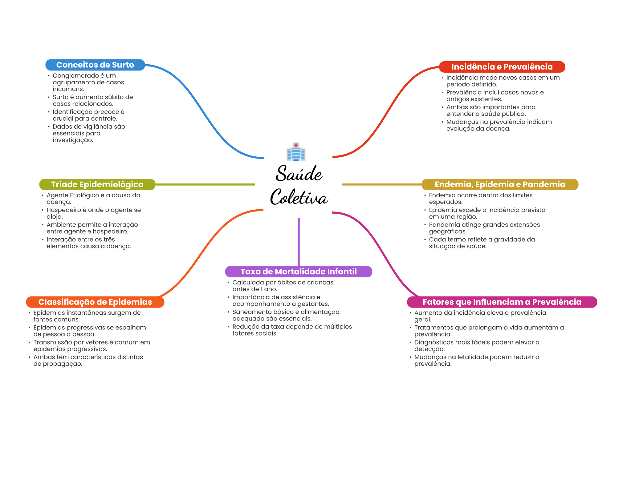 Conceitos de Surto Incidência e Prevalência Conglomerado é um Incidência mede novos casos em um agrupamento de casos período definido. incomuns. Prevalência inclui casos novos e Surto é aumento súbito de antigos existentes. casos relacionados. Ambas são importantes para Identificação precoce é entender a saúde pública. crucial para controle. Mudanças na prevalência indicam Dados de vigilância são evolução da doença. essenciais para investigação. Saúde Tríade Epidemiológica Endemia, Epidemia e Pandemia Agente Etiológico é a causa da Coletiva Endemia ocorre dentro dos limites doença. esperados. Hospedeiro é onde agente se Epidemia excede a incidência prevista aloja. em uma região. Ambiente permite a interação Pandemia atinge grandes extensões entre agente e hospedeiro. geográficas. Interação entre OS três Cada termo reflete a gravidade da elementos causa a doença. situação de saúde. Taxa de Mortalidade Infantil Calculada por óbitos de crianças antes de 1 ano. Importância de assistência e Classificação de Epidemias acompanhamento a gestantes. Fatores que Influenciam a Prevalência Epidemias instantâneas surgem de Saneamento básico e alimentação Aumento da incidência eleva a prevalência fontes comuns. adequada são essenciais. geral. Epidemias progressivas se espalham Redução da taxa depende de múltiplos Tratamentos que prolongam a vida aumentam a de pessoa a pessoa. fatores sociais. prevalência. Transmissão por vetores é comum em Diagnósticos mais fáceis podem elevar a epidemias progressivas. detecção. Ambas têm características distintas Mudanças na letalidade podem reduzir a de propagação. prevalência.