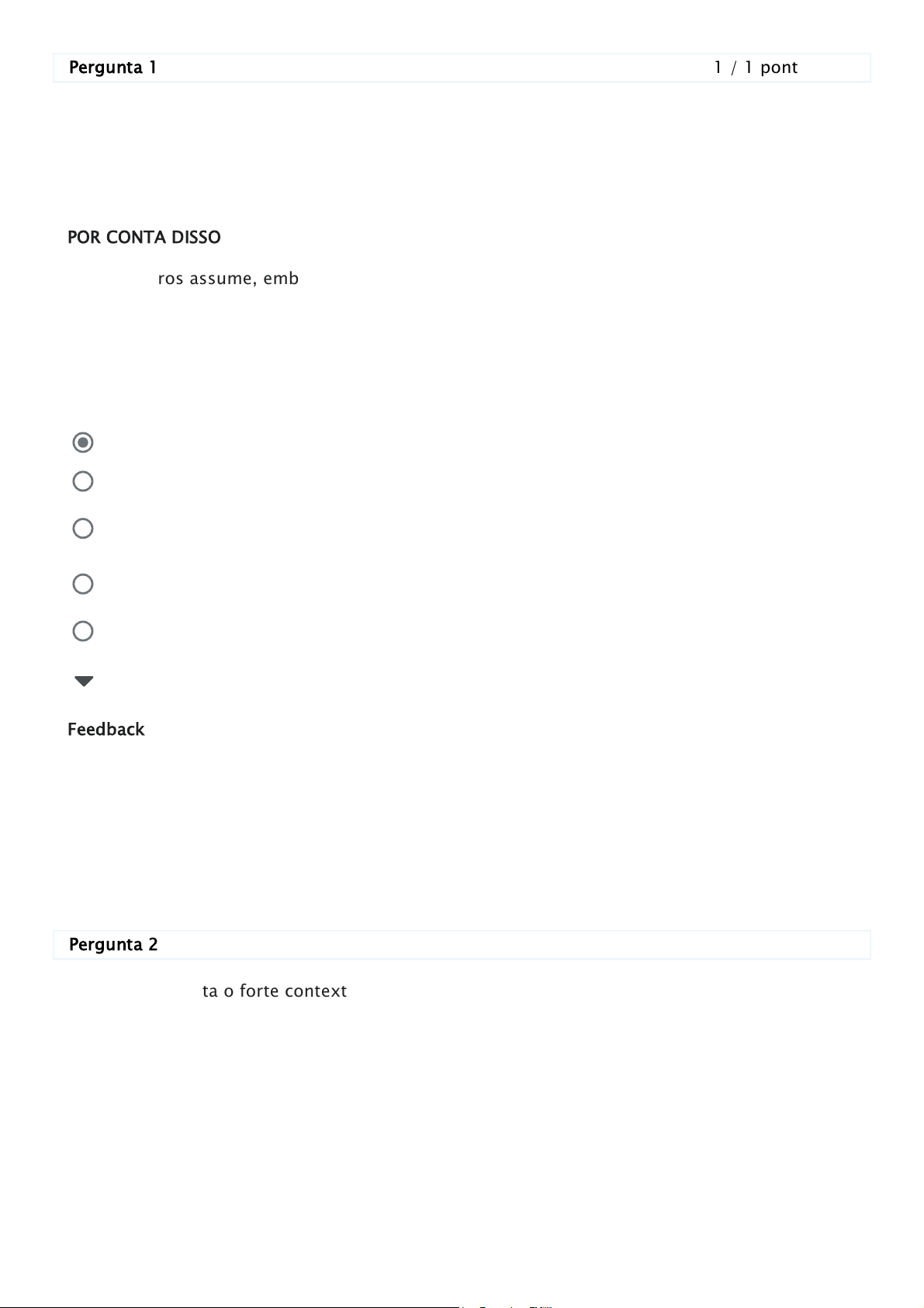 Pergunta 1 1 / 1 ponto Analise as asserções a seguir assim como a relação proposta entre elas: João Goulart foi eleito com a promessa de combater a corrupção, acabar com as dívidas e com a alta inflação. Entretanto, suas ações governamentais foram consideradas absurdas levando em conta o contexto internacional de guerras ideológicas. Nesse ínterim, ele escreve uma carta abdicando de sua função presidencial. POR CONTA DISSO Jânio Quadros assume, embora fosse considerado tendenciosamente próximo dos militares, de forma que a ala mais trabalhista e que ansiava pela reforma agrária e outros elementos impopulares planeja um golpe, vetado pelos próprios militares que em um contragolpe assumem o poder público. Assinale a alternativa que melhor as descrevem: Ocultar feedback da pergunta 1 Feedback Pergunta 2 1 / 1 ponto Levando em conta o forte contexto de insurreições sociais ao longo da Primeira República, analise as assertivas abaixo e depois escolha a alternativa que aponte os casos corretos: I. A revolta da vacina ocorreu no Rio de Janeiro, contra a obrigatoriedade vacinal da gripe espanhola, imposta pelo governo de Oswaldo Cruz; II. A revolta do contestado, majoritariamente liderada por fazendeiros, aconteceu nos estados de Santa Catarina e Rio Grande do Sul, exigindo o retorno do regime presidencialista; III. A revolta de Canudos, na Bahia, teve como líder Antônio Conselheiro, exigindo que Salvador voltasse a ser a capital brasileira; IV. O Tenentismo foi um movimento de revolta militar que exigia o voto secreto e um governo central. A primeira assertiva é uma declaração incorreta, tal como a segunda assertiva. A primeira assertiva está incorreta e unicamente a segunda está correta. As duas assertivas estão corretas e a segunda é de fato uma consequência direta da primeira. As duas assertivas estão corretas, entretanto a segunda não é uma consequência direta da primeira. A primeira assertiva está correta, entretanto a segunda está incorreta. Bela observação, hein? Parabéns! De fato, não foi João Goulart que assumiu a presidência contra a corrupção e depois abdicou de sua função, foi o próprio Jânio Quadros! O Jango em si assumiu depois, mas ele sofreu o golpe dos militares por conta de suas supostas associações com a ala esquerdista do país. Você foi detalhista! Ocultar feedback da pergunta 2 Feedback Pergunta 3 1 / 1 ponto No contexto da ditadura civil-militar, tivemos Carlos Lamarca como um dos principais personagens que deixaram um importante legado histórico ao longo do período. Assinale a alternativa que corresponde ao seu papel: Ocultar feedback da pergunta 3 Feedback Somente II, apenas. I e III, apenas. II e IV, apenas. Somente IV, apenas. I, II, III e IV. Belíssima observação! O Tenentismo de fato foi majoritariamente organizado por militares insatisfeitos com os rumos da Primeira República. Entretanto, a revolta de canudos visava o retorno da monarquia, tal como a revolta do contestado envolvia uma briga territorial. E a vacina contra a qual se revoltaram servia pra quê? Pra combater a varíola, não a gripe espanhola! Lamarca era o vice-presidente de Artur Costa e Silva, mas por ser um representante civil, não chegou efetivamente ao poder, e sim Emílio de Médici. Lamarca foi um dos principais artistas musicais que buscaram combater o regime militar, tal como Caetano Veloso, Chico Buarque e Gilberto Gil, enfrentando o exílio e a prisão. Lamarca foi o jovem morto no dia 28 de março de 1968, em uma manifestação em um restaurante no Rio de Janeiro, alvejado por militares que estavam no local. Lamarca foi um dos principais líderes das guerrilhas armadas contra a ditadura, movimento de invasão de bancos e sequestros para afetar o sistema de governo. Lamarca foi o grande responsável pela criação dos slogans de incentivo ao governo ditatorial: "Brasil, ame-o ou deixe-o" e "O país que olha para o futuro!". Parabéns, isso que é conhecimento! De fato, Carlos Lamarca foi um guerrilheiro, um dos atores nacionais que trouxe uma resposta mais violenta e brutal frente aos abusos autoritários do governo. Pergunta 4 1 / 1 ponto O primeiro mandato de Getúlio Vargas no Brasil durou aproximadamente 15 anos, sendo um período de repressão, polêmicas e interessantes avanços para a população brasileira. A respeito do período específico de seu governo conhecido como Estado Novo, analise as assertivas abaixo e assinale a alternativa que aponta as declarações corretas: I. Em 1937, Getúlio Vargas inaugura o regime ditatorial do Estado Novo, que dura até 1945. A principal justificativa para o golpe que permitiria a sua manutenção no poder era uma suposta ameaça comunista; II. Para controlar a imprensa, foi criado o DIP – Departamento de Imprensa e Propaganda, que regulava conteúdos e censurava o que considerava inadequado. Neste contexto, houve a retaliação de diversos indivíduos contrários ao governo; III. O Estado Novo se encerra em 1945 após forte pressão pela deposição de Vargas que, levando em conta essa situação, escreve uma carta em que apresenta seu forte legado para o Brasil, cometendo suicídio ao fim e gerando forte comoção em boa parte da sociedade brasileira. Ocultar feedback da pergunta 4 Feedback Pergunta 5 0 / 1 ponto Um dos presidentes menos polêmicos e mais conhecidos do período populista brasileiro foi Juscelino Kubitschek. A respeito de seu governo, assinale a alternativa correta: I e II, apenas. II, apenas. I, II e III. II e III, apenas. I e III, apenas. Parabéns, você acertou! Provavelmente sua escolha se deu pelo fato de que o suicídio de Vargas se deu unicamente em 1954, quando ele era de fato o presidente do Brasil, entretanto não mais no período do Estado Novo, e sim após ser eleito democraticamente ao fim de 1950. Ocultar feedback da pergunta 5 Feedback Uma das principais iniciativas de JK foi a construção de Brasília, arquitetada por Oscar Niemeyer e inaugurada