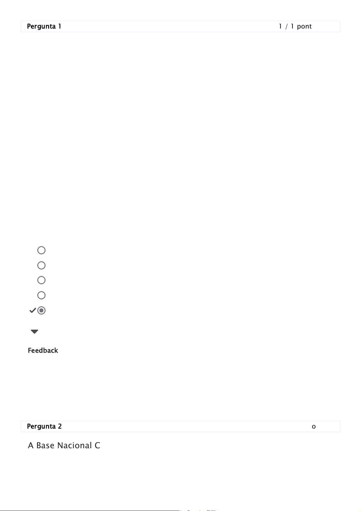 Pergunta 1 1 / 1 ponto Analise as afirmativas em relação à formação continuada: I.As formações são espaços de reciclagem e auxiliam somente no aumento da carga horária e ascensão na carreira do magistério. II.A formação continuada é um trabalho de interpretação da realidade escolar em todos os seus âmbitos. A escola é o contexto de trabalho do professor e nesse local ele expressa seus saberes e suas necessidades. III.As formações são específicas, ocorrendo no início de cada ano letivo e partindo da necessidade da direção da escola em conjunto com a comunidade escolar. IV.A formação continuada nada mais é do que um aprimoramento que resulta na melhoria do desempenho na atuação direta com o aluno em sala de aula. Com base nessas afirmativas, assinale a alternativa CORRETA. Ocultar feedback da pergunta 1 Feedback Pergunta 2 1 / 1 ponto A Base Nacional Comum Curricular apresenta 10 Competências Gerais, indicando como elas devem evoluir da Educação Infantil até o Ensino Médio. As Competências Gerais integram o capítulo introdutório da BNCC e foram definidas a partir dos direitos éticos estéticos e políticos Apenas as afirmativas I e II estão corretas. Apenas a afirmativa I está correta. Apenas as afirmativas I, III e IV estão corretas. Apenas a afirmativa IV está correta. Apenas a afirmativa II está correta. A formação continuada é trabalhada considerando a escola como o contexto de trabalho do docente, em que devem ser considerados todos seus âmbitos, saberes e necessidades. assegurados pelas Diretrizes Curriculares Nacionais e dos conhecimentos, habilidades, atitudes e valores essenciais para a vida no século XXI. Os princípios são: agir pessoal e coletivamente com autonomia; responsabilidade, flexibilidade, resiliência e determinação; além da tomada de decisões com base em princípios éticos, democráticos, inclusivos, sustentáveis e solidários. Estes princípios se referem às competências abaixo: Ocultar feedback da pergunta 2 Feedback Pergunta 3 1 / 1 ponto Analise os itens abaixo: I.Uma abordagem por resolução de problemas auxilia os alunos a darem sentido aos conceitos, às habilidades e às relações que são essenciais no currículo de matemática. II.A proposta de resolução de problemas deve restringir-se a uma simples instrução de como se resolve um problema ou determinados tipos de problemas. III.A resolução de problemas é uma forma de desenvolver o trabalho em classe. É uma perspectiva metodológica através da qual os alunos são envolvidos em “fazer matemática”, isto é, eles se tornam capazes de formular e resolver por si questões matemáticas e, pela possibilidade de questionar e levantar hipóteses, adquirem, relacionam e aplicam conceitos matemáticos. Conhecimento e Repertório Cultural. Autoconhecimento, Autocuidado e Argumentação. Responsabilidade e Cidadania. Empatia, Cooperação e Comunicação. Cultura Digital, Trabalho e Projeto de Vida. Considerando a BNCC 2017, única opção correta. Está(ão) CORRETO(S): Ocultar feedback da pergunta 3 Feedback Pergunta 4 1 / 1 ponto O letramento matemático, conforme consta na BNCC, é a capacidade individual de formular, empregar e interpretar a Matemática numa variedade de contextos, incluindo o raciocínio matemático, e utilizar conceitos, procedimentos, fatos e ferramentas matemáticas para descrever, explicar e predizer fenômenos. Para tanto, a identificação de códigos escritos, signos, placas de trânsito e sinalizações de supermercados são tarefas que começam na Educação Infantil e devem continuar no Ensino Fundamental em relação ao processo de letramento, cujas brincadeiras e jogos são vistos como mediações relativas a práticas sociais de atribuição de significados. Assinale a alternativa que corresponde ao letramento matemático em contexto de jogo: Somente o item I. Somente os itens I e III. Somente o item II. Somente os itens II e III. Somente o item III. Apenas o item II está incorreto. Durante um jogo, que exige registro de pontos de três jogadores em uma mesma tabela, perguntou-se como eles descobriram o vencedor. Alguns alunos produziram sentenças matemáticas para explicar os processos mentais utilizados para definir o vencedor, registrando sinais convencionais, marcas pessoais e frases. Em sala de aula, realizou-se a brincadeira da Feira do Produtor. Os alunos foram organizados em grupos de vendedores e compradores dos produtos da feira. Os alunos perceberam, com essa brincadeira, que a Matemática está presente em seu cotidiano, sendo também possível estimar suas capacidades de socialização e percepção do meio. A marcação do calendário constitui uma imagem visual, como um suporte externo, que auxilia na reflexão, pois a marcação de datas auxilia a compreensão da noção de tempo e da pontuação em jogos. Ocultar feedback da pergunta 4 Feedback Pergunta 5 1 / 1 ponto A formação continuada dos profissionais do magistério decorre de uma concepção de desenvolvimento profissional que leva em conta: Ocultar feedback da pergunta 5 Feedback A professora propõe um jogo, utilizando uma ficha com desenho de duas galinhas e seus respectivos ovos. Em duplas, os alunos marcam, conforme demonstrado pela professora, a quantidade de ovos que sua galinha botou. O docente demonstra uma atividade a ser realizada pelos alunos, em que devem separar determinada quantidade de palitos dentro de um envelope. A maioria dos alunos não conseguiu a mesma quantidade de palitos. Considerando a BNCC, área de matemática, está é a única alternativa correta. O lapso de tempo entre a formação inicial e a formação continuada. O tempo de atuação do profissional em escolas de educação básica. A necessidade de preparação do profissional para sua substituição pelas novas tecnologias. Os problemas e desafios da escola e do contexto em que está inserida. Os direitos e deveres do profissional do magistério p
