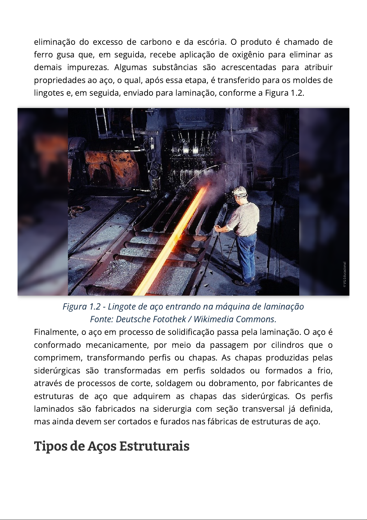 eliminação do excesso de carbono e da escória. O produto é chamado de ferro gusa que, em seguida, recebe aplicação de oxigênio para eliminar as demais impurezas. Algumas substâncias são acrescentadas para atribuir propriedades ao aço, o qual, após essa etapa, é transferido para os moldes de lingotes e, em seguida, enviado para laminação, conforme a Figura 1.2. Finalmente, o aço em processo de solidificação passa pela laminação. O aço é conformado mecanicamente, por meio da passagem por cilindros que o comprimem, transformando perfis ou chapas. As chapas produzidas pelas siderúrgicas são transformadas em perfis soldados ou formados a frio, através de processos de corte, soldagem ou dobramento, por fabricantes de estruturas de aço que adquirem as chapas das siderúrgicas. Os perfis laminados são fabricados na siderurgia com seção transversal já definida, mas ainda devem ser cortados e furados nas fábricas de estruturas de aço. Tipos de Aços Estruturais Figura 1.2 - Lingote de aço entrando na máquina de laminação Fonte: Deutsche Fotothek / Wikimedia Commons.