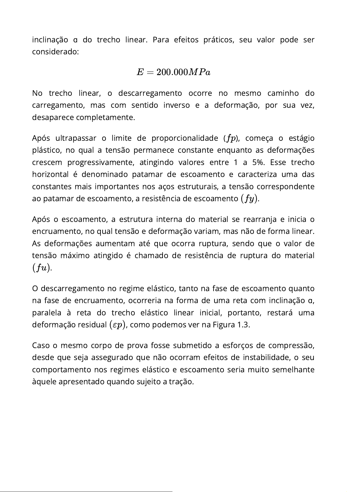 inclinação do trecho linear. Para efeitos práticos, seu valor pode ser considerado: No trecho linear, o descarregamento ocorre no mesmo caminho do carregamento, mas com sentido inverso e a deformação, por sua vez, desaparece completamente. Após ultrapassar o limite de proporcionalidade ( ), começa o estágio plástico, no qual a tensão permanece constante enquanto as deformações crescem progressivamente, atingindo valores entre 1 a 5%. Esse trecho horizontal é denominado patamar de escoamento e caracteriza uma das constantes mais importantes nos aços estruturais, a tensão correspondente ao patamar de escoamento, a resistência de escoamento . Após o escoamento, a estrutura interna do material se rearranja e inicia o encruamento, no qual tensão e deformação variam, mas não de forma linear. As deformações aumentam até que ocorra ruptura, sendo que o valor de tensão máximo atingido é chamado de resistência de ruptura do material . O descarregamento no regime elástico, tanto na fase de escoamento quanto na fase de encruamento, ocorreria na forma de uma reta com inclinação , paralela à reta do trecho elástico linear inicial, portanto, restará uma deformação residual , como podemos ver na Figura 1.3. Caso o mesmo corpo de prova fosse submetido a esforços de compressão, desde que seja assegurado que não ocorram efeitos de instabilidade, o seu comportamento nos regimes elástico e escoamento seria muito semelhante àquele apresentado quando sujeito a tração. ɑ E = 200.000MPa fp (fy) (fu) ɑ (εp)