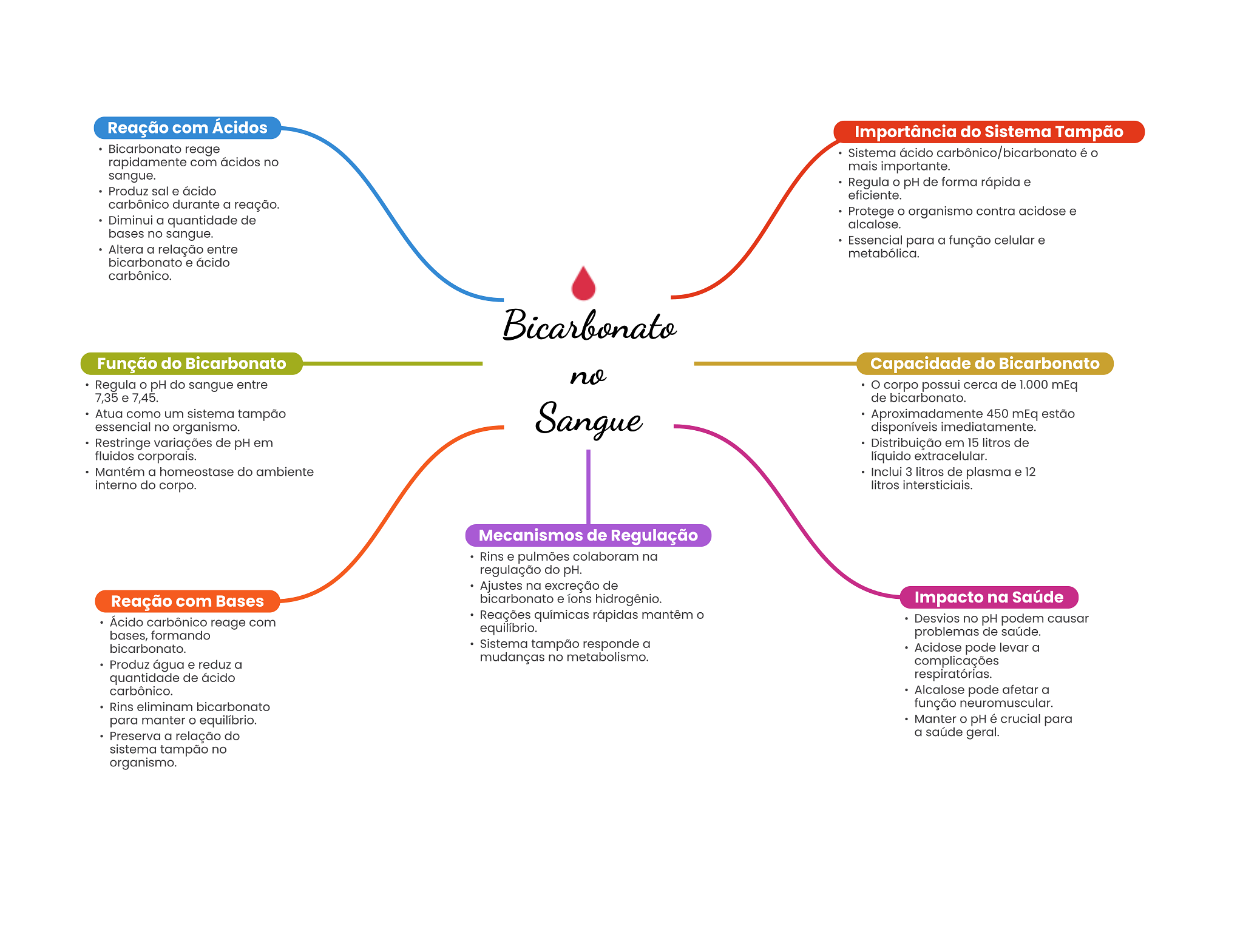 Reação com Ácidos Importância do Sistema Tampão Bicarbonato reage Sistema ácido é o rapidamente com ácidos no mais importante. sangue. Regula pH de forma rápida e Produz sal e ácido eficiente. carbônico durante a reação. Protege organismo contra acidose e Diminui a quantidade de alcalose. bases no sangue. Essencial para a função celular e Altera a relação entre metabólica. bicarbonato e ácido carbônico. Bicarbonato Função do Bicarbonato Capacidade do Bicarbonato no Regula pH do sangue entre corpo possui cerca de 1.000 mEq 7,35 e 7,45. de bicarbonato. Atua como um sistema tampão essencial no organismo. Sangue Aproximadamente 450 mEq estão disponíveis imediatamente. Restringe variações de pH em Distribuição em 15 litros de fluidos corporais. líquido extracelular. Mantém a homeostase do ambiente Inclui 3 litros de plasma e 12 interno do corpo. litros intersticiais. Mecanismos de Regulação Rins e pulmões colaboram na regulação do pH. Ajustes na excreção de Reação com Bases bicarbonato e hidrogênio. Impacto na Saúde Ácido carbônico reage com Reações químicas rápidas mantêm Desvios no pH podem causar equilíbrio. bases, formando problemas de saúde. bicarbonato. Sistema tampão responde a Acidose pode levar a mudanças no metabolismo. Produz água e reduz a complicações quantidade de ácido respiratórias. carbônico. Alcalose pode afetar a Rins eliminam bicarbonato função neuromuscular. para manter equilíbrio. Manter pH é crucial para Preserva a relação do a saúde geral. sistema tampão no organismo.